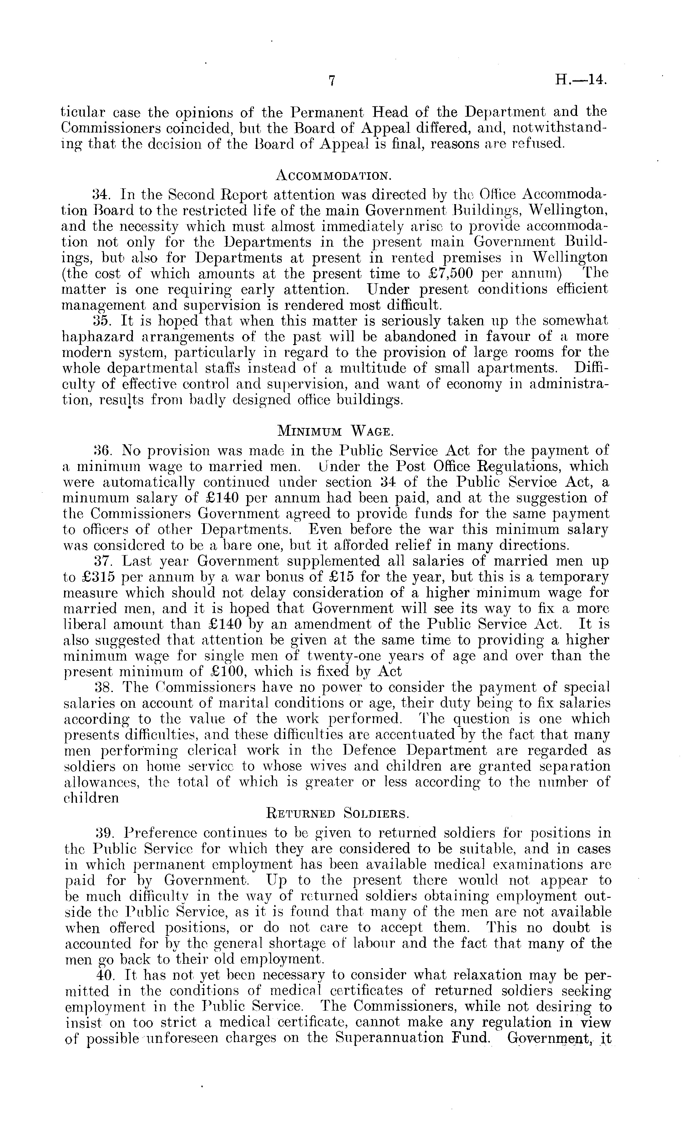 ticular case the opinions of the Permanent Head of the Department and the Commissioners coincided, but the Board of Appeal differed, and, notwithstanding that the decision of the Board of Appeal is final, reasons are refused. Accommodation. 34. In the Second Report attention was directed by the Office Accommodation Board to the restricted life of the main Government Buildings, Wellington, and the necessity which must, almost immediately arise to provide accommodation not only for the Departments in the present main Government Buildings, but also for Departments at present in rented premises in Wellington (the cost of which amounts at the present time to £7,500 per annum) The matter is one requiring early attention. Under present conditions efficient management and supervision is rendered most difficult. 35. It is hoped that when this matter is seriously taken up the somewhat haphazard arrangements of the past will be abandoned in favour of a more modern system, particularly in regard to the provision of large rooms for the whole departmental staffs instead of a multitude of small apartments. Difficulty of effective control and supervision, and want of economy in administration, results from badly designed office buildings. Minimum Wage. 36. No provision was made in the Public Service Act for the payment of a minimum wage to married men. Under the Post Office Regulations, which were automatically continued under section 34 of the Public Servioe Act, a minumum salary of £140 per annum had been paid, and at the suggestion of the Commissioners Government agreed to provide funds for the same payment to officers of other Departments. Even before the war this minimum salary was considered to be a bare one, but it afforded relief in many directions. 37. Last year Government supplemented all salaries of married men up to £315 per annum by a war bonus of £15 for the year, but this is a temporary measure which should not delay consideration of a higher minimum wage for married men, and it is hoped that Government will see its way to fix a more literal amount than £140 by an amendment of the Public Service Act. It is also suggested that attention be given at the same time to providing a higher minimum wage for single men of twenty-one years of age and over than the present minimum of £100, which is fixed by Act 38. The Commissioners have no power to consider the payment of special salaries on account of marital conditions or age, their duty being to fix salaries according to the value of the work performed. The question is one which presents difficulties, and these difficulties are accentuated by the fact that many men performing clerical work in the Defence Department are regarded as soldiers on home service to whose wives and children are granted separation allowances, the total of which is greater or less according to the number of children Returned Soldiers. 39. Preference continues to be given to returned soldiers for positions in the Public Service for which they are considered to be suitable, and in cases in which permanent employment has been available medical examinations are paid for by Government. Up to the present there would not appear to be much difficulty in the way of returned soldiers obtaining employment outside the Public Service, as it is found that many of the men are not available when offered positions, or do not care to accept them. This no doubt is accounted for by the general shortage of labour and the fact that many of the men go back to their old employment. 40. It has not yet been necessary to consider what relaxation may be permitted in the conditions of medical certificates of returned soldiers seeking employment in the Public Service. The Commissioners, while not desiring to insist on too strict a medical certificate, cannot make any regulation in view of possible unforeseen charges on the Superannuation Fund. Government, it