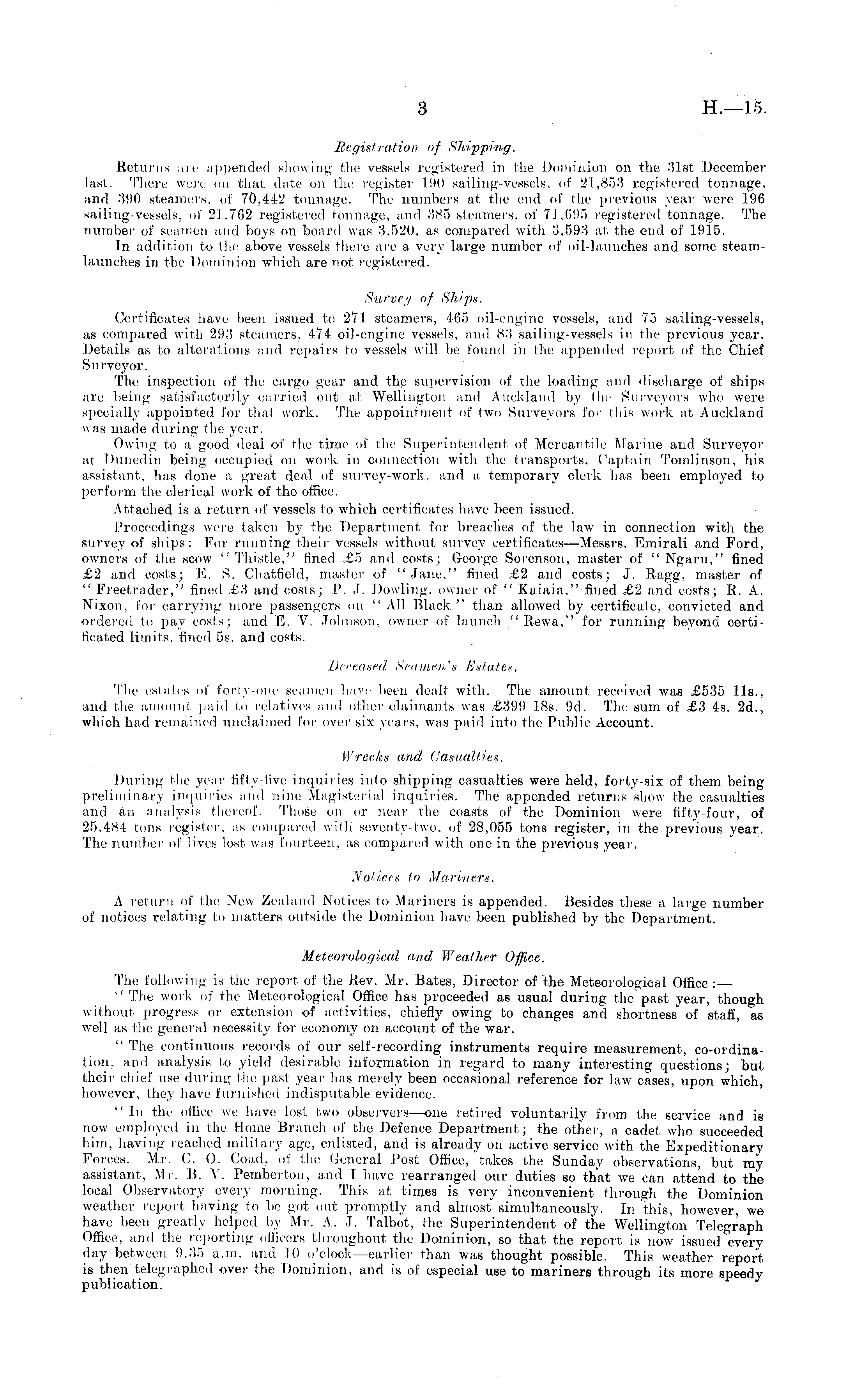 Registration of Shipping. Returns are appended showing the vessels registered in the Dominion on the 31st December last. There were on that date on the register 190 sailing-vessels, of 21,853 registered tonnage, and 390 steamers, of 70,442 tonnage. The numbers at the end of the previous year were 196 sailing-vessels, of 21,762 registered tonnage, and 385 steamers, of 71,695 registered tonnage. The number of seamen and boys on board was 3,520, as compared with 3,593 at the end of 1915. In addition to the above vessels there are a very large number of oil-launches and some steamlaunches in the Dominion which are not registered. Survey of Ships. Certificates have been issued to 271 steamers, 465 oil-engine vessels, and 75 sailing-vessels, as compared with 293 steamers, 474 oil-engine vessels, and 83 sailing-vessels in the previous year. Details as to alterations and repairs to vessels will be found in the appended report of the Chief Surveyor. The inspection of the cargo gear and the supervision of the loading and discharge of ships are being satisfactorily carried out at Wellington and Auckland by the Surveyors who were specially appointed for that work. The appointment of two Surveyors for this work at Auckland was made during the year. Owing to a good deal of the time of the Superintendent of Mercantile Marine and Surveyor at Dunedin being occupied on work in connection with the transports. Captain Tomlinson, his assistant, has done a great deal of survey-work, and a temporary clerk has been employed to perform the clerical work of tho office. Attached is a return of vessels to which certificates have been issued. Proceedings were taken by the Department for breaches of the law in connection with the survey of ships: For running their vessels without survey certificates—Messrs. Emirali and Ford, owners of the scow "Thistle," lined £5 and costs; George Sorenson, master of " Ngaru," fined £2 and costs; E. S. Chatfiehl, master of "Jane," lined £2 and costs; J. liagg, master of "Freetrader," fined £3 and costs; P. .!. Dowling, owner of " Kaiaia," fined £2 and costs; R. A. Nixon, for carrying more passengers on "All Black" than allowed by certificate, convicted and ordered to pay costs; and E. V. Johnson, owner of launch " Rewa," for running beyond certificated limits, fined ss. and costs. Deceased Seamen's listates. The estates of forty-one seamen have been dealt with. The amount received was £535 Us., and the amount paid to relatives and oilier claimants was £399 IBs. 9d. The sum of £3 4s. 2d., which had remained unclaimed for over six years, was paid into the Public Account. Wrecks and Casualties. During the year fifty-five inquiries into shipping casualties were held, forty-six of them being preliminary inquiries anil nine Magisterial inquiries. The appended returns show the casualties and an analysis thereof. Those on or near the coasts of the Dominion were fifty-four, of 25,484 tons register, as compared with seventy-two, of 28,055 tons register, in the previous year. The number of lives lost was fourteen, as compared with one in the previous year. Notices to Mariners. A return of the New Zealand Notices to Mariners is appended. Besides these a large number of notices relating to matters outside the Dominion have been published by the Department. Meteorological and, Weather Office. The following is the report of the Rev. Mr. Bates, Director of the Meteorological Office:— " The work of the Meteorological Office has proceeded as usual during the past year, though without progress or extension of activities, chiefly owing to changes and shortness of staff, as well as the general necessity for economy on account of the war. ' The continuous records of our self-recording instruments require measurement, co-ordina-tion, and analysis to yield desirable information in regard to many interesting questions; but their chief use during the past year has merely been occasional reference for law cases, upon which, however, they have furnished indisputable evidence. " In the office we have lost two observers—one retired voluntarily from the service and is now employed in the Home Branch of the Defence Department; the other, a cadet who succeeded him, having reached military age, enlisted, and is already on active service with the Expeditionary Forces. Mr. C. O. Coad, of the General Post Office, takes the Sunday observations, but my assistant, Mr. B. V. Peiriberton, and I have rearranged our duties so that we can attend to the local Observatory every morning. This at times is very inconvenient through the Dominion weather report having lo be got out promptly and almost simultaneously. In this, however, we have, been greatly helped by Mr. A. J. Talbot, the Superintendent of the Wellington Telegraph Office, and the reporting officers throughout the Dominion, so that the report is now issued'every day between 9.35 a.m. and 10 o'clock—earlier than was thought possible. This weather report is then telegraphed over Hie Dominion, and is of especial use to mariners through its more speedy publication.