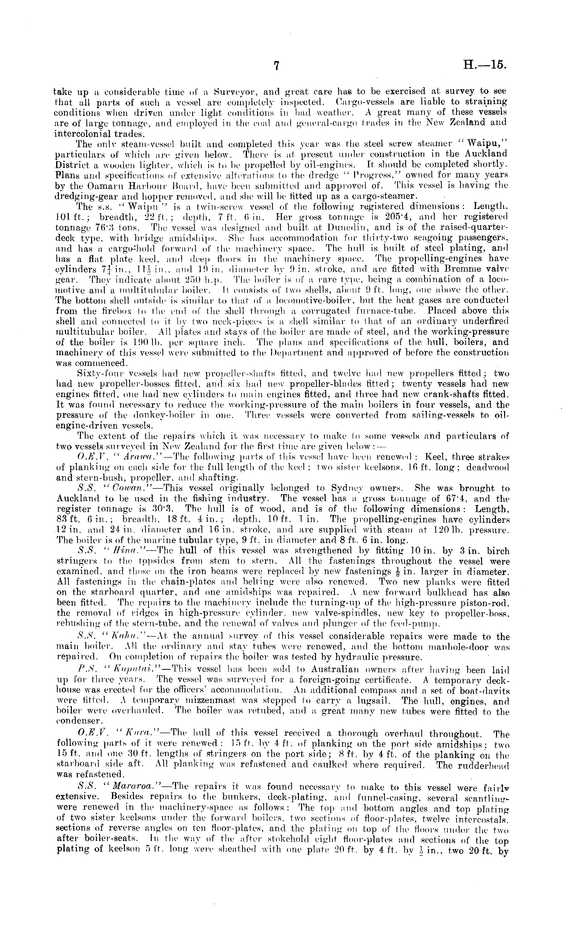 take up a considerable time of a Surveyor, and great care has to be exercised at, survey to see that all parts of such a vessel are completely inspected. Cargo-vessels are liable to straining conditions when driven under light conditions in bad weather. A great many of these vessels are of large tonnage, and employed in the coal and general-cargo trades in the New Zealand and intercolonial trades. The only steam-vessel built and completed this year was the steel screw steamer "Waipu," particulars of which are given below. There is al present under construction in the Auckland District a wooden lighter, wliich is to be propelled by oil-engines. It should be completed shortly. Plans and specifications of extensive alterations to tlie dredge " Progress," owned for many years by the Oamaru Harbour Board, have been submitted and approved of. This vessel is having the dredging-gear and hopper removed, and she will be fitted up as a cargo-steamer. The s.s. "Waipu" is a twin-screw vessel of the following registered, dimensions: Length, 101 ft.; breadth, 22: ft.; depth, 7 ft. 6 in. Her gross tonnage is 2054, and her registered tonnage 76-3 tons. The vessel was designed and built, at Dunedin, and is of the raised-quarter-deck type, with bridge amidships. Slu- has accommodation for thii-tv-lwo seagoing passengers, and has a cargo-hold forward of the machinery space. The hull is built of steel plating, and lias a flat plate keel, and deep Hocus in the machinery space. The propelling-engines have cylinders 7] in., 11J, in,, and 19 in. diameter by 9 in. stroke, and are fitted with Bremme valve gear. They indicate about 250 h.p. The boiler is of a rare type, being a combination of a locomotive and a multitubular boiler. It consists of two shells, about 9 ft. long, one above the other. The bottom shell outside- is similar to that of a locomotive-boiler, but the heat gases are conducted from the firebox to the end of the shell through a corrugated furnace-tube. Placed above this shell and connected lo it by two neck-pieces is a shell similar to (hat of an ordinary under-fired multitubular boiler. All plates and stays of the boiler are made of steel, and the working-pressure of the boiler is 190 Ib. per square inch. The plans and specifications of the hull, boilers, and machinery of this vessel were submitted to the Department and approved of before the construction was commenced. Sixty-four vessels had new propeller-shafts fitted, and twelve had new propellers fitted; two had new propeller-bosses fitted, and six had new propeller-blades fitted"; twenty vessels had new engines fitted, one had new cylinders to main engines fitted, and three had new crank-shafts fitted. It was found necessary to reduce the working-pressure of the main boilers in four vessels, and the pressure of the donkey-boiler in one. Three vessels were converted from sailing-vessels to oil-engine-driven vessels. The extent of the repairs which it was necessary to make to some vessels and particulars of two vessels surveyed in New Zealand for the first time are given below : — O.l'i.Y. " Araica." —The following parts of this vessel have been renewed : Keel, three strakes of planking on each side for the full length of the keel ; two sister keelsons, 16ft. long; deadwood and stern-bush, propeller, am! shafting. S.S. " Gowan." —This vessel originally belonged to Sydney owners. She was brought to Auckland to be used in the fishing industry. The vessel has a gross tonnage of 674, and the register tonnage is 303. The hull is of wood, and is of the following dimensions : Length. 83 ft. 6 in.; breadth, 18 ft. 4 in. ; depth, 10 ft. I in. The propelling-engines have cylinders .12 in. and 24 in. diameter and 16 in. stroke, and are supplied with steam at 120 Ib. pressure. The boiler is of the marine tubular type, 9 ft. in diameter and 8 ft. 6 in. long. S.S. " Hina." —The hull of this vessel was strengthened by fitting 10 in. by 3 in. birch stringers to the tppsides from stem to stern. All the fastenings throughout the vessel were examined, and those on the iron beams were replaced by new fastenings \'\ta. larger in diameter. All fastenings in the chain-plates and belling were also renewed. Two new planks were fitted on the starboard quarter, and one amidships was repaired. A new forward bulkhead has also been fitted. The repairs to the machinery include the turning-up of the high-pressure piston-rod, the removal of ridges in high-pressure cylinder, new valve-spindles, new key to propeller-boss, rebushing of the stern-tube, and the renewal of valves and plunger of the feed-pump. S.S. " Kahu." —At the annual survey of this vessel considerable repairs were made to the main boiler. All the ordinary and stay tubes were renewed, and the bottom manhole-door was repaired. On completion of repairs the boiler was tested by hydraulic pressure. I.S. " Koputai." —This vessel has been sold to Australian owners after having been laid up for three years. The vessel was surveyed for a foreign-going certificate. A temporary deck house was erected for the officers' accommodation. An additional compass and a set of boat-davits were fitted. A temporary mizzenmasl was stepped io carry a lugsail. The hull, engines, and boiler were overhauled. The boiler was retubed, and a. great many new tubes were fitted to the condenser. O.E.V. " Kura." —The hull of this vessel received a thorough overhaul throughout. The following parts of it were renewed: 15 fl. by 4 ft. of planking on the port side amidships; two 15 ft. and one 30 ft. lengths of stringers on the port side; 8 ft. by 4 ft. of the planking on the starboard side aft. All planking was refastcned and caulked where required. The rudderhead was refastened. S.S. " Mararoa." —The repairs it was found necessary- to make to this vessel were fairl-o-extensive. Besides repairs to the bunkers, deck-plating, and funnel-easing, several seantlimrwere renewed in the machinery-space as follows: The top and bottom angles