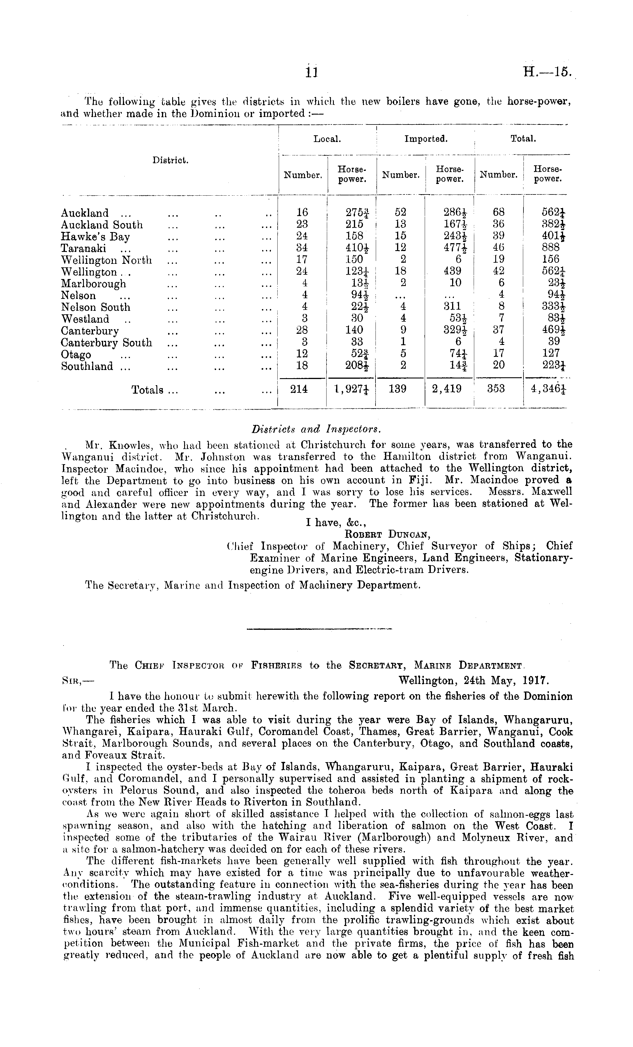 The Chief Inspector of Fisheries to the Secretary, Marine Department Sir,— Wellington, 24th May, 1917. I have the honour to submit herewith the following report on the fisheries of the Dominion for the year ended the 31st March. The fisheries which I was able to visit during the year were Bay of Islands, Whangaruru, Whangarei, Kaipara, Hauraki Gulf, Coromandel Coast, Thames, Great Barrier, Wanganui, Cook Strait, Marlborough Sounds, and several places on the Canterbury, Otago, and Southland coasts, and Foveaux Strait. I inspected the oyster-beds at Bay of Islands. Whangaruru, Kaipara, Great Barrier, Hauraki Gulf, and Coromandel, and I personally supervised and assisted in planting a shipment of rockoysters in Pelorus Sound, and also inspected the toheroa beds north of Kaipara and along the coast from the New River Heads to Riverton in Southland. As we were again short of skilled assistance 1 helped with the collection of salmon-eggs last spawning season, and also with the hatching and liberation of salmon on the West Coast. I inspected some of the tributaries of the Wairau River (Marlborough) and Molyneux River, and a site for a salmon-hatchery was decided on for each of these rivers. The different fish-markets have been generally well supplied with fish throughout the year. Any scarcity which may have existed for a time was principally due to unfavourable weatherconditions. The outstanding feature in connection with the sea-fisheries during the year has been the extension of the steam-trawling industry at, Auckland. Five well-equipped vessels are now trawling from that port, and immense quantities, including a splendid variety of the best market fishes, have been brought in almost daily from the prolific trawling-grounds which exist about, two hours' steam from Auckland. With the very large quantities brought, in, and the keen competition between the Municipal Fish-market and the private firms, the price of fish has been greatly reduced, and the people of Auckland are now able to get a plentiful supply of fresh fish