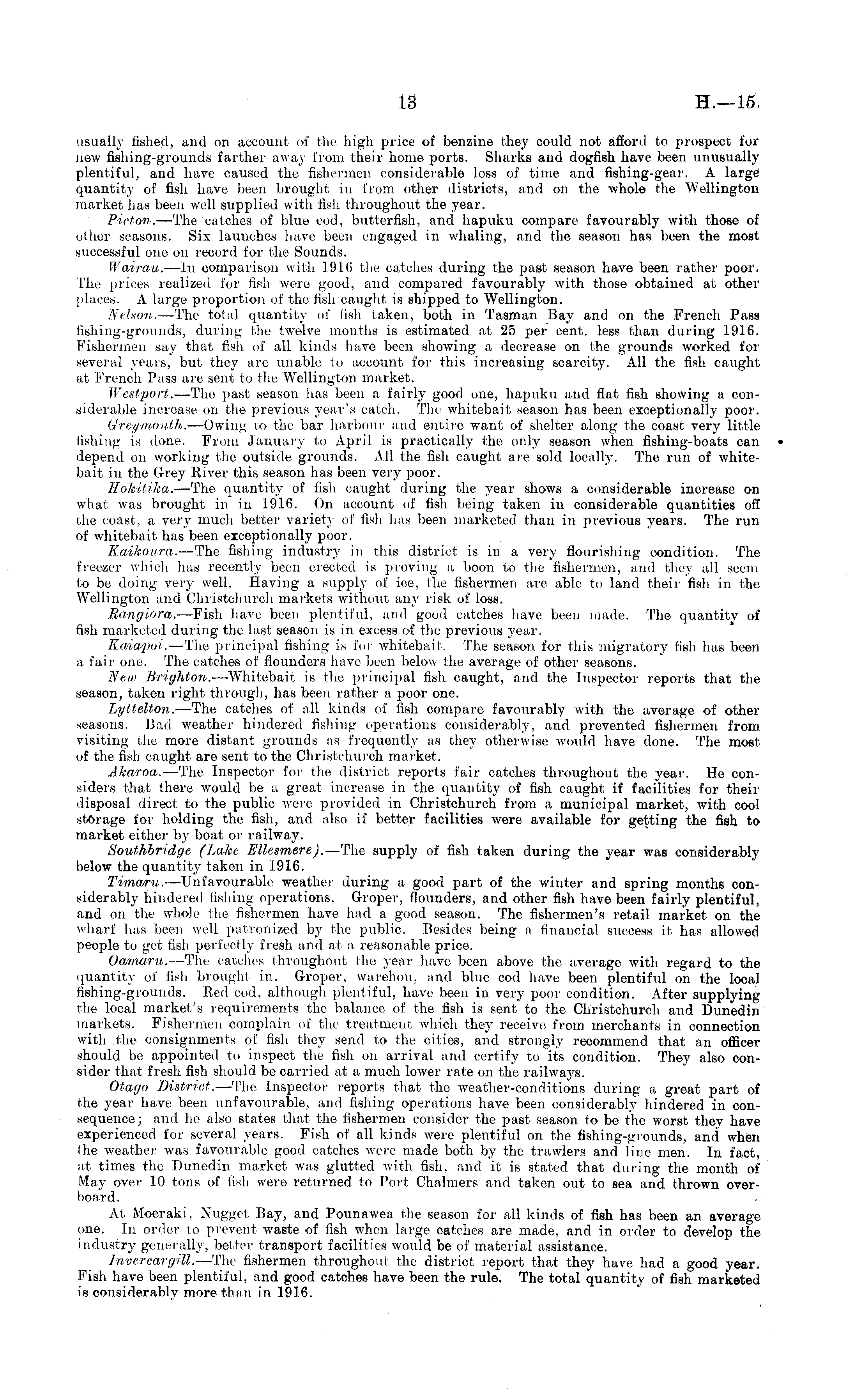 usually fished, and on account erf the high price of benzine they could not afford to prospect for new fishing-grounds farther away from their home ports. Sharks and dogfish have been unusually plentiful, and have caused the fishermen considerable loss of time and fishing-gear. A large quantity of fish have been brought in from other districts, and on the whole the Wellington market has been well supplied with fish throughout the year. Picton. —The catches of blue cod, butterfish, and hapuku compare favourably with those of other seasons. Six launches have been engaged in whaling, and the season has been the most successful one on record for the Sounds. Wairau. —In comparison with 1916 the catches during the past season have been rather poor. The prices realized for fish were good, and compared favourably with those obtained at other places. A large proportion of the fish caught is shipped to Wellington. Nelson. —The total quantity of fish taken, both in Tasman Bay and on the French Pass fishing-grounds, during the twelve months is estimated at 25 per cent, less than during 1916. Fishermen say that fish of all kinds have been showing a decrease on the grounds worked for several years, but they are unable to account for this increasing scarcity. All the fish caught at Erench Pass are sent to the Wellington market. Westport. —Tho past season has been a fairly good one, hapuku and flat fish showing a considerable increase on the previous year's catch. The whitebait season has been exceptionally poor. Greymouth. —Owing to the bar harbour and entire want of shelter along the coast very little fishing is done. From January to April is practically the only season when fishing-boats can depend on working the outside grounds. All the fish caught are sold locally. The run of whitebait in the Grey River this season has been very poor. Hokitika. —The quantity of fish caught during the year shows a considerable increase on what was brought in in 1916. On account of fish being taken in considerable quantities off the coast, a very much better variety of fish has been marketed than in previous years. The run of whitebait has been exceptionally poor. Kaikoura. —The fishing industry in this district is in a very flourishing condition. The freezer which has recently been erected is proving a boon to the fishermen, and they all seem to be doing very well. Having a supply of ice, the fishermen arc able to land their fish in the Wellington and Christchurch markets without any risk of loss. Rangiora. —Fish have been plentiful, and good catches have been made. The quantity of fish marketed during the last season is in excess of the previous year. Kaiapoi.- —The principal fishing is for whitebait. The season for this migratory fish has been a fair one. The catches of flounders have been below the average of other seasons. New Brighton. —Whitebait is the principal fish caught, and the Inspector reports that the season, taken right through, has been rather a poor one. Lyttelton. —The catches of all kinds of fish compare favourably with the average of other seasons. Bad weather hindered fishing operations considerably, and prevented fishermen from visiting the more distant grounds as frequently as they otherwise would have done. The most, of the fish caught are sent to the Christchurch market. Akaroa. —The Inspector for the district, reports fair catches throughout the year. He considers that there would be a great increase in the quantity of fish caught, if facilities for their disposal direct to the public were provided in Christchurch from a municipal market, with cool storage for holding the fish, and also if better facilities were available for getting the fish to market either by boat or railway. Southbridge (Lake Ellesmere). —The supply of fish taken during the year was considerably below the quantity taken in 1916. Timaru. —Unfavourable weather during a good part of the winter and spring months considerably hindered fishing operations. Groper, flounders, and other fish have been fairly plentiful, and on the whole the fishermen have had a good season. The fishermen's retail market on the wharf has been well patronized by the public. Besides being a financial success it, has allowed people to get fish perfectly fresh and at a reasonable price. Oamuru. —The catches throughout the year have been above the average with regard to the quantity of fish brought in. Groper, warehou, and blue cod have been plentiful on the local fishing-grounds. Red cod, although plentiful, have been in very poor condition. After supplying the local market's requirements the balance of the fish is sent to the Christchurch and Dunedin markets. Fishermen complain of the treatment which they receive from merchants in connection with the consignments of fish they send to the cities, and strongly recommend that an officer should be appointed to inspect the fish on arrival and certify to its condition. They also consider that fresh fish should be carried at a much lower rate on the railways. Otago District. —The Inspector reports that the weather-conditions during a great part of the year have been unfavourable, and fishing operations have been considerably hindered in consequence; and ho also states that the fishermen consider the past season to be the worst they have experienced for several years. Fish of all kinds were plentiful on the fishing-grounds, and when the weather was favourable good catches were made both by the trawlers and line men. In fact, at times the Dunedin market was glutted with fish, and it is stated that during the month of May over 10 tons of fish were returned to Port Chalmers and taken out to sea and thrown overboard. At Moeraki, Nugget Bay, and Pounawea the season for all kinds of fish has been an average one. In order to prevent waste of fish when large catches are made, and in order to develop the industry generally, better transport facilities would be of material assistance. I