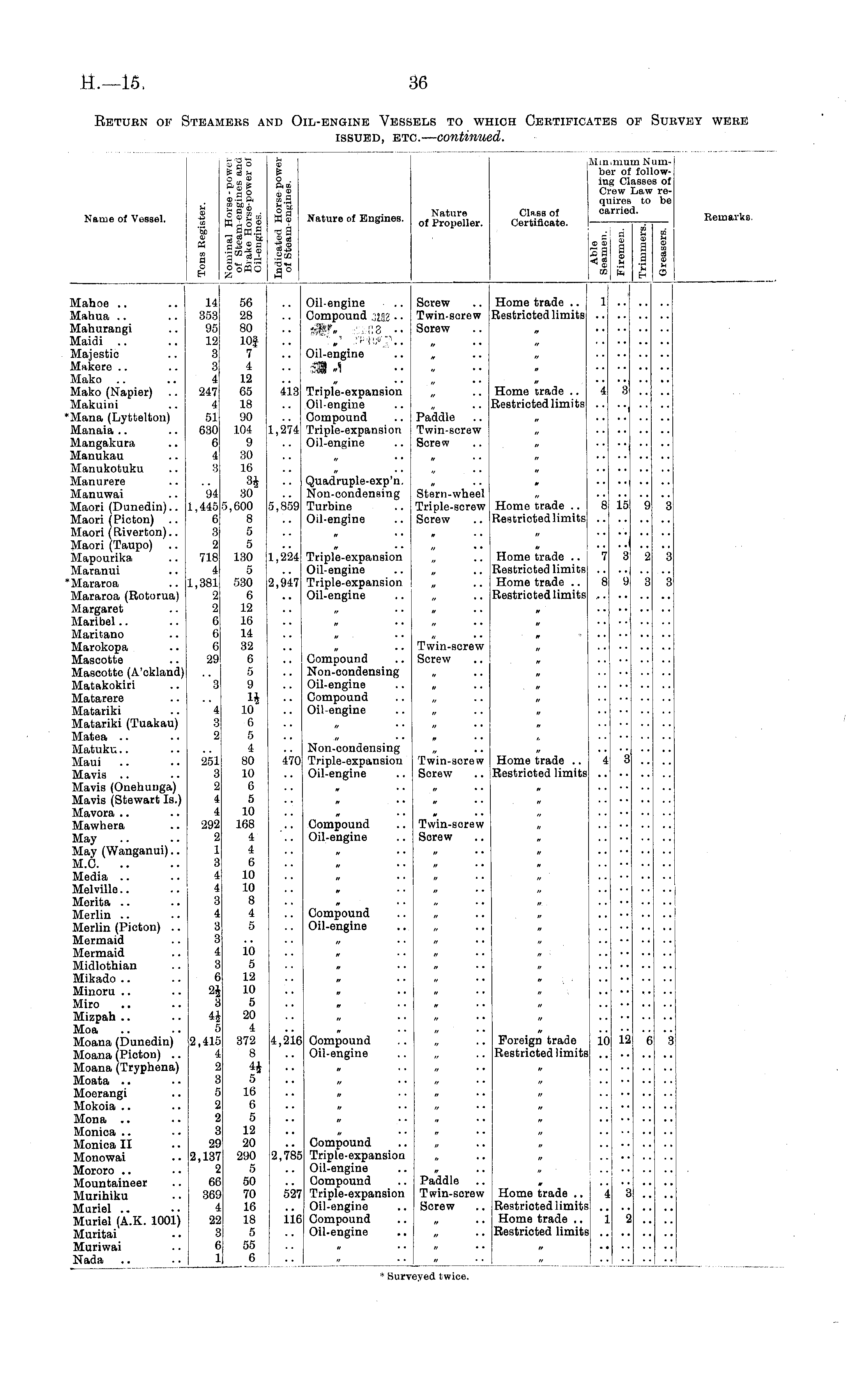 Return of Steamers and Oil-engine Vessels to which Certificates of Survey were issued, etc. — continued.