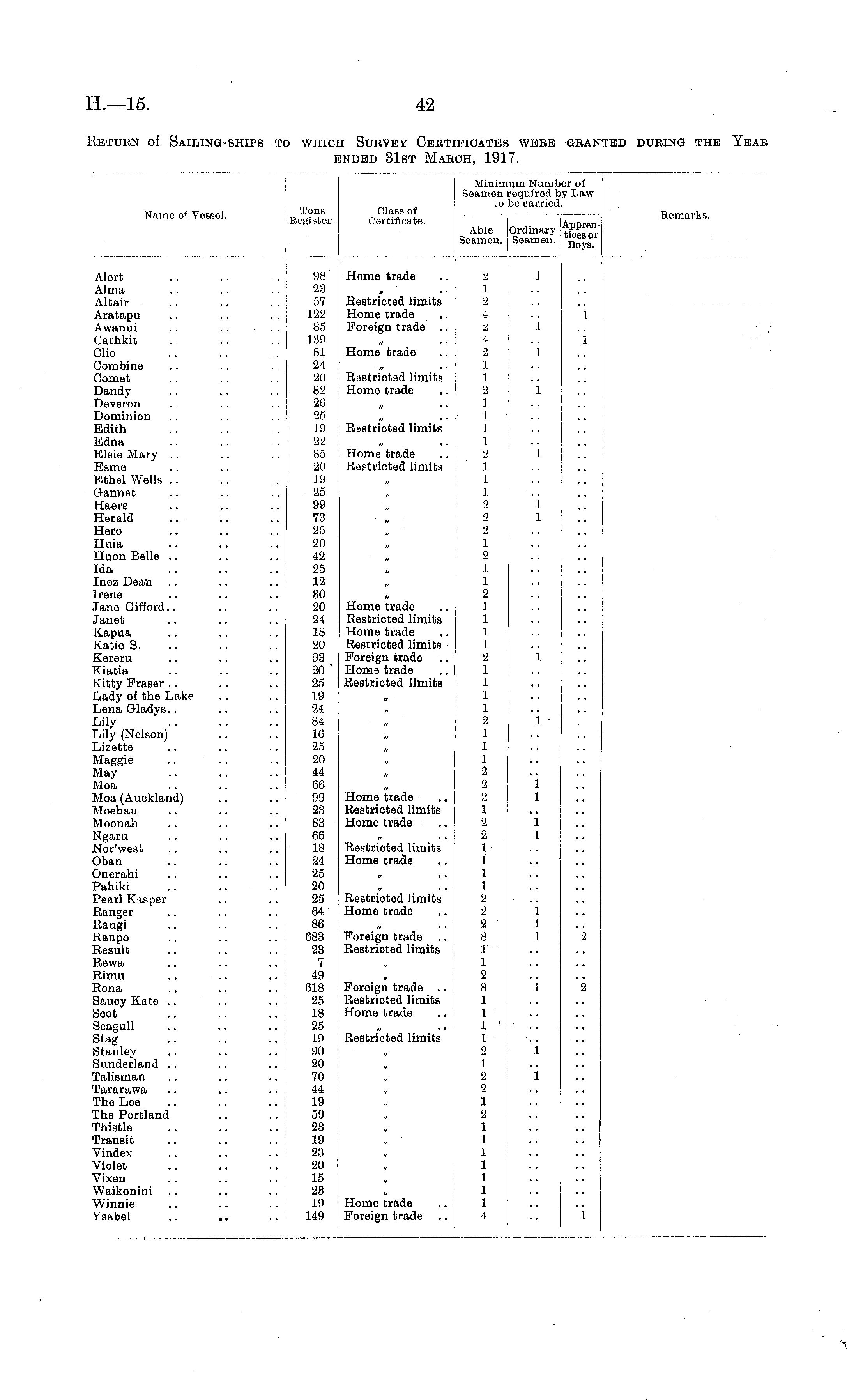 Name of Vessel. r j Tons Register. ■ r Minimum Number of Seamen required by Law to be carried. Class of Certificate, Utitimti Able Ordinary ffi£*£ Seamen. Seamen. 1 jf„y° Remarks. Alert Alma Altai r Aratapu Awanui Catbkit Clio Combine Comet Dandy Deveron Dominion Edith Edna Elsie Mary Esme Ethel Wells Gannet Haere Herald Hero Huia Huon Belle Ida Inoz Dean Irene Jano Giflord.. Janet Kapua Katie S. Kereru Kiatia Kitty Fraser Lady of the Lake Lena Gladys.. Lily Lily (Nelson) Lizette Maggie May Moa Moa (Auokland) Moehau Moonah Ngaru Nor'west Oban Onerahi Pahiki Pearl Kasper Ranger Rangi Raupo Result Rewa Rimu Rona Saucy Kate Soot Seagull Stag Stanley Sunderland Talisman Tararawa The Lee The Portland Thistle Transit Vindex Violet Vixen Waikonini Winnie Ysnbel 98 23 57 122 85 139 81 24 20 82 26 25 19 22 85 20 19 25 99 73 25 20 42 25 12 30 20 24 18 20 98 20 ' 25 19 24 84 16 25 20 44 66 99 23 83 66 18 24 25 20 25 64 86 683 23 7 49 618 25 18 25 19 90 20 70 44 19 59 23 19 23 20 15 23 19 149 Homo trade .. 2 1 ..1 .... Restricted limits 2 Home trade .. 4 .. 1 Foreign trade .. 2 1 ..: 4 .. i Home trade .. 2 1 1 Restricted limits 1 Home trade .. ! 2 1 1 1 ... Restricted limits 1 ... 1 Home trade .. 2 1 Restricted limits , 1 "„ 2 i ■ '.'. 2 1 2 1 .... 2 .... 1 .... 1 .... 2 .... Home trade .. 1 Restricted limits 1 Home trade .. I 1 Restricted limits I 1 Foreign trade .. 2 1 Home trade .. 1 Restricted limits ] 1 1 I I I i- :• i .... i .... i .... 2 .... 2 1.. Home trade .. 2 1 Restricted limits 1 Home trade ■ .. 2 1 ..2 I Restricted limits 1 Home trade .. 1 1 1 Restricted limits 2 Home trade .. 2 1 2 '■' 1 Foreign trade .. 8 1 2 Restricted limits 1 1 .... 2 Foreign trade .. 8 1 2 Restricted limits 1 Home trade .. 1 : 1 .. Restricted limits 1 2 1.. "„ 1 .... 2 1.. 2 .... 1 .... 2 .... 1 .... I .... 1 .... 1 .... 1 .... 1 .... Home trade .. 1 Foreign trade .. 4 .. 1