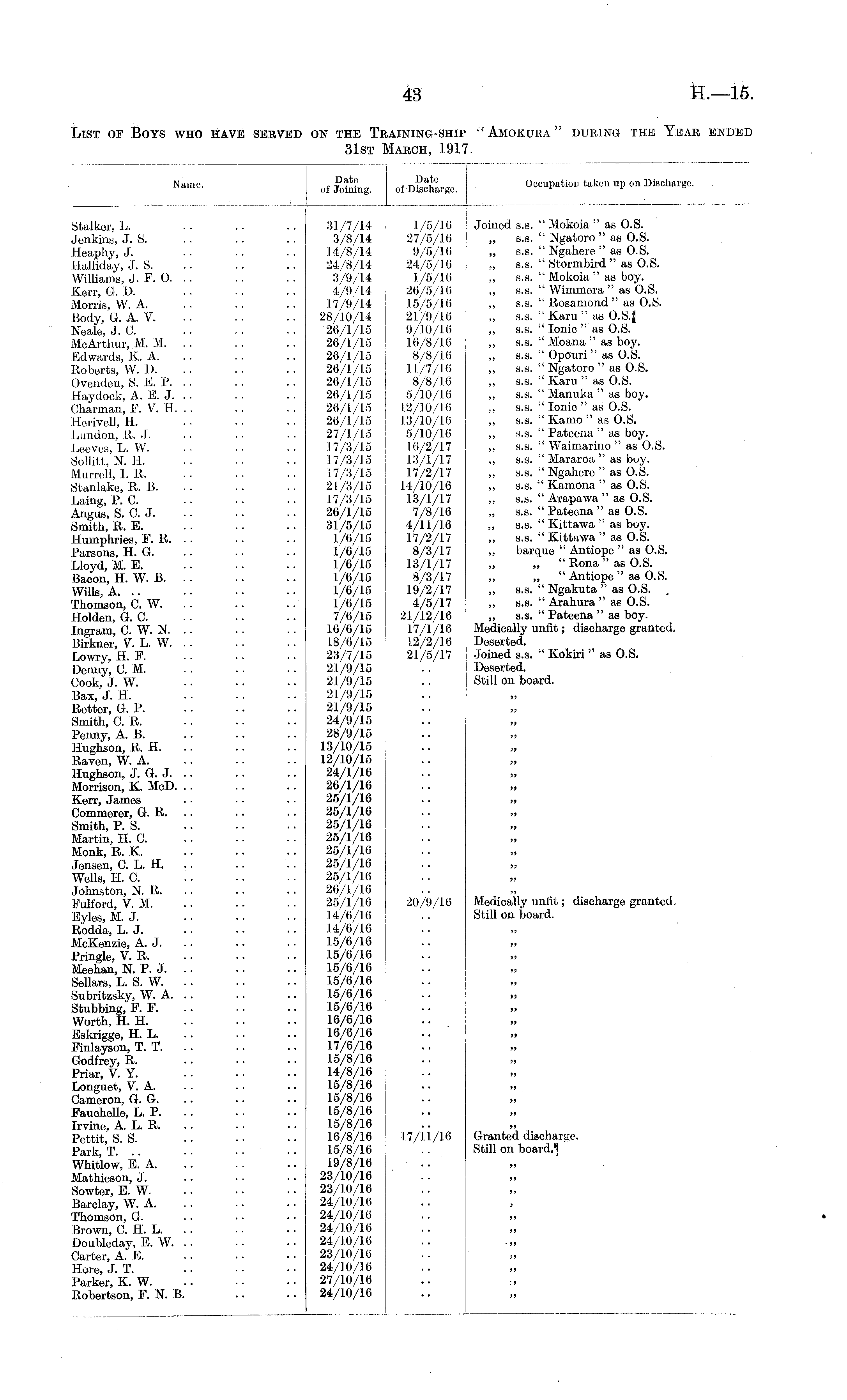 Name. Date of Joining. Date of Discharge. Occupation taken up on Discharge. Stalker, L. Jenkins, J. S. Heaphy, J. Ilalliday, J. S. Williams, J. F. O. Kerr, G. D. Morris, W. A. Body, G. A. V. Neale, J. C. McArthur, M. M. Edwards, K. A. Roberts, W. D. Ovenden, S. E. P. . . Haydock, A. E. J. Charman, F. V. H. Herivell, H. Ijundon, R. J. Leeves, L. W. Sollitt, N. H. Murroll, LB. Stanlake, R. B. Laing, P. C. Angus, S. C. J. Smith, R. E. Humphries, F. R. . . Parsons, H. G. Lloyd, M. E. Bacon, H. W. B. .. Wills, A. .. Thomson, C. W. Holden, G. C. Ingram, C. W. N. Birkner, V. L. W. .. Lowry, H. F. Denny, C. M. Cook, J. W. Bax, J. H. Better, G. P. Smith, C. R. Penny, A. B. Hughson, R. H. Raven, W. A. Hughson, J. G. J. Morrison, K. McD. . . Kerr, James Commerer, G. R. Smith, P. S. Martin, H. C. Monk, R. K. Jensen, C. L. H. Wells, H. C. Johnston, N. R. Fulford, V. M. Eyles, M. J. Rodda, L. J. McKenzie, A. J. Pringle, V. R. Meehan, N. P. J. .. Sellars, L. S. W. Subritzsky, W. A. Stubbing, F. F. Worth, H. H. Eskrigge, H. L. Finlayson, T. T. Godfroy, R. Priar, V. Y. Longuet, V. A. Cameron, G. G. Fauchelle, L. P. Irvine, A. L. R. Pettit, S. S. Park T. .. Whitlow, E. A. Mathieson, J. Sowter, E, W. Barclay, W. A. Thomson, G. Brown, C. H. L. Doubloday, E. W. .. Carter, A. E. Hore, J. T. Parker, K. W. Robertson, F. N. B. 31/7/14 3/8/14 14/8/14 24/8/14 3/9/14 4/9 /14 17/9/14 28/10/14 26/1/15 26/1/15 26/1/I5 26/1/15 26/1/15 26/1/15 26/1/15 26/1/15 27/1/15 17/3/15 17/3/15 17/3/15 21/3/15 17/3/15 26/1/15 31/5/15 1/6/15 1/6/15 1/6/15 1/6/15 1/6/15 1/6/15 7/6/15 16/6/15 18/6/15 23/7/15 21/9/15 21/9/15 21/9/15 21/9/15 24/9/15 28/9/15 13/10/15 12/10/15 24/1/16 26/1/16 25/1/16 25/1/16 25/1/16 25/1/16 25/1/16 25/1/16 25/1/16 26/1/16 25/1/16 14/6/16 14/6/16 15/6/16 15/6/16 15/6/16 15/6/16 15/6/16 15/6/16 16/6/16 16/6/16 17/6/16 .15/8/16 14/8/16 15/8/16 15/8/16 1.5/8/16 1.5/8/16 16/8/16 1.5/8/16 19/8/16 23/10/16 23/10/1.6 24/10/16 24/10/16 24/10/16 24/1.0/16 23/10/16 24/10/16 27/10/16 24/10/16 1/5/16 27/5/16 9/5/16 24/5/16 1/5/16 26/5/16 15/5/16 21/9/16 9/10/16 16/8/16 8/8/16 11/7/16 8/8/1.6 5/10/16 12/10/16 13/10/16 5/10/16 16/2/17 13/1/17 17/2/17 14-/10/16 13/1/17 7/8/16 4/11/16 17/2/17 8/3/17 13/1/17 8/3/17 19/2/17 4/5/17 21/12/16 17/1/16 12/2/16 21/5/17 Joined s.s. " Mokoia " as O.S. „ s.s. " Ngatoro " as O.S. „ s.s. " Ngahere " as O.S. „ s.s. " Stormbird " as O.S. ,, s.s. " Mokoia " as boy. ,, s.s. " Wimmera " as O.S. ,, s.s. " Rosamond " as O.S. „ s.s. " Karu " as O.S. J „ s.s. " Ionic " as O.S. „ s.s. " Moana " as boy. „ s.s. " Opouri " as O.S. ,, s.s. " Ngatoro " as O.S. ,, s.s. " Karu " as O.S. ,, s.s. " Manuka " as boy. ,, s.s. " Ionic " as O.S. „ s.s. " Kamo " as O.S. „ s.s. " Pateena " as boy. ,, s.s. " Waimarino " as O.S. ,, s.s. " Mararoa " as buy. ,, s.s. " Ngahere " as O.S. ,, s.s. " Kamona " as O.S. ,, s.s. " Arapawa " as O.S. „ s.s. " Pateena" as O.S. ,, s.s. " Kittawa " as boy. ,, s.s. " Kittawa " as O.S. „ barque " Antiope " as O.S. ,, ,, " Rona " as O.S. „ „ " Antiope " as 0. S. ,, s.s. " Ngakuta " as O.S. ,, s.s. " Arahura " as O.S. „ s.s. " Pateena " as boy. Medically unfit; discliarge granted. Deserted. Joined s.s. " Kokiri " as O.S. Deserted. Still on board. 20/9/16 Medically unht; discharge granted. Still on board. i.T/ii/16 Granted discharge. Still on board.1