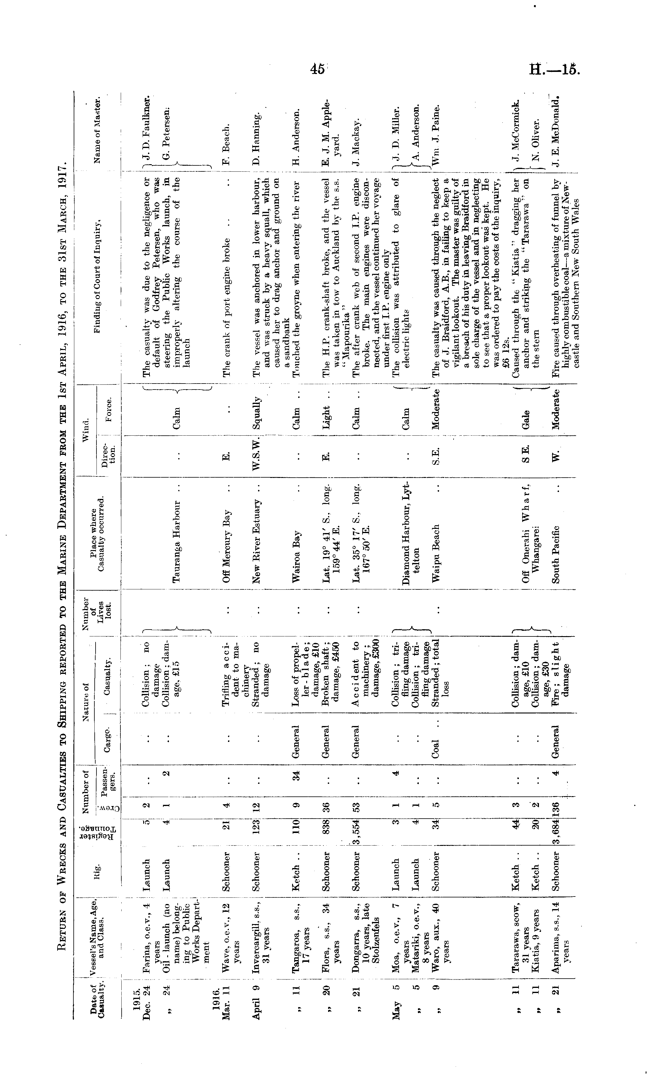 Date of Vessel's Nanie, Age, Casualty.: and Class. Rig. » or Number of •Is nn. _ S3 £ PassenM H g gers. Cargo. Natu Nature of L ure of Casualty. Number _ of Lives lost. of Dives Place where Casualty occurred. Place where Casualty occurred. Wind. i _rt__rt__ ; Fiuding of Court of Inquirv. Name of Master. Casualty. ] lost. ! Force. I I ill I i I 1 I I I I I i ' _ ____ _ __ — I I I . ! 1915. Dec. 24 Farina, o.e.v., 4 j I. years „ 24 Oil - launch (no L name) belonging to Public Works Depart-' ment Launch 5 Launch 4 Launch Launch 5 2 4 1 2 2 1 2 Collision : no damage Collision; damage, £15 y Collision : nc damage Collision ; dan age, £15 to _ nTauranga Harbour .. Tauranga Harbour . . Calm < The casualty was due to the negligence or "j J. D. Faulkner, default of Godfrey Petersen, who was steering the Public Works launch, in G. Petersen, Calm < improperly altering the course of the Slaunch 1916. Mar. 11 Wave, o.e.v., 12 j S years Schooner 21 Schooner 21 4 Trilling accident to machinery Stranded; no damage Loss of propel-ler-blade; j damage, £10 Broken shaft; damage, £450 Accident to machinery ; damage, £300 1 Collision ; tri- j") fling damage ' I Collision; tri- | fling damage J Stranded; total loss Collision; dam- "] age, £10 Collision; dam- f age, £30 J Fire ; slight damage Trifling a c c i dent to ma chinerv i- .. C Off Mercury Bay New Elver Estuary .. Wairoa Bay Lat. 19° 41' S.. long. 159° 44' E. Lat. 35° 17' S.. long. 167° 50' E. Diamond Harbour, Lyttelton Waipu Beach Off Onerahi Wharf, Whangarei South Pacific Off Mercury Bay E. E. .. The crank of port engine broke . . .. F. Beach. W.S.W/ Squally ; The vessel was anchored in lower harbour, D. Harming, and was struck by a heavy squall, which , caused her to drag anchor and ground on a sandbank Calm .. Touched the groyne when entering the river H. -Anderson. E. Light . . The H.P. crank-shaft broke, and the vessel E. J. M. Applewas taken in tow to Auckland by the s.s. 3-ard. " Mapourika" Calm .. The after crank web of second LP. engine J. Mackay. broke. The main engines were disconnected, and the vessel continued her voyage under first LP. engine only I The collision was attributed to glare of ~j J. D. Miller. Calm electric lights I 1 1-4. Anderson. S.E. Moderate The casualty was caused through the neglect Wm J. Paine. of J. Braidford, A.B., in failing to keep a vigilant lookout. The master was guilty of a breach of his duty in leaving Braidford in sole charge of the vessel and in neglecting to see that a proper lookout was kept. He was ordered to pav the costs of the inquiry, £6 12s. I Caused through the "Kiatia" dragging her \ J. McCormick. S E. Gale anchor and striking the "Tararawa" on ! the stern j N. Oliver. W. Moderate Fire caused through overheating of funnel by J. E. McDonald, highly combustible coal — a mixture of Newcastle and Southern New South Wales April 9 Invercargill, s.s., | S 31 years Schooner 123 : Schooner 123 12 12 S cinuery Stranded; n< damage IO ' . . B New Elver Estuary .. . W.S.W/ Squally „ 11 Tangaroa, s.s., ! f 17 years Ketch .. 110; Ketch .. 110 9 34 ( 34 General General Loss of propel ler - b 1 a d e damage, £1( 1- .. \ ■0 I Wairoa Bay Calm .. „ 20 Flora, s.s., 34 j S years Schooner 838 Schooner r 838 36 .. ( 36 General General Broken shaft damage, £45( .; •• I Lat. 19° 41' S.. long. 159° 44' E. :. ! E. ' Light . . : „ 21 Dongarra, s.s., i S 10 years, late | Stolzenfels i. Schooner 3,554 Schooner r 3,554 53 .. ( 53 General General A c e i d ent t, machinery ; damage, £3C to .. I 00 Lat. 35° 17' S.. long. 167° 50' E. '.. • • Calm .. I ., Launch 3j . . ! May 5 Moa, o.e.v., 7 I years ,, 5 Matariki, o.e.v., I 8 years 9 Waro, aux., 40 S years „ 11 Tararawa, scow, I 31 years „ 11 Kiatia, 9 years E Launch 4 Schooner , 34 Launch Launch Schooner Ketch .. Ketch .. 3 1 4 4 1 c 34 5 .. ( 44 3 20 2 4 ! 34 1 1 5 4 Coal . . Coal . Collision ; tri fling damagi Collision ; tri fling damag, Stranded: toti loss Collision; dan age, £10 Collision; dan age, £30 Hi ?e 1 D tal .. T n- f J Diamond Harbour, Lyt telton Waipu Beach Off Onerahi Wharf, Whangarei t- .. Calm i S.E. Moderate SE. Gale J Ketch .. 44 3 20 2 3,684il36 Collision; damage, £10 Collision; damage, £30 Fire ; slight damage f Gale J Ketch .. SE. „ 21 Aparima, s.s., 14 S years Schooner Schooner r 3,684|136 I 4 ( 4 General General Fire ; sligh damage .t S South Pacific W. Moderate W. Moderate