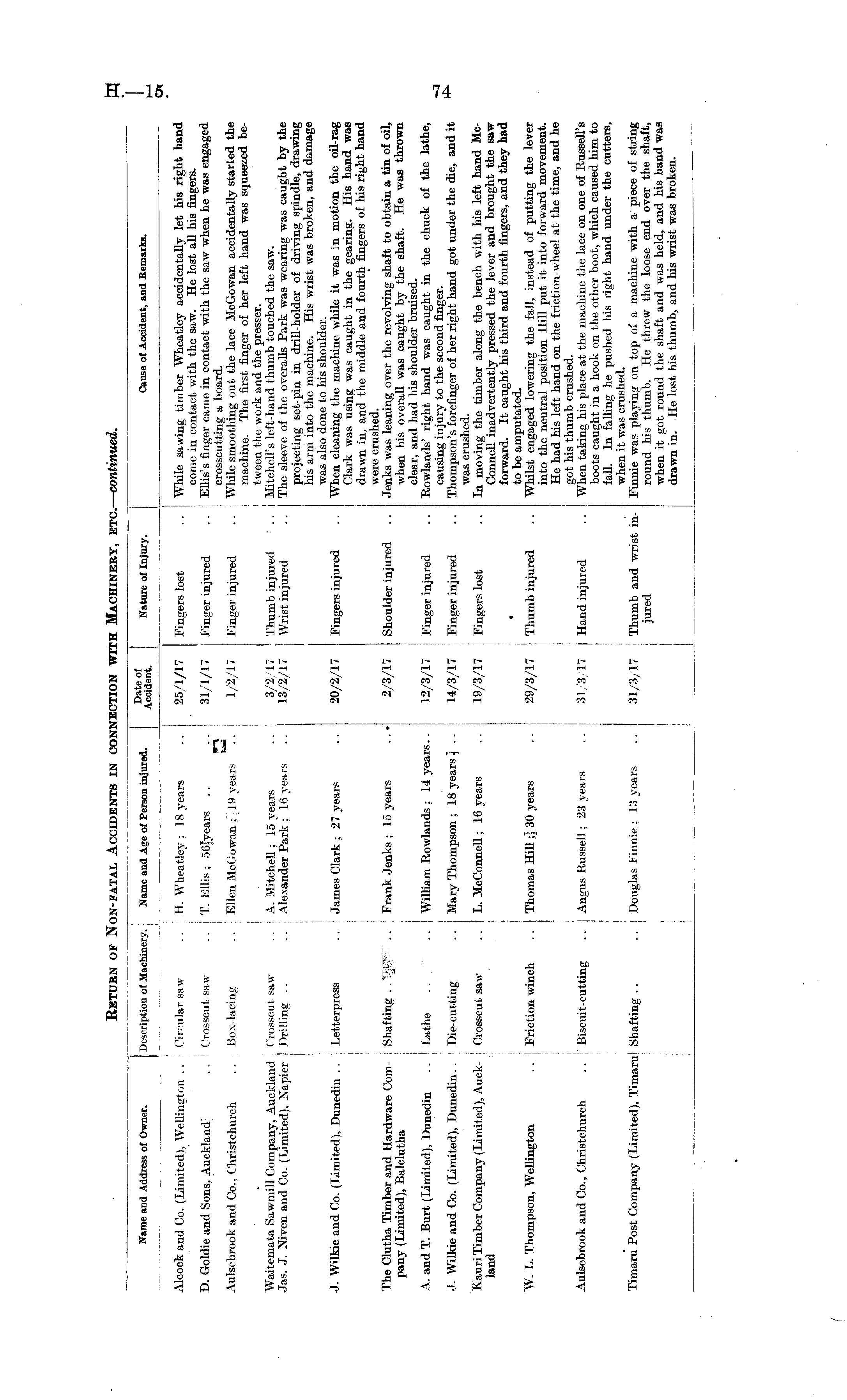Name and Address of Owner. Description of Machinery. Name and Age of Person injured. Name and Address of Owner. Date of Accident. Nature of Injury, Cause of Accident, and Kemarlu. I II Alcock and Co. (Limited), Wellington .. Circular saw .. | H. Wheatley : 18 years 25/1/17 25/1/17 Fingers lost .. While sawing timber Wheatley accidentally let his right hand come in contact with the saw. He lost all his fingers. 31/1/17 Finger injured .. Ellis's finger came in contact with the saw when he was engaged crosscutting a board. 1/2/17 Finger injured .. While smoothing out the lace McGowan accidentally started the machine. The first finger of her left hand was squeezed between the work and the presser. 3/2/17 Thumb injured .. Mitchell's left-hand thumb touched the saw. 13/2/17 Wrist injured .. The sleeve of the overalls Park was wearing was caught by the projecting set-pin in drill-holder of driving spindle, drawing his arm into the machine. His wrist was broken, and damage was also done to his shoulder. 20/2/17 Fingers injured .. When cleaning the machine while it was in motion the oil-rag Clark was using was caught in the gearing. His band was drawn in, and the middle and fourth fingers of his right hand were crushed. 2/3/17 Shoulder injured .. Jenks was leaning over the revolving shaft to obtain a tin of oil, when his overall was caught by the shaft. He was thrown clear, and had his shoulder bruised. 12/3/17 | Finger injured .. Rowlands' right hand was caught in the chuck of the lathe, causing injury to the second finger. 14/3/17 Finger injured .. Thompson's forefinger of her right hand got under the die, and itwas crushed. 19/3/17 Fingers lost .. In moving the timber along the bench with his left hand McConnell inadvertently pressed the lever and brought the saw forward. It caught his third and fourth fingers, and they had to be amputated. 29/3/17 I Thumb injured .. Whilst engaged lowering the fall, instead of putting the lever into the neutral position Hill put it into forward movement. He had his left hand on the friction- wheel at the time, and he got his thumb crushed. 31/3/17 j Hand injured .. When taking his place at the machine the lace on one of Rus3ell's boots caught in a hook on the other boot, which caused him to fall. In falling he pushed his right hand under the cutters, when it was crushed. 31/3/17 Thumb and wrist in- Finnie was playing on top of a machine with a piece of string jured round his thumb. He threw the loose end over the shaft, when it got round the shaft and was held, and his hand was drawn in. He lost his thumb, and his wrist was broken. Fingers lost D. Goldie and Sons, Auckland' .. ■ Crosscut saw .. T. Ellis ; 56svears .. fcrt_i Aulsebrook and Co.. Christchurch .. Box-lacing .. I Ellen McGowan ; 19 vears 31/1/17 1/2/17 Finger injured Finger injured Waitemata Sawmill Company, Auckland Crosscut saw .. A. Mitchell; 15 years Jas. J. Niven and Co. (Limited). Napier ! Drilling .. .. Alexander Park : 16 vears 3/2/17 13/2/17 ! v rhumb injured Wrist injured ; J. Wilkie and Co. (Limited). Dunedin . . \ Letterpress .. James Clark ; 27 years 20/2/17 P Fingers injured The Clutha Timber and Hardware Com- Shafting . . ■ ■/••'' . . Frank Jenks ; 15 years .. • pany (Limited), Balclutha A. and T. Burt (Limited), Dunedin .. ; Lathe .. .. William Rowlands; 14 years.. 2/3/17 12/3/17 S Shoulder injured Finger injured J. Wilkie and Co. (Limited), Dunedin. . ! Die-cutting .. Mary Thompson ; 18 years <j .. ] Kauri Timber Companv'(Limited), Auck- Crosscut saw .. L. McConnell; 16 years land 14/3/17 19/3/17 j I Finger injured Fingers lost 1 ! W. L. Thompson, Wellington .. ' Friction winch . . Thomas Hill ;] 30 years 29/3/17 1 I Thumb injured 1 i -Aulsebrook and Co., Christchurch .. j Biscuit-cutting .. Angus Russell; 23 years .. I 31/3 17 I* Hand injured I i • Timaru Post Company (Limited), Timaru: Shafting .. .. Douglas Finnie ; 13 years 31/3/17 1 I'hunib and wrist ir jured ni l I