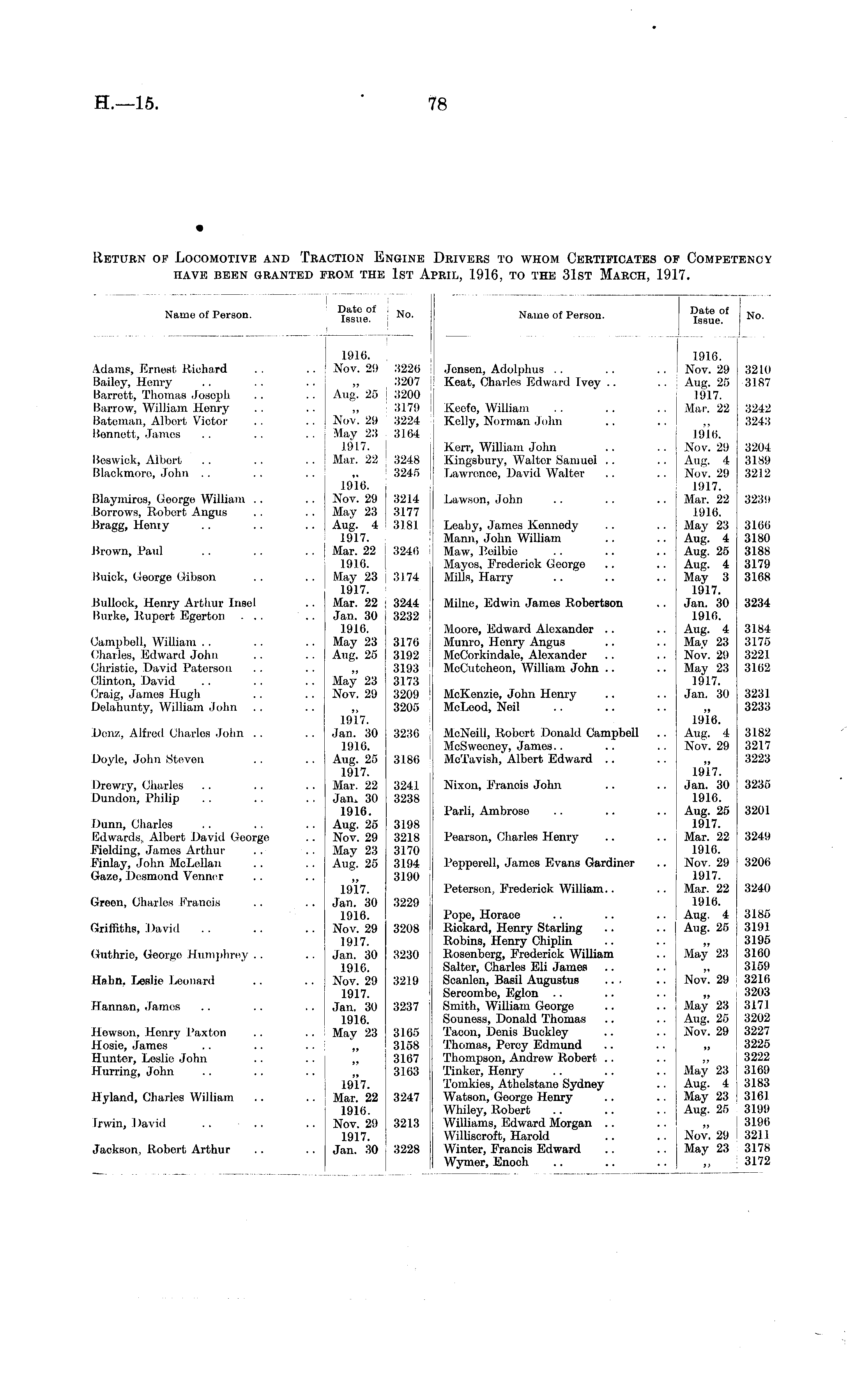 Return of Locomotive and Traction Engine Drivers to whom Certificates of Competency have been granted from the 1st April, 1916, to the 31st March, 1917.