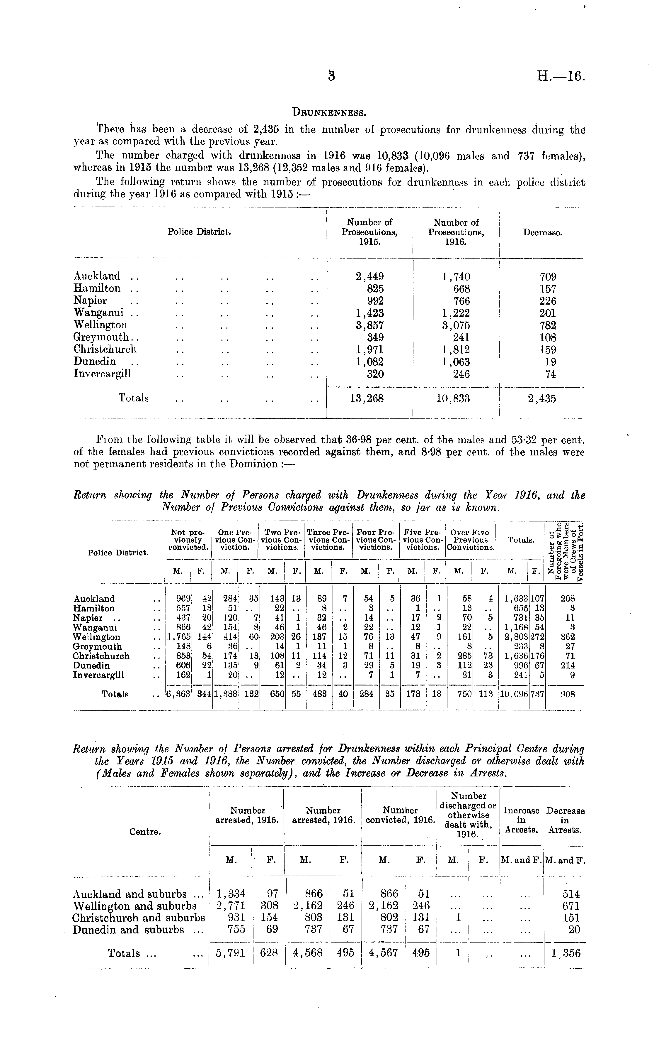Drunkenness. There has been a decrease of 2,435 in the number of prosecutions for drunkenness during the year as compared with the previous year. The number charged with drunkenness in 1.916 was 10,833 (10,096 males and 737 females), whereas in 1.915 the number was 13,268 (12,352 males and 916 females). The following return shows the number of prosecutions for drunkenness in each police district during the year 1916 as compared with 1915 : —