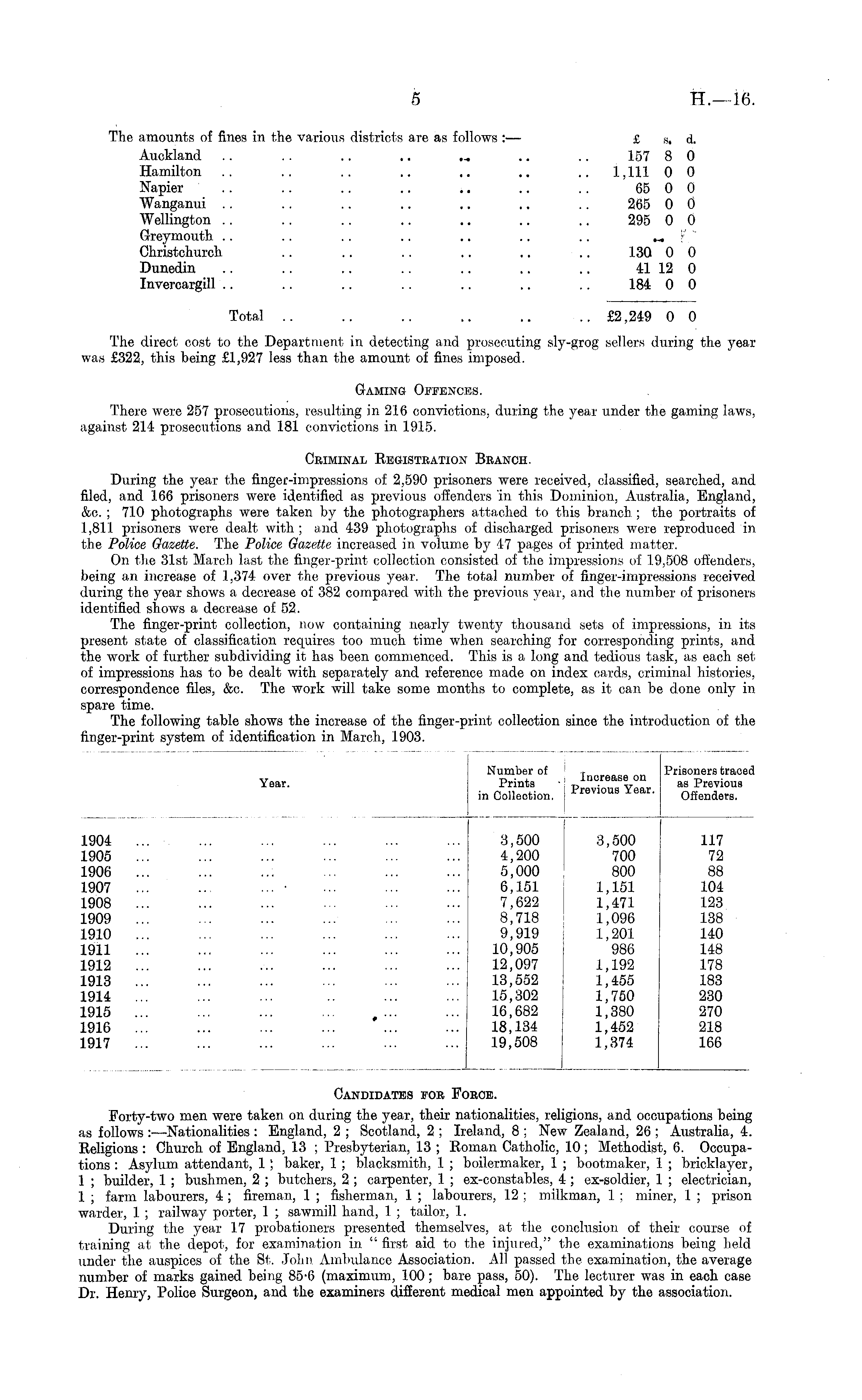 The amounts of fines in the various districts are as follows :— £ s, d. Auckland .. .. .. .. « .. .. 157 8 0 Hamilton .. .. .. .. .. .. .. 1,111 0 0 Napier .. .. .. .. .. .. .. 65 0 0 Wanganui .. .. .. .. .. .. .. 265 0 0 Wellington .. .. .. .. .. .. .. 295 0 0 Greymouth .. .. .. .. .. .. .. M ; Christchurch .. .. .. .. .. .. 130 0 0 Dunedin .. .. .. .. .. .. .. 41 12 0 Invercargill .. .. .. .. .. .. .. 184 0 0 Total .. .. .. .. .. .. £2,249 0 0 The direct cost to the Department in detecting and prosecuting sly-grog sellers during the year was £322, this being £1,927 less than the amount of fines imposed. Gaming Offences. There were 257 prosecutions, resulting in 216 convictions, during the year under the gaming laws, against 214 prosecutions and 181 convictions in 1915. Criminal Begistration Branch. During the year the finger-impressions of 2,590 prisoners were received, classified, searched, and filed, and 166 prisoners were identified as previous offenders 'in this Dominion, Australia, England, &c.; 710 photographs were taken by the photographers attached to this branch; the portraits of 1,811 prisoners were dealt with ; and 439 photographs of discharged prisoners were reproduced in the Police Gazette. The Police Gazette increased in volume by 47 pages of printed matter. On the 31st March last the finger-print collection consisted, of the impressions of 19,508 offenders, being an increase of 1,374 over the previous year. The total number of finger-impressions received during the year shows a decrease of 382 compared with the previous year, and the number of prisoners identified shows a decrease of 52. The finger-print collection, now containing nearly twenty thousand sets of impressions, in its present state of classification requires too much time when searching for corresponding prints, and the work of further subdividing it has been commenced. This is a long and tedious task, as each set of impressions has to be dealt with separately and reference made on index cards, criminal histories, correspondence files, &c. The work will take some months to complete, as it can be done only in spare time. The following table shows the increase of the finger-print collection since the introduction of the finger-print system of identification in March, 1903.