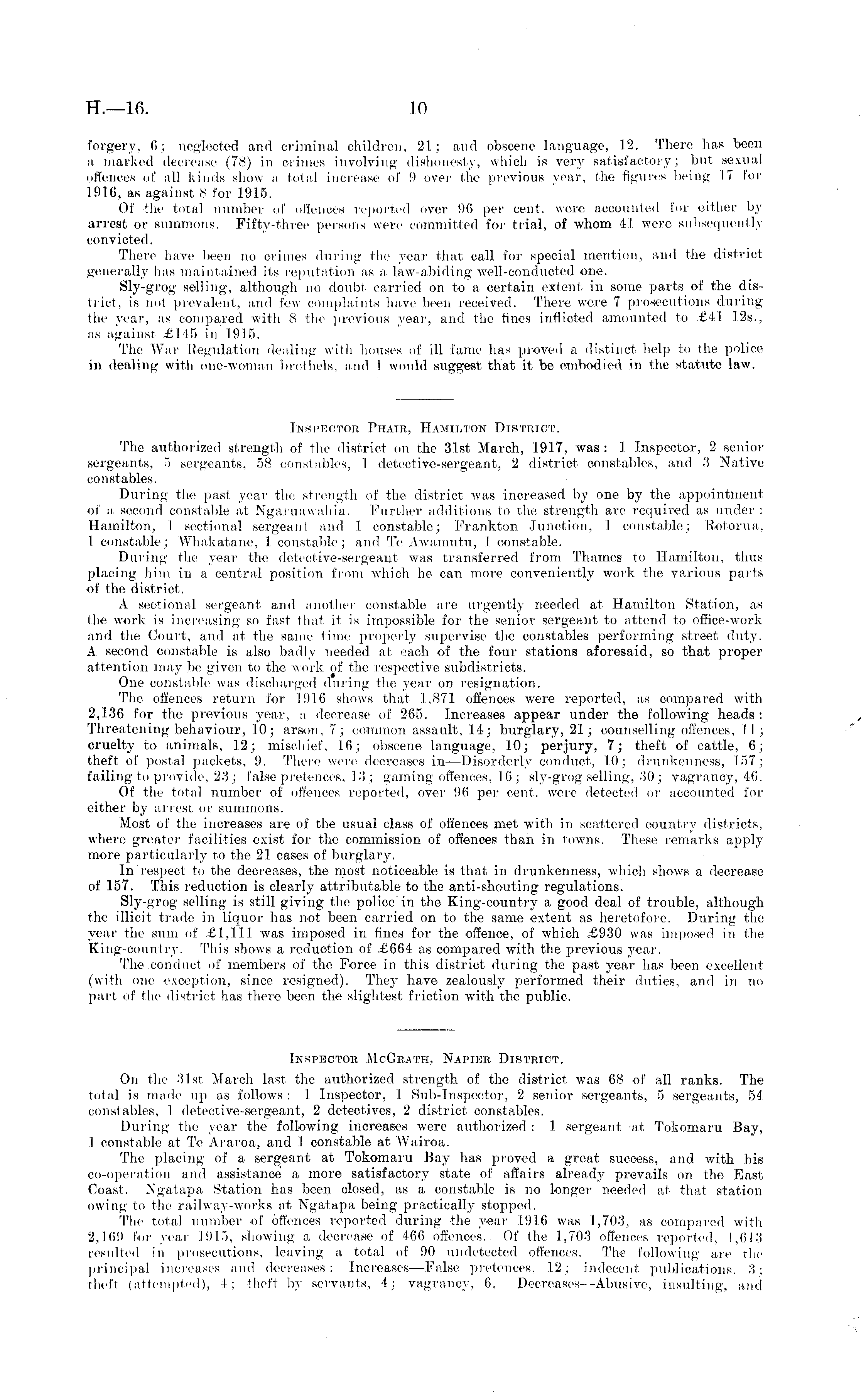 forgery, 6; neglected and criminal children, 21; and obscene language, 12. There has been a marked decrease (78) in crimes involving dishonesty, which is ver}' satisfactory ; but sexual offences of all kinds show a total increase of II over the previous year, the figures being 17 for 1916, as against 8 for 1915. Of the total number of offences reported over 96 per cent, were accounted for either by arrest or summons. Fifty-three persons were committed for trial, of whom 41 were subsequently convicted. There have been no crimes during the year that call for special mention, and the district generally has maintained its reputation as a law-abiding well-conducted one. Sly-grog selling, although no doubt carried on to a certain extent in some parts of the district, is not prevalent, and few complaints have been received. There were 7 prosecutions during the year, as compared with 8 tin' previous year, and the fines inflicted amounted to £41 125., as against £145 in 1915. The War Regulation dealing with houses of ill fame has proved a distinct help to the police in dealing with one-woman brothels, and I would suggest that it be embodied in the statute law. Inspector. Phair, Hamilton District. The authorized strength of the district on the 31st March, 1917, was: 1 Inspector, 2 senior sergeants, 5 sergeants, 58 constables, 1 detective-sergeant, 2 district constables, and 3 Native constables. During the past year the strength of the district was increased by one by the appointment of a second constable at Ngaruawahia. Further additions to the strength are required as under : Hamilton, I sectional sergeant and 1 constable; Frankton Junction, I constable; Rotorua, I constable; Whakatane, 1 constable; and Te Awamutu, I constable. During the year the detective-sergeant was transferred from Thames to Hamilton, thus placing him in a central position from which he can more conveniently work the various parts of the district. A sectional sergeant and another constable are urgently needed at Hamilton Station, as tin- work is increasing so fast, that it is impossible for the senior sergeant to attend to office-work and the Court, and at the same linn' properly supervise the constables performing street duty. A second constable is also badly needed at each of the four stations aforesaid, so that proper attention may be given to the work of the respective subdistricts. One constable was discharged during the j'ear on resignation. The offences return for 1916 shows that 1,871 offences were reported, as compared with 2,136 for the previous year, a decrease of 265. Increases appear under the following heads : Threatening behaviour, 10; arson, 7; common assault, 14; burglary, 21; counselling offences, 11 ; cruelty to animals, 12; mischief, 16; obscene language, 10; perjury, 7; theft of cattle, 6; theft of postal packets, 9. There were decreases in—Disorderly conduct, 10; drunkenness, 157; failing to provide, 23 ; false pretences, 13; gaming offences, I 6 ; sly-grog selling, 30; vagrancy, 46. Of the total number of offences reported, over 96 per cent, were detected or accounted for either by arrest or summons. Most of the increases are of the usual class of offences met with in scattered country districts, where greater facilities exist for the commission of offences than in towns. These remarks apply more particularly to the 21 cases of burglary. In respect to the decreases, the most noticeable is that in drunkenness, which shows a decrease of 157. This reduction is clearly attributable to the anti-shouting regulations. Sly-grog selling is still giving the police in the King-country a good deal of trouble, although the illicit trade in liquor has not been carried on to the same extent as heretofore. During the year the sum of £1,111 was imposed in fines for the offence, of which £930 was imposed in the King-country. This shows a reduction of £664 as compared with the previous year. The conduct of members of the Force in this district during the past year has been excellent (with one exception, since resigned). They have zealously performed their duties, and in no part of the district has there been the slightest friction with the public. Inspector McGrath, Napier District. On the 31st March last the authorized strength of the district was 68 of all ranks. The total is made up as follows : I Inspector, 1 Sub-Inspector, 2 senior sergeants, 5 sergeants, 54 constables, 1 detective-sergeant, 2 detectives, 2 district constables. During the year the following increases were authorized : 1 sergeant at Tokomaru Bay, 1 constable at Te Araroa, and I constable at Wairoa. The placing of a sergeant at Tokomaru Bay has proved a great success, and with his co-operation and assistance a more satisfactory state, of affairs already prevails on the East Coast. Ngatapa Station has been closed, as a constable is no longer needed at that station owing to the railway-works at Ngatapa being practically stopped. The total number of offences reported during the year 1916 was 1,703, as compared with 2,16!) for year 1915, showing a decrease of 466 offences. Of the 1,703 offences reported, 1,613 resulted in prosecutions, leaving a total of 90 undetected offences. The following are the principal increases and decreases: Increases—False pretences, 12; indecent publications, 3; theft (attempted), 4; theft by servants, 4; vagrancy, 6, Decreases—-Abusive, insulting, and