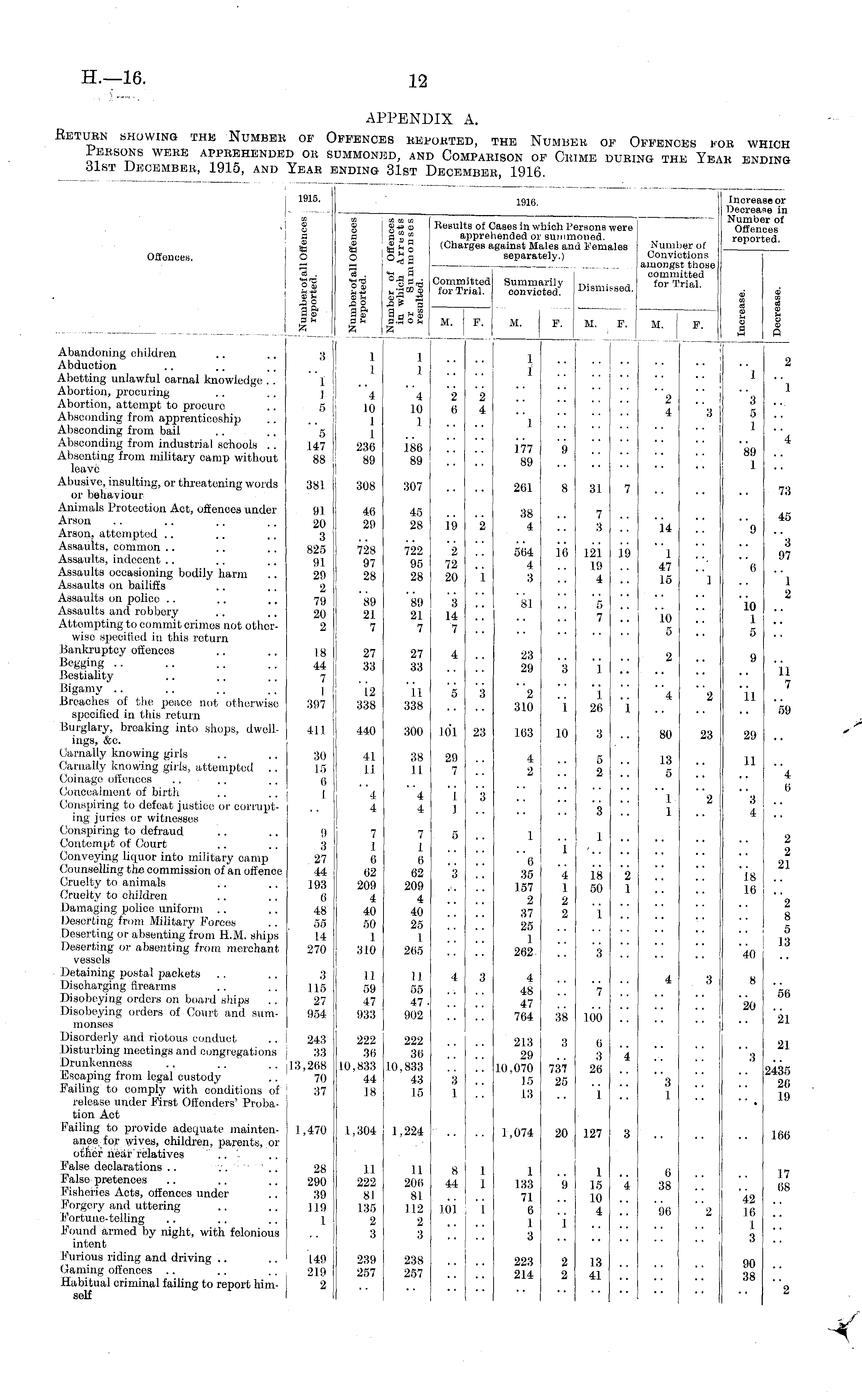 APPENDIX A. Return showing the Number of Offences reported, the Number of Offences for which Persons were apprehended or summoned, and Comparison of Crime during the Year ending 31st December, 1915, and Year ending 31st December, 1916.