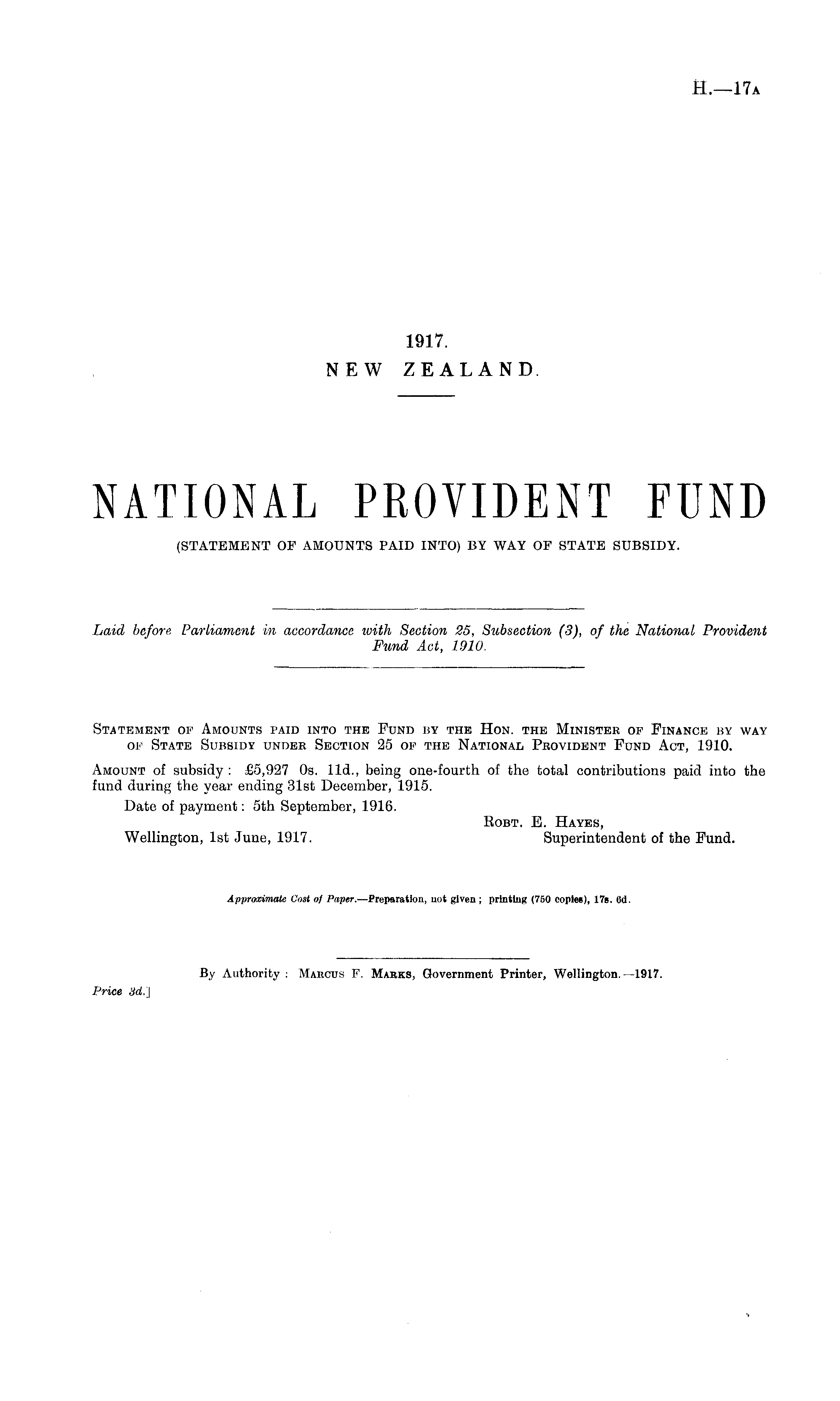 Statement op Amounts paid into the Fund by the Hon. the Minister op Finance by way op State Subsidy under Section 25 op the National Provident Fund Act, 1910. Amount of subsidy : £5,927 os. lid., being one-fourth of the total contributions paid into the fund during the year ending 31st December, 1915. Date of payment: sth September, 1916. Robt. E. Hayes, Wellington, Ist June, 1917. Superintendent of the Fund.
