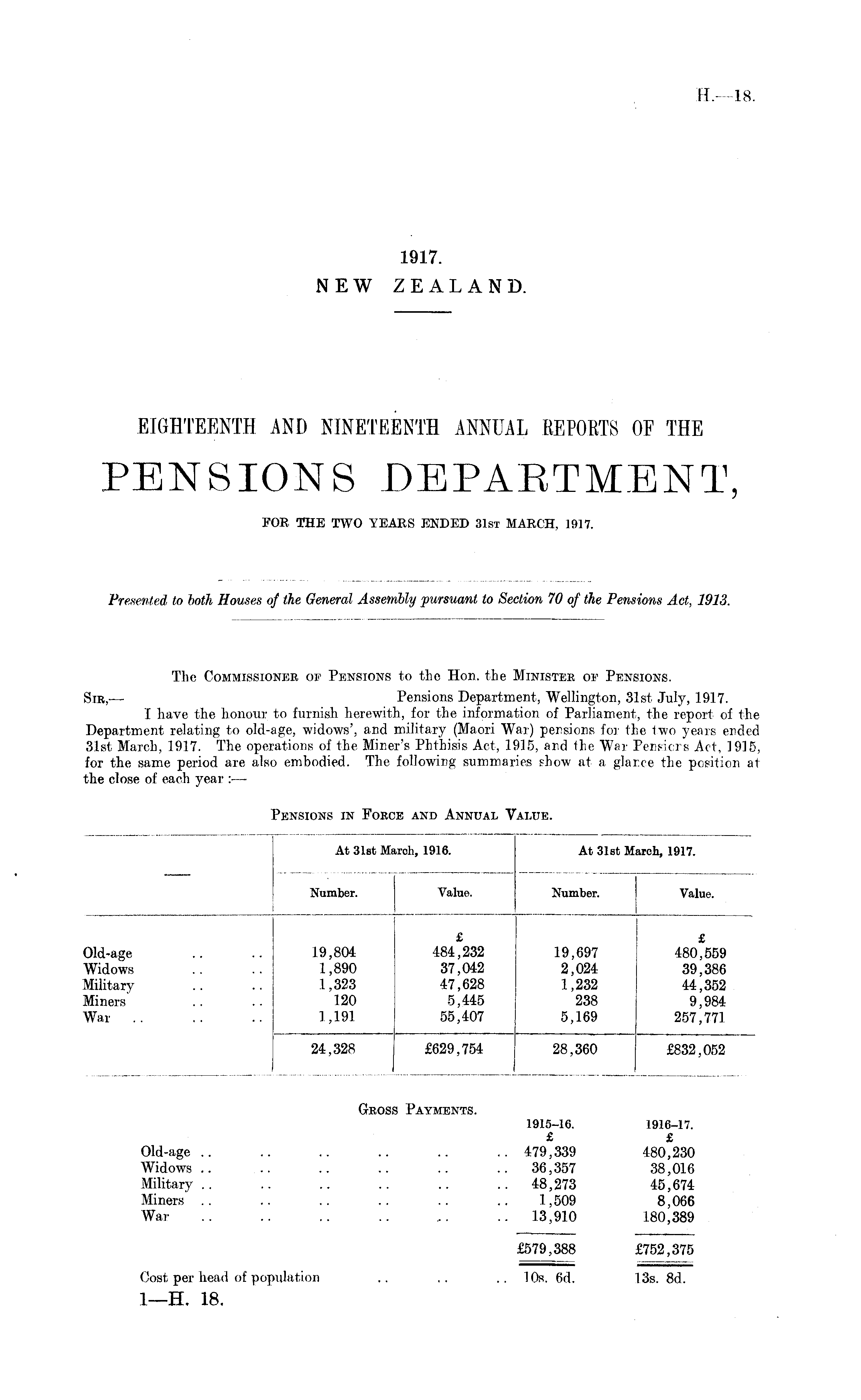 EIGHTEENTH AND NINETEENTH ANNUAL REPORTS OF THE PENSIONS DEPARTMENT, FOR THE TWO YEARS ENDED 31st MARCH, 1917.