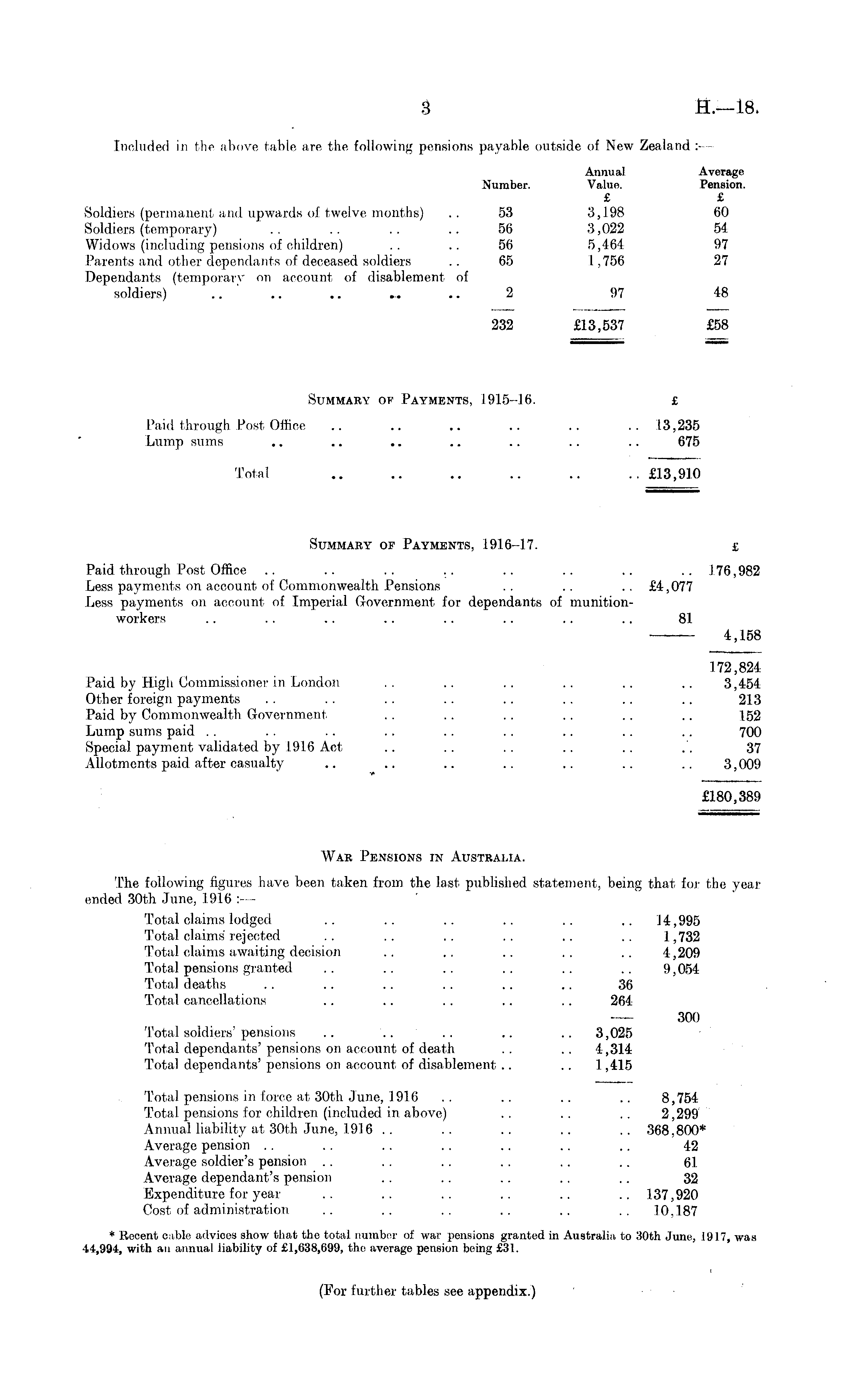 Included in the above table are the following pensions payable outside of New Zealand :— Annual Average Number. Value. Pension. £ £ Soldiers (permanent and upwards of twelve months) .. 53 3,198 60 Soldiers (temporary) .. .. .. .. 56 3,022 54 Widows (including pensions of children) .. .. 56 5,464 97 Parents and other dependants of deceased soldiers .. 65 1,756 27 Dependants (temporary on account of disablement of soldiers) .. .. .. ... .. 2 97 48 232 £13,537 £58 Summary op Payments, 1915-16. £ Paid through. Post Office .. .. .. .. .. ..13,235 Lump sums .. .. .. .. .. .. .. 675 Total .. .. .. ... .. .. £13,910 Summary op Payments, 1916-17. £ Paid through Post Office .. .. .. .. .. .. .. .. 176,982 Less payments on account of Commonwealth Pensions .. .. .. £4,077 Less payments on account of Imperial Government for dependants of munitionworkers .. .. .. .. .. .. .. .. 81 4,158 172,824 Paid by High Commissioner in London .. .. .. .. .. .. 3,454 Other foreign payments . . . . . . .. .. .. .. .. 213 Paid by Commonwealth Government .. .. .. .. .. .. 152 Lump sums paid . . .. .. .. .. . . .. .. .. 700 Special payment validated by 1916 Act .. .. .. .. .. .'. 37 Allotments paid after casualty .. .. .. .. .. .. .. 3,009 £180,389 War Pensions in Australia. The following figures have been taken from the last published statement, being that for the year ended 30th June, 1916 ;— Total claims lodged .. .. .. .. .. ..14,995 Total claims' rejected .. .. . . .. .. .. 1,732 Total claims awaiting decision .. .. .. .. .. 4,209 Total pensions granted .. .. .. .. .. .. 9,054 Total deaths .. .. .. .. .. .. 36 Total cancellations .. .. .. .. .. 264 300 Total soldiers'pensions .. '.. .. .. .. 3,025 Total dependants'pensions on account of death .. .. 4,314 Total dependants' pensions on account of disablement .. .. 1,415 Total pensions in force at 30th June, 1916 .. .. .. .. 8,754 Total pensions for children (included in above) .. .. .. 2,299 Annual liability at 30th June, 1916 .. .. .. .. .. 368,800* Average pension .. .. .. .. .. .. .. 42 Average soldier's pension .. .. . . .. .. .. 61 Average dependant's pension . . .. .. .. .. 32 Expenditure for year .. .. .. .. .. .. 137,920 Cost of administration .. .. .. .. .. .. 10,187 * liocent cable advicos show that the total number of war pensions granted in Australia to 30th June, 1917, was 44,994, with an annual liability of £1,638,699, the average pension being £31. (For further tables see appendix.)
