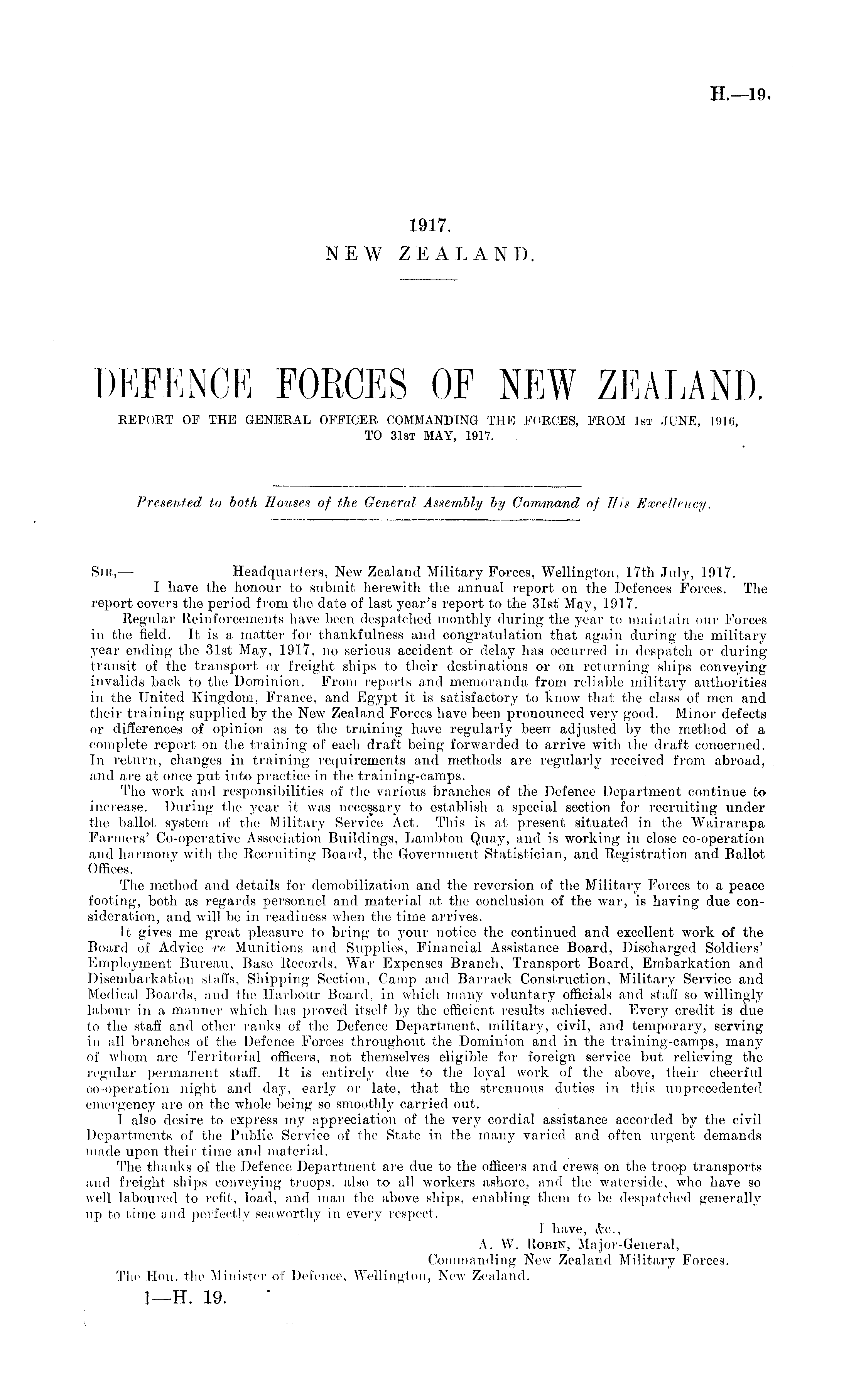DEFENCE FORCES OF NEW ZEALAND. REPORT OF THE GENERAL OFFICER COMMANDING THE FORCES, FROM 1st JUNE, 1916, TO 31st MAY, 1917.