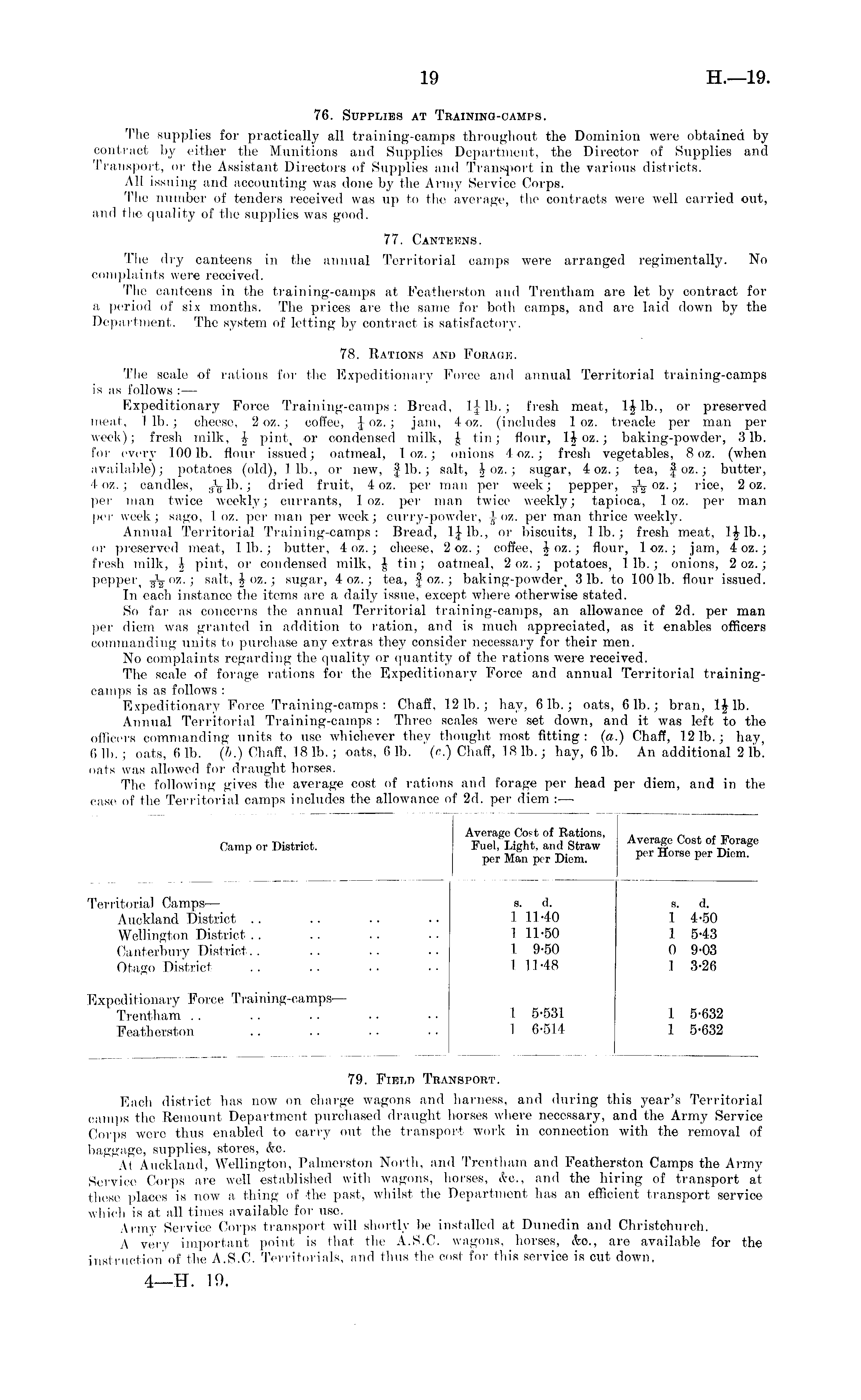 Camp or District. Average Co=t of Rations, Fuel, Light, and Straw per Man per Diem. Average Cost of Forage per Iforse per Diem. Territorial Camps— Auckland District Wellington District Canterbury District. . Otago District s. d. 1 11-40 1 11-50 I 9-50 I 11-48 s. 1 1 0 1 d. 4-50 5-43 9-03 3-26 Expeditionary Force Training-camps— Trentham Featherston 1 5-531 I 6-514 1 1 5-632 5-632