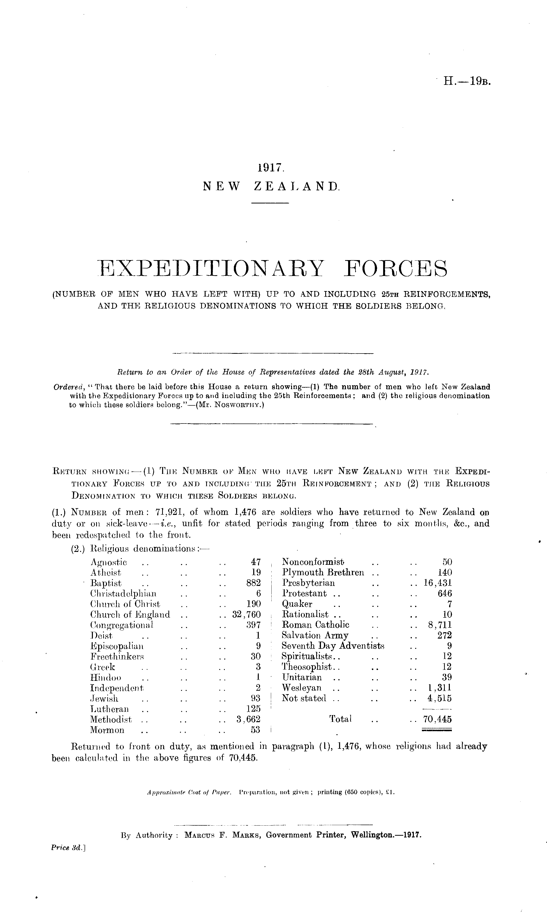 Return showing —(1) The Number of Men who have left New Zealand with the Expeditionary Forces up to and including the 25th Reinforcement ; and (2) the Religious Denomination to which these Soldiers belong. (1.) Number of men : 71,921, of whom 1,476 are .soldiers who have returned to New Zealand on duty or on sick-leave-— i.e., unfit for stated periods ranging from three to six months, &c, and been redespatched to the front. (2.) Religious denominations: — Agnostic .. .. .. 47 Nonconformist .. . . 50 Atheist . . .. . . 19 Plymouth Brethren . . .. 140 • Baptist .. .. .. 882 Presbyterian .. .. 1.6,431 Christadelphian .. . . 6 Protestant .. .. . . 646 Church of Christ .. .. 190 Quaker .. .. .. 7 Church of England .. ..32,760 Rationalist .. .. .. 10 Congregational .. .. 397 Roman Catholic .. .. 8,711 Deist .. .. .. 1 Salvation Army .. .. 272 Episcopalian .. .. 9 Seventh Day Adventists .. 9 Freethinkers .. ... 30 Spiritualists.. .. .. 12 Greek .. .. .. 3 Theosophist.. .. .. 12 Hindoo . . .. .. 1 Unitarian .. .. .. 39 Independent .. .. 2 Wesleyan .. .. .. 1,311 Jewish .. .. .. 93 Not stated .. .. ..4,51.5 Lutheran .. .. .. 125 ——— Methodist .. .. ..3,662 Total .. ..70,445 Mormon .. . . . . 53 ===== Returned to front on duty, as mentioned in paragraph (1), 1,476, whose religions had already been calculated in the above figures of 70,445.