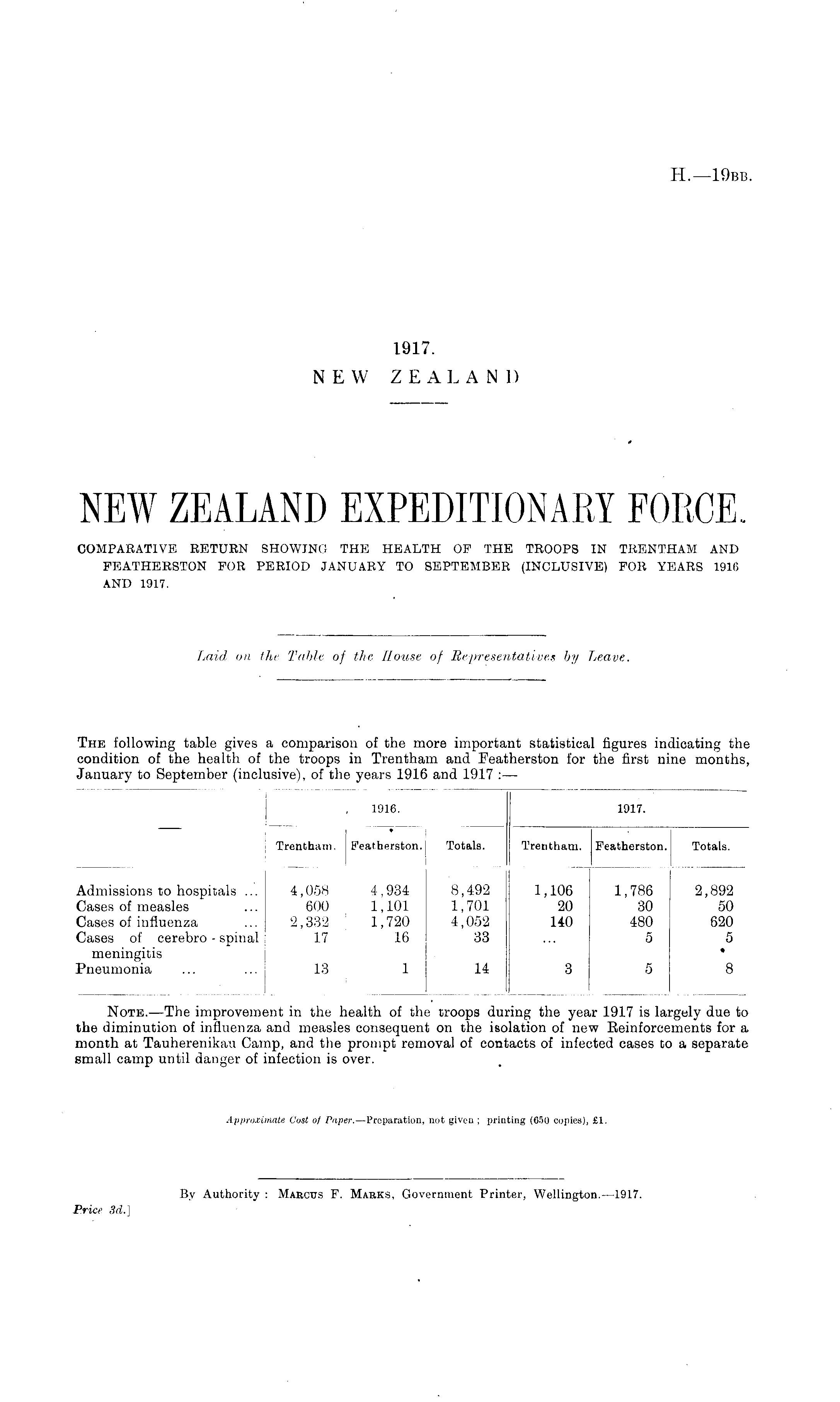 1916. 1917. Trenthani. Featherston. Totals. Trentham. Featherston. Totals. I 8,492 1,701 4,052 33 Admissions to hospitals ... 4,058 4,934 Cases of measles ... 600 1,101 Cases of influenza ... 2,332 1,720 Cases of cerebro - spinal 17 16 meningitis Pneumonia ... ... 13 1 1,106 20 140 1,786 30 480 5 2,892 50 620 5 • 14 3 5 8 I Note.—The improvement in the health of tin the diminution of influenza and measles consequen month at Tauherenikau Camp, and the prompt rem small camp until danger of infection is over. 3 troops du: t on the isc oval of conl •ing the ye* lation of ne acts of infei ir 1917 is lai w Reinforce cted cases tc rgely due to iments for a ) a separate