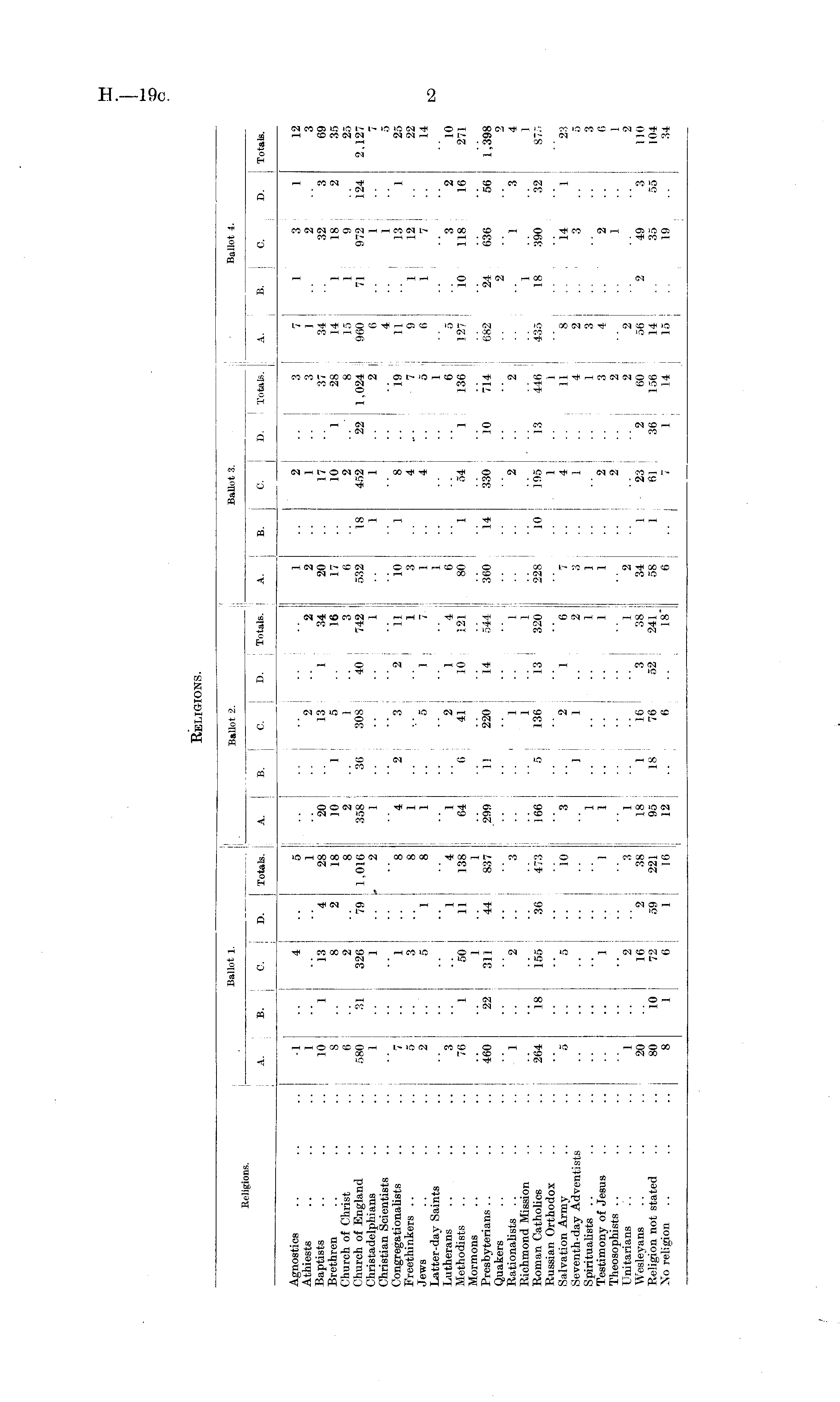 Ballot 1. | Ballot 3. Ballot 4. Ballot 2. - Religions. . A. B. C. D. Totals. A. B. C. D. Totals. ' A. B. C. 1). Totals. A. B. C. D. Totals. Agnostics Athiests Baptists Brethren Church of Christ Church of England Chiistadelphians Christian Scientists Congregationalists Freethinkers Jews Latter-day Saints Lutherans Methodists Mormons Presbyterians Quakers Rationalists Richmond Mission Roman Catholics Russian Orthodox Salvation Army Seventh-day Adventists Spiritualists Testimony of Jesus Theosophists Unitarians Wesleyans Religion not stated No religion "* I -1 10 s 6 580 1 7 5 2 3 76 460 264 5 20 80 8 1 31 4 13 8 2 326 1 1 3 5 5 1 4 28 2 18 8 79 1.016 .. , 2 8 8 1 j 8 20 10 2 358 1 1 36 2 13 5 1 308 1 40 2 34 16 742 1 1 2 20 17 6 532 10 3 1 6 80 360 228 3 1 I 1 2 34 58 6 2 .. 3 1 3 17 .. 37 10 1 28 2 8 18 452 22 1.024 11.. 2 1 8 .. 19 4 ... 7 4 .. 5 1 1 6 1 54 1 136 14 330 10 714 2 .. 2 10 195 13 446 1 .. 1 4 .. 11 1 .. 4 1 2 .. 3 2 .. 2 2 1 23 2 60 1 61 36 ! 156 7 I I 14 7 1 34 14 15 960 6 4 11 9 6 5 127 682 435 8 2 3 4 2 56 14 15 I 1 1 1 7] "l 10 24 1 18 2 3 2 32 18 9 972 1 1 13 I 12 j 7 ■' 3 118 636 390 14 2 1 49 35 19 1 12 3 3 69 2 35 25 124 2.127 7 5 1 25 22 14 2 10 16 271 56 1.398 2 3 4 1 32 875 1 23 5 3 6 1 2 3 110 55 104 34 4 1 1 2 3 5 2 1 11 1 7 - 1 22 50 | 1 I 311 1 4 11 138 44 837 I 64 299' 6 11 2 41 220 1 10 14 4 ■144 18 2 155 '.'. 3 36 47.3 166 3 1 1 5 1 1 1 I 136 2 1 13 1 I 1 320 6 l l •• 5 1 10 1 10 1 2 16 72 6 I I 3 2 38 59 221 1 16 1 18 95 12 1 18 16 76 6 "3 52 1 38 241 18*