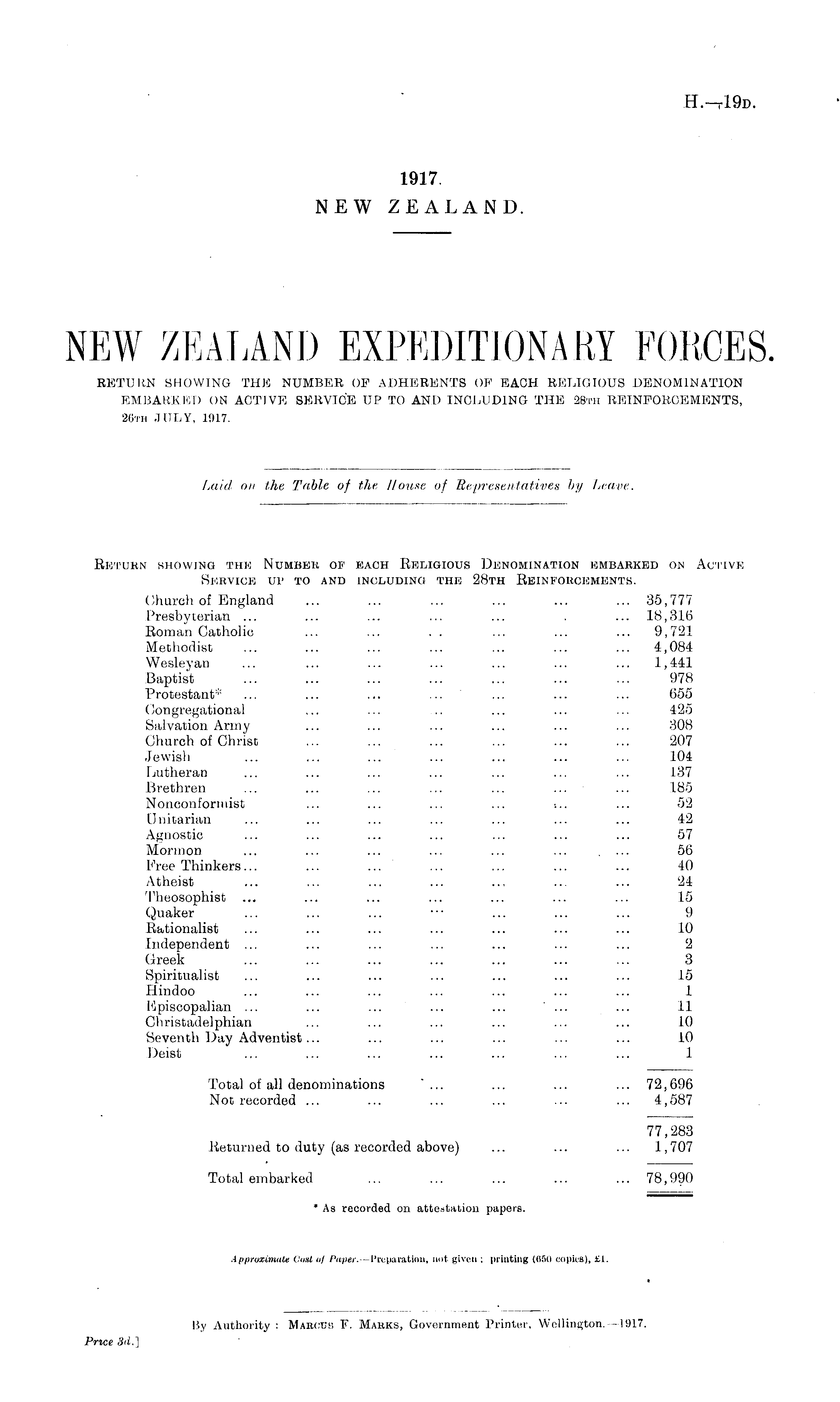 NEW ZEALAND EXPEDITIONARY FORCES. RETURN SHOWING THE NUMBER OF ADHERENTS OF EACH RELIGIOUS DENOMINATION EMBARKED ON ACTIVE SERVICE UP TO AND INCLUDING THE 28th REINFORCEMENTS, 26th JULY, 1917.