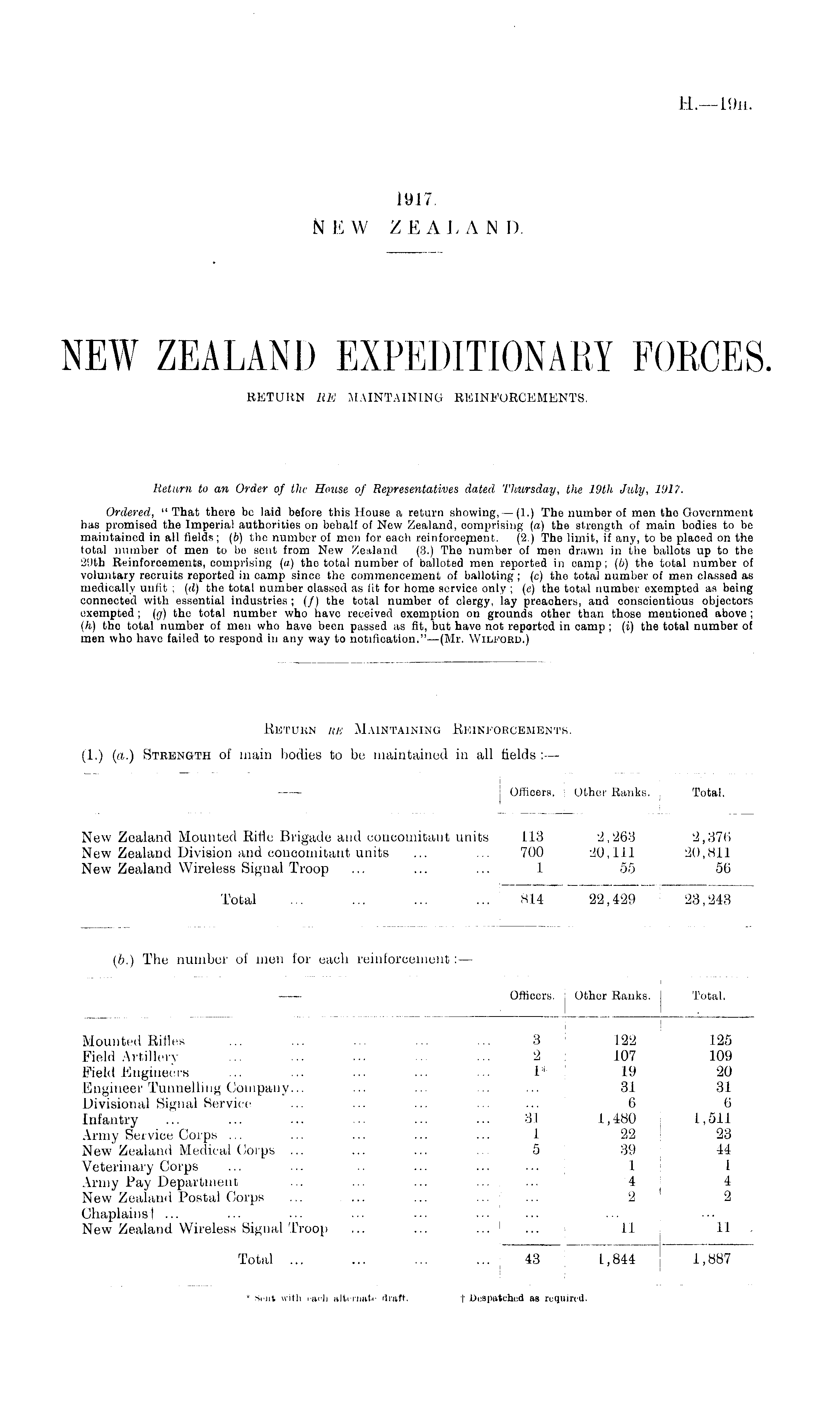 Return to an Order of the House of Representatives dated Thursday, the 19th July, 1917. Ordered, "That there be laid before this House a return showing, — (1.) The number of men tho Government has promised the Imperial authorities on behalf of New Zealand, comprising (a) the strength of main bodies to be maintained in all fields; (b) the number of men for each reinforcement. (2.) The limit, if any, to be placed on the total number of men to bo scut from New Zealand (3.) The number of men drawn in the ballots up to the _'Jth Reinforcements, comprising (a) the total number of balloted men reported in camp; (6) the total number of voluntary recruits reported in camp since the commencement of balloting ; (c) tho total number of men classed as medically unfit ; (d) the total number classed as lit for home service only ; (c) the total number exempted as being connected with essential industries; (/) the total number of clergy, lay preaohers, and conscientious objectors exempted ; (g) the total number who have received exemption on grounds other than those mentioned above; (h) the total number of men who have been passed as fit, but have not reported in camp; (i) the total number of men who have failed to respond in any way to notification."—(Mr. WILFOBD.)