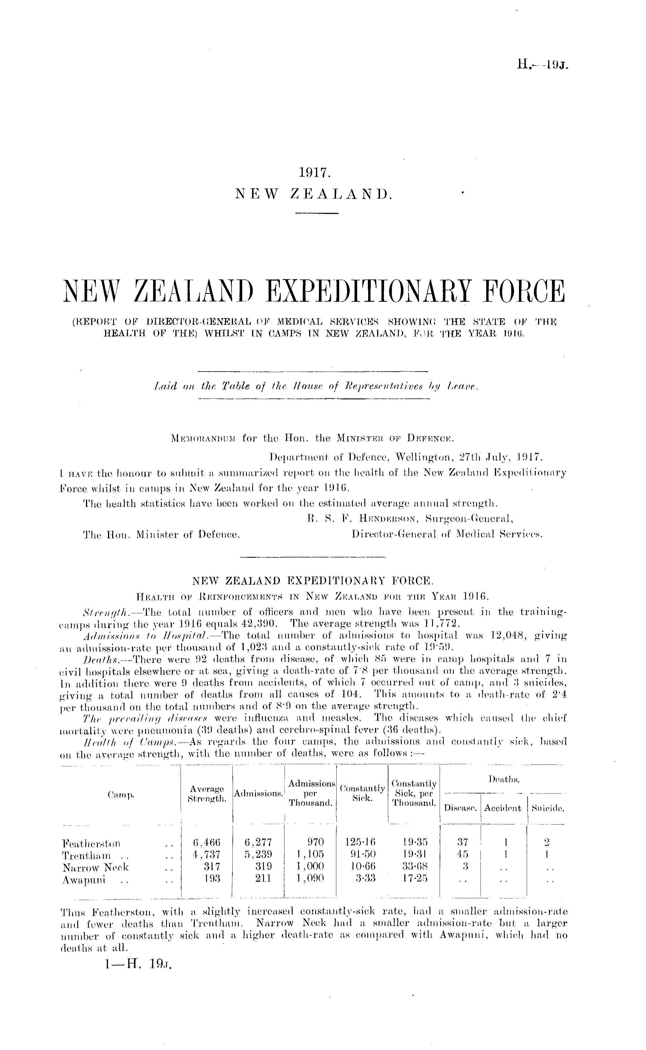 Memorandum for the Hon. the Minister of Defence. Department of Defence, Wellington, 27' th July, 1917. I have the honour to submit a summarized report on the health of the New Zealand Expeditionary Force whilst in camps in New Zealand for the year 1916. The health statistics have been worked on the estimated average annual strength. R. S. F. Henderson, Surgeon-General, The Hon. Minister of Defence. Director-General of Medical Services.