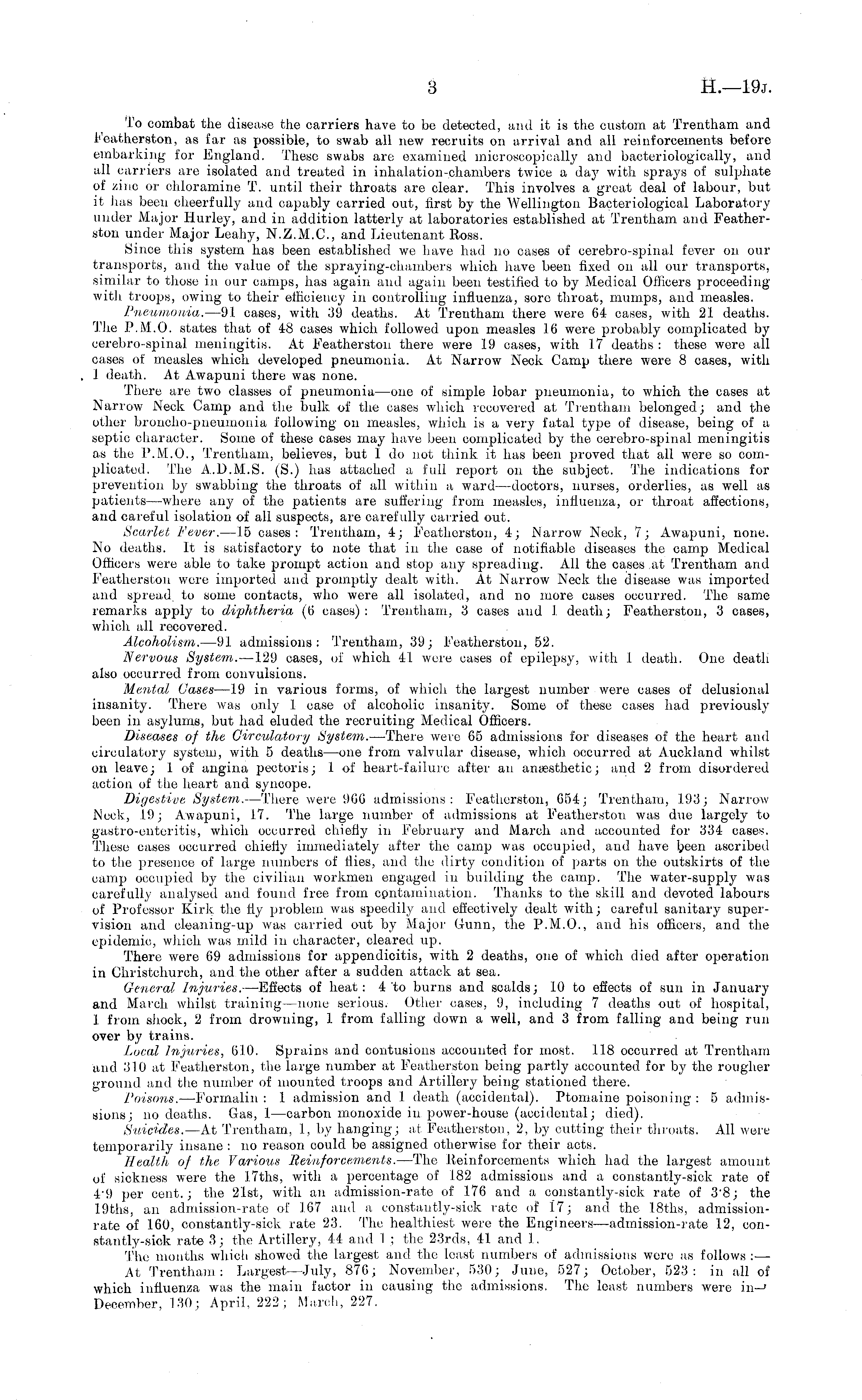 To combat the disease the carriers have to be detected, and it is the custom at Trentham and Featherston, as far as possible, to swab all new recruits on arrival and all reinforcements before embarking for England. These swabs are examined microscopically and bacteriologically, and all carriers are isolated and treated in inhalation-chambers twice a day with sprays of sulphate of zinc or cldoramine T. until their throats are clear. This involves a great deal of labour, but it has been cheerfully and capably carried out, first by the Wellington Bacteriological Laboratory under Major Hurley, and in addition latterly at laboratories established at Trentham and Featherston under Major Leahy, N.Z.M.C, and Lieutenant Ross. Since this system has been established we have had no cases of eerebro-spinal fever on our transports, and the value of the spraying-chambers which have been fixed on all our transports, similar to those in our camps, has again and again been testified to by Medical Officers proceeding with troops, owing to their efficiency in controlling influenza, sore throat, mumps, and measles. Pneumonia. —91 cases, with 39 deaths. At Trentham there were 64 cases, with 21 deaths. The P.M.O. states that of 48 cases which followed upon measles 16 were probably complicated by eerebro-spinal meningitis. At Featherston there were 19 eases, with 17 deaths : these were all eases of measles which developed pneumonia. At Narrow Neck Camp there were 8 cases, with I death. At Awapuni there was none. There are two classes of pneumonia—one of simple lobar pneumonia, to which the cases at Narrow Neck Camp and the bulk of the eases which recovered at Trentham belonged; and the other broncho-pneumonia following on measles, which is a very fatal type of disease, being of a septic character. Some of these cases may have been complicated by the eerebro-spinal meningitis as the P.M.0., Trentham, believes, but I do not think it has been proved that all were so complicated. The A..D.M..5. (S.) has attached a full report on the subject. The indications for prevention by swabbing the throats of all within a ward —doctors, nurses, orderlies, as well as patients—where any of the patients are suffering from measles, influenza, or throat affections, and carefui isolation of all suspects, are carefully carried out. Scarlet Fever. —ls cases: Trentham, 4; Featherston, 4; Narrow Neck, 7; Awapuni, none. No deaths. It is satisfactory to note that in the case of notifiable diseases the camp Medical Officers were able to take prompt action and stop any spreading. All the cases at Trentham and Featherston were imported and promptly dealt with. At Narrow Neck the disease was imported and spread, to some contacts, who were all isolated, and no more cases occurred. The same remarks a])ply to diphtheria (6 cases) : Trentham, 3 cases and 1 death; Featherston, 3 cases, which all recovered. Alcoholism. —91 admissions: Trentham, 39; Featherston, 52. Nervous System. —l 29 cases, of which 41 were eases of epilepsy, with I. death. One death also occurred from convulsions. Mental Cases —l 9 in various forms, of which the largest number were eases of delusional insanity. There was only 1 case of alcoholic insanity. Some of these cases had previouslybeen in asylums, but had eluded the recruiting Medical Officers. Diseases of the Circulatory System. —There were 65 admissions for diseases of the heart and circulatory system, with 5 deaths —one from valvular disease, which occurred at Auckland whilst on leave; 1 of angina pectoris; 1 of heart-failure after an anaesthetic; and 2 from disordered action of the heart and syncope. Digestive System. —There were 966 admissions: Featherston, 654; Trentham, 193; Narrow Neck, 19; Awapuni, 17. The large number of admissions at Featherston was due largely to gastro-enteritis, which occurred chiefly in February and March and accounted for 334 cases. These eases occurred chiefly immediately after the camp was occupied, and have been ascribed to the presence of large numbers of flies, and the dirty condition of parts on the outskirts of the camp occupied by the civilian workmen engaged in building the camp. The water-supply wa.s carefully analysed and found free from contamination. Thanks to the skill and devoted labours of Professor Kirk the fly problem was speedily and effectively dealt with; careful sanitary supervision and cleaning-up was carried out by Major Gunn, the P.M.0., and his officers, and the epidemic, which was mild in character, cleared up. There were 69 admissions for appendicitis, with 2 deaths, one of which died after operation in Christchurch, and the other after a sudden attack at sea. General Injuries. —Effects of heat: 4'to burns and scalds; 10 to effects of sun in January and March whilst training —none serious. Other eases, 9, including 7 deaths out of hospital, 1 from shock, 2 from drowning, 1 from falling down a well, and 3 from falling and being run over by trains. Local Injuries, 610. Sprains and contusions accounted for most. 118 occurred at Trentham and 310 at Featherston, the large number at Featherston being partly accounted for by the rougher ground and the number of mounted troops and Artillery being stationed there. Poisons. —Formalin : 1 admission and I death (accidental). Ptomaine poisoning : 5 admissions; no deaths. Gas, I—carbon monoxide in power-house (accidental; died). Suicides. —At Trentham, 1, by hanging; at Featherston, 2, by cutting their throats. All were temporarily insane : no reason could be assigned otherwise for their acts. Health of the Various Reinforcements. —The Reinforcements which had the largest amount of sickness were the 17ths, with a percentage of 182 admissions and a constantly-sick rate of 49 per cent.; the 21st, with an admission-rate of 176 and a constantly-sick rate of 3'B; the 19ths, an admission-rate of 167 and a constantly-sick rate of 17; and the 18ths, admissionrate of 160, constantly-sick rate 23. T