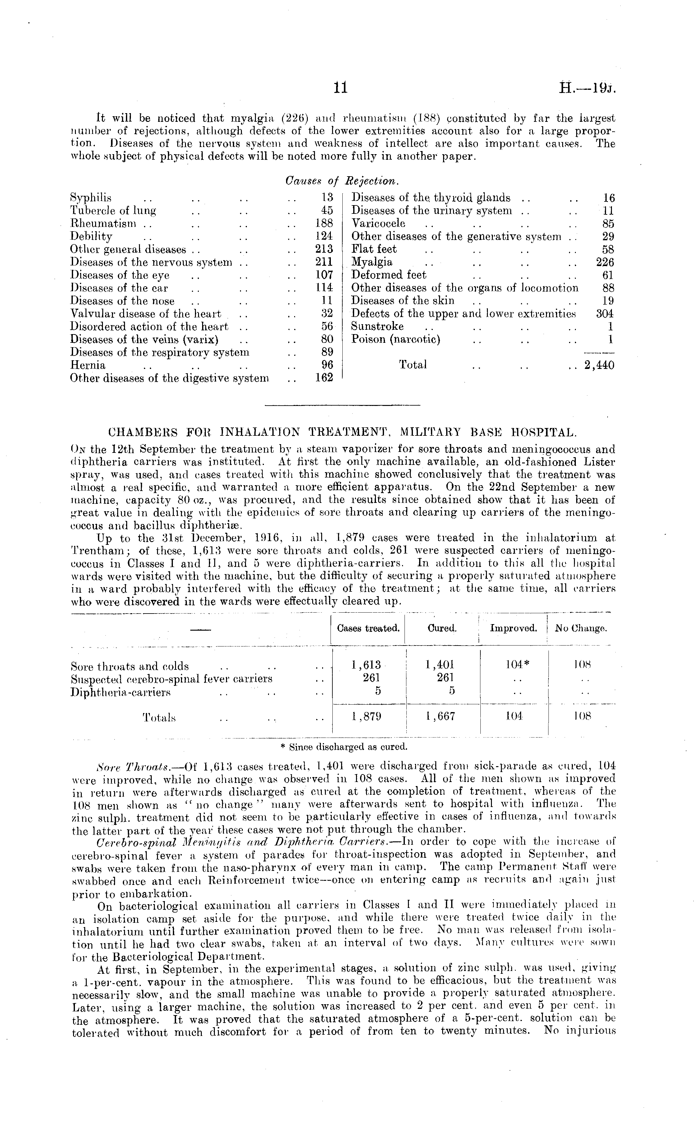 CHAMBERS FOR INHALATION TREATMENT, MILITARY BASK HOSPITAL. On the 12th September the treatment by a steam vaporizer for sore throats and meningococcus and diphtheria carriers was instituted. At first the only machine available, an old-fashioned Lister spray, was used, and cases treated with this machine showed conclusively that the treatment was almost a real specific, and warranted a more efficient apparatus. On the 22nd September a new machine, capacity 80 oz., was procured, and the results since obtained show that it has been of great value in dealing with the epidemics of sore throats and clearing up carriers of the meningococcus and bacillus diphtherias. Up to the 31st December, 1916, in all, 1,879 cases were treated in the iuhalatorium at Trentham; of these, 1,613 were sore throats and colds, 261 were suspected carriers of meningococcus in Classes I and 11, and 5 were diphtheria-carriers. In addition to this all (he hospital wards were visited with the machine, but the difficulty of securing a properly saturated atmosphere in a ward probably interfered with the efficacy of the treatment; at the same time, all carriers who were discovered in the wards were effectually cleared up.