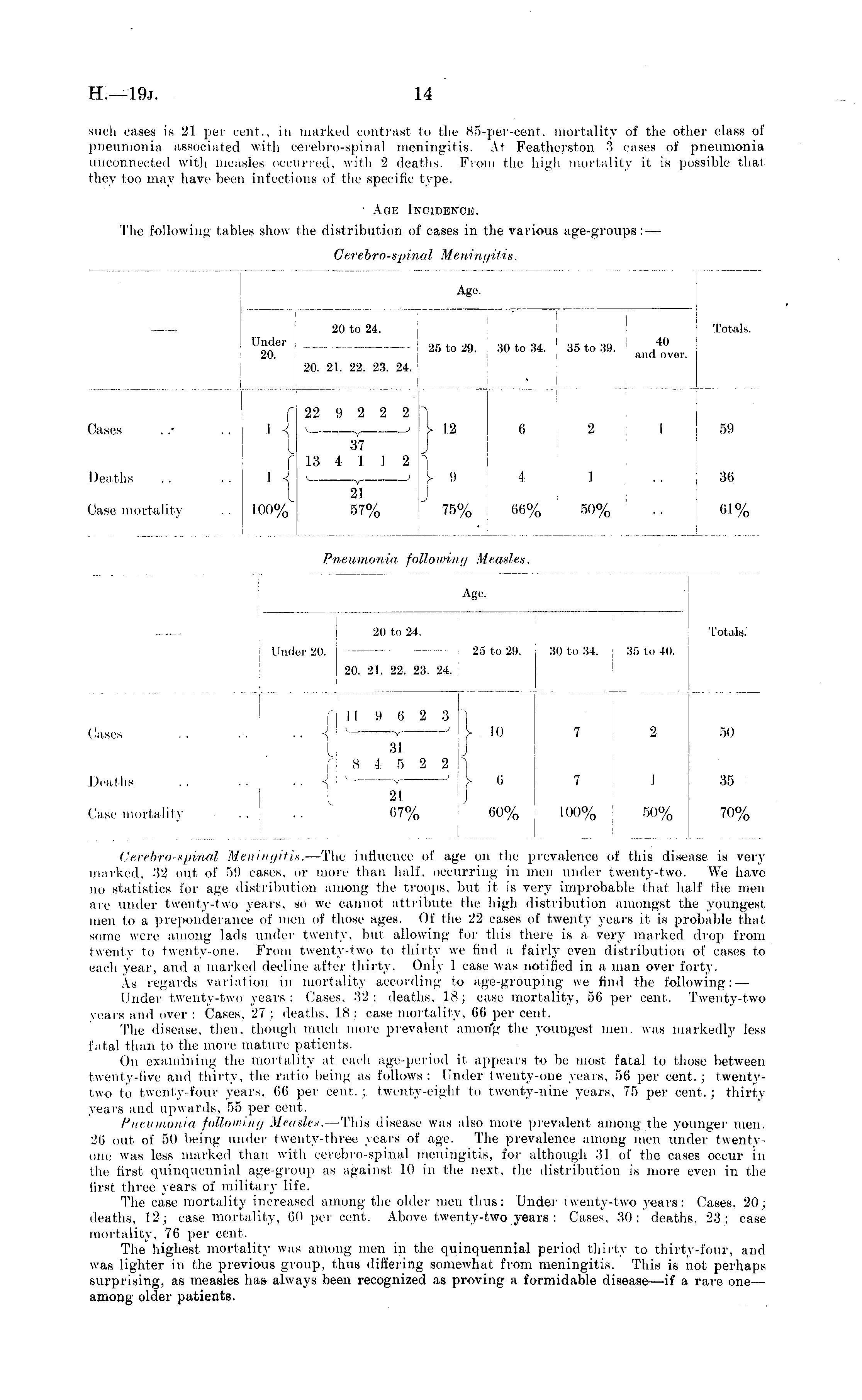 Cerebrospinal Meningitis. —The influence of age on the prevalence of this disease is very marked, 32 out of 59 cases, or more than half, occurring in men under twenty-two. We have no statistics for age distribution among the troops, but it is very improbable that half the men are under twenty-two years, so we cannot attribute the high distribution amongst the youngest men to a preponderance of men of those ages. Of the 22 cases (if twenty years it is probable that some were among lads under twenty, but allowing for this there is a very marked drop from twenty to twenty-one. From twenty-two to thirty we find a fairly even distribution of eases to each year, and a marked decline after thirty. Only I case was notified in a man over forty. As regards variation in mortality according to age-grouping we find the following: — Under twenty-two years: Cases, 32: deaths, 18; case mortality, 56 per cent. Twenty-two years and over : Cases, 27 ; deaths. 18 ; case mortality, 66 per cent. The disease, then, though much more prevalent among the youngest men, was markedly less fatal than to the more mature patients. On examining the mortality at each age-period it appears to be most fatal to those between twenty-live and thirty, the ratio being as follows: Under twenty-one years, 56 per cent.; twentytwo to twenty-four years, 66 per cent. ; twenty-eight to twenty-nine years, 75 per cent. ; thirty years and upwards, 55 per cent. Pneumonia following Measles. —This disease was also more prevalent among the younger men, 26 out of 50 being under twenty-three years of age. The prevalence among men under twentyone was less marked than with cerebro-spinal meningitis, for although 31 of the cases occur in the first quinquennial age-group as against 10 in I he next, the distribution is more even in the first three years of military life. The case mortality increased among the older men thus: Under twenty-two years: Cases, 20; deaths, 12; case mortality, 60 per cent. Above twenty-two years : Cases, 30; deaths, 23; case mortality, 76 per cent. The highest mortality was among men in the quinquennial period thirty to thirty-four, and was lighter in the previous group, thus differing somewhat from meningitis. This is not perhaps surprising, as measles has always been recognized as proving a formidable disease—if a rare one— among older patients.