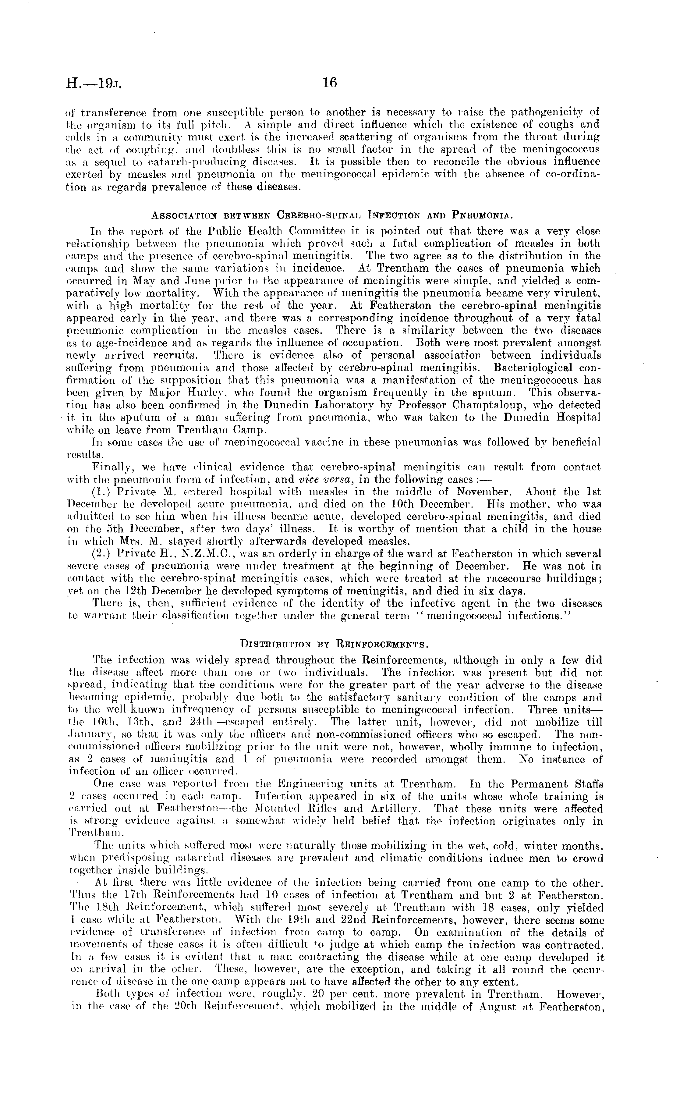 of transference from one susceptible person to another is necessary to raise the pathogenicity of the organism to its full pitch. A simple and direct influence which the existence of coughs and colds in a community must exert is the increased scattering of organisms from the throat during the act of coughing, and doubtless this is no small factor in the spread of the meningococcus as a sequel to catarrh-producing diseases. It is possible then to reconcile the obvious influence exerted by measles and pneumonia on the meningococcal epidemic with the absence of co-ordina-tion as regards prevalence of these diseases. Association between Cerebro-spinal Infection anh Pneumonia. In the report of the Public Health Committee it is pointed out that there was a very close relationship between the pneumonia which proved such a fatal complication of measles in both camps and the presence of cerebro-spinal meningitis. The two agree as to the distribution in the camps and show the same variations in incidence. At Trentham the cases of pneumonia which occurred in May and June prior to the appearance of meningitis were simple, and yielded a comparatively low mortality. AVith the appearance of meningitis the pneumonia became very virulent, with a high mortality for the rest of the year. At Featherston the cerebro-spinal meningitis appeared early in the year, and there was a corresponding incidence throughout of a very fatal pneumonic complication in the measles cases. There is a similarity between the two diseases as to age-incidence and as regards the influence of occupation. Both were most prevalent amongst newly arrived recruits. There is evidence also of personal association between individuals suffering from pneumonia and those affected by cerebro-spinal meningitis. Bacteriological confirmation of the supposition that this pneumonia was a manifestation of the meningococcus has been given by Major Hurley, who found the organism frequently in the sputum. This observation has also been confirmed in the Dunedin Laboratory by Professor Champtaloup, who detected it in the sputum of a man suffering from pneumonia, who was taken to the Dunedin Hospital while on leave from Trentham Camp. In some cases the use of meningococcal vaccine in these pneumonias was followed by beneficial results. Finally, we have clinical evidence that cerebro-spinal meningitis can result from contact with the pneumonia form of infection, and vice versa, in the following cases : — (1.) Private M. entered hospital with measles in the middle of November. About the lst December he developed acute pneumonia, and died on the 10th December. His mother, who was admitted to see him when his illness became acute, developed cerebro-spinal meningitis, and died on the sth December, after two days' illness. It is worthy of mention that a child in the house in which Mrs. M. stayed shortly afterwards developed measles. (2.) Private H., N.Z.M.C., was an. orderly in charge of the ward at Featherston in which several severe cases of pneumonia were under treatment a,t the beginning of December. He was not in contact with the cerebro-spinal meningitis eases, which were treated at the racecourse buildings; yet, on the 12th December he developed symptoms of meningitis, and died in six days. There is, then, sufficient evidence of the identity of the infective agent in the two diseases to warrant their classification together under the general term "meningococcal infections." Distribution by Reinforcements. The infection was widely spread throughout the Reinforcements, although in only a few did the disease affect more than one or two individuals. The infection was present but did not spread, indicating that the conditions were for the greater part of the year adverse to the disease becoming epidemic, probably due both to the satisfactory sanitary condition of the camps and to the well-known infrequency of persons susceptible to meningococcal infection. Three units— the 10th, 13th, and 24th —escaped entirely. The latter unit, however, did not mobilize till January, so that it was only the officers and non-commissioned officers who so escaped. The noncommissioned officers mobilizing prior to the unit were not, however, wholly immune to infection, as 2 cases of meningitis and 1 of pneumonia, were recorded amongst them. No instance of infection of an officer occurred. One case was reported from the Engineering units at Trentham. In the Permanent Staffs 2 cases occurred in each camp. Infection appeared in six of the units whose whole training is carried out at Featherston—the Mounted Rifles and Artillery. That these units were affected is strong evidence against a, somewhat widely held belief that the infection originates only in Trentham. The units which suffered most were naturally those mobilizing in the wet, cold, winter months, when predisposing catarrhal diseases are prevalent and climatic conditions induce men to crowd together inside buildings. At first there was little evidence of the infection being carried from one camp to the other. Thus the 17th Reinforcements had 10 eases of infection at Trentham and but 2 at Featherston. The 18th Reinforcement, which suffered most severely at Trentham with 18 cases, only yielded 1 case while at Featherston. With the I 9th and 22nd Reinforcements, however, there seems some evidence of transference of infection from camp to camp. On examination of the details of movements of these cases it is often difficult to judge at which camp the infection was contracted. In a few cases it is evident that a man contracting the disease while at one camp developed it on arrival in the other. These, however, are the exception, and taking it all round the occurrence of disease in the one camp appears not to have affected the other to any extent. Both types of infection were, roughly, 20 per cent, more prevalent in Trentham. However, in the case of the 20th Reinforcement, which mobilized in the middle of August at, Feathers
