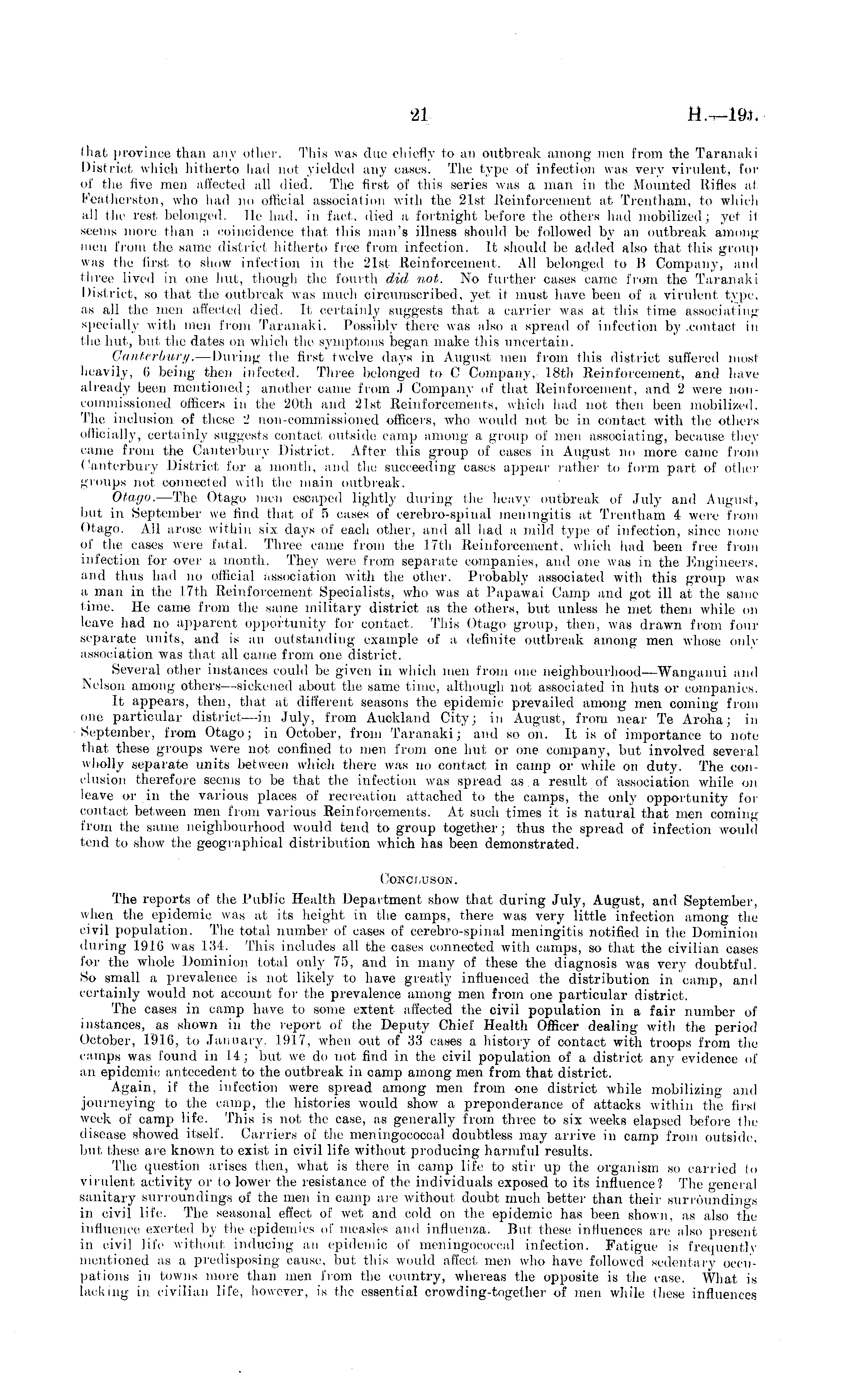 that province than any other. This was due chiefly to an outbreak among men from the Taranaki District which hitherto had not yielded any cases. The type of infection was very virulent, for of the five men affected all died. The first of this series was a man in the Mounted Rifles at Featherston, who had no official association with the 21st Reinforcement at Trentham, to which all the rest, belonged. lie had. in fact, died a fortnight before the others had mobilized; yet it seems more than a coincidence that this man's illness should be followed by an outbreak among men from the same district hitherto free from infection. It should be added also that this group was the first to show infection in the 21st Reinforcement. All belonged to B Company, and three lived in one hut, though the fourth did, not. No further cases came from the Taranaki District, so that the outbreak was much circumscribed, yet it must have been of a, virulent type, as all the men affected died. It certainly suggests that a carrier was at, this time associating specially with men from Taranaki. Possibly there was also a spread of infection by .contact in the hut, but the dates on which the symptoms began make this uncertain. Canterbury. —During the first twelve days in August: men from this district suffered most heavily, 6 being then infected. Three belonged to C Company, 18th Reinforcement, and have already been mentioned; another came from J Company of that Reinforcement, and 2 were noncommissioned officers in the 20th and 21st Reinforcements, which had not then been mobilized. The. inclusion of these 2 non-commissioned officers, who would not be in contact with the others officially, certainly suggests contact, outside cam]) among a group of men associating, because they came from the Canterbury District. After this group of eases in August: no more came from Canterbury District, for a month, and the succeeding cases appear rather to form part of other groups not connected with the main outbreak. Otago. —The Otago men escaped lightly during the heavy outbreak of July and August, but in September we find that of 5 eases of cerebro-spinal meningitis at Trentham 4 were from Otago. All arose within six days of each other, anil all had a mild type of infection, since none of the cases were fatal. Three came from the 17th Reinforcement, which had been free from infection for over a, month. They were from separate companies, and one was in the Engineers, and thus had no official association with the other. Probably associated with this group was a man in the 17th Reinforcement Specialists, who was at Papawai Camp and got ill at the same time. He came from the same military district as the others, but unless he met them while on leave had no apparent opportunity for contact. This Otago group, then, was drawn from four separate units, and is an outstanding example of a definite outbreak among men whose only association was that all came from one district. Several other instances could be given in which men from one neighbourhood—Wanganui and Nelson among others—sickened about the same time, although not associated in huts or companies. It appears, then, that at different seasons the epidemic prevailed among men coming from one particular district—in July, from Auckland City; in August, from near Te Aroha; in September, from Otago; in October, from Taranaki; and so on. It is of importance to note that these groups were not confined to men from one hut or one company, but involved several wholly separate units between which there was no contact in camp or while on duty. The conclusion therefore seems to be that the infection was spread as a result of association while on leave or in the various places of recreation attached to the camps, the only opportunity for contact between men from various Reinforcements. At such times it is natural that men coming from the same neighbourhood would tend to group together; thus the spread of infection would tend to show the geographical distribution which has been demonstrated. Concluson. The reports of the Public Health Department show that during July, August, and September, when the epidemic was at its height in the camps, there was very little infection among the civil population. The total number of eases of cerebro-spinal meningitis notified in the Dominion during 1916 was 134. This includes all the cases connected with camps, so that the civilian cases for the whole Dominion total only 75, and in many of these the diagnosis was very doubtful. So small a prevalence is not likely to have greatly influenced the distribution in camp, and certainly would not account for the prevalence among men from one particular district. The cases in camp have to some extent affected the civil population in a fair number of instances, as shown in the report of the Deputy Chief Health Officer dealing with the period October, IDI6, to January. 1917, when out of 33 cases a history of contact with troops from the camps was found in 14; but we do not find in the civil population of a district any evidence of an epidemic antecedent to the outbreak in camp among men from that district. Again, if the infection were spread among men from one district while mobilizing and journeying to the camp, the histories would show a preponderance of attacks within the first week of camp life. This is not the case, as generally from three to six weeks elapsed before tindisease showed itself. Carriers of the meningococcal doubtless may arrive in camp from outside, but these are known to exist in civil life without producing harmful results. The question arises then, what is there in camp life to stir up the organism so carried to virulent activity or to lower the resistance of the individuals exposed to its influence? The general sanitary surroundings of the men in camp are without doubt much better than their surr6undings in civil life. The seasonal effect of wet and cold on the epidemic has been shown, as also