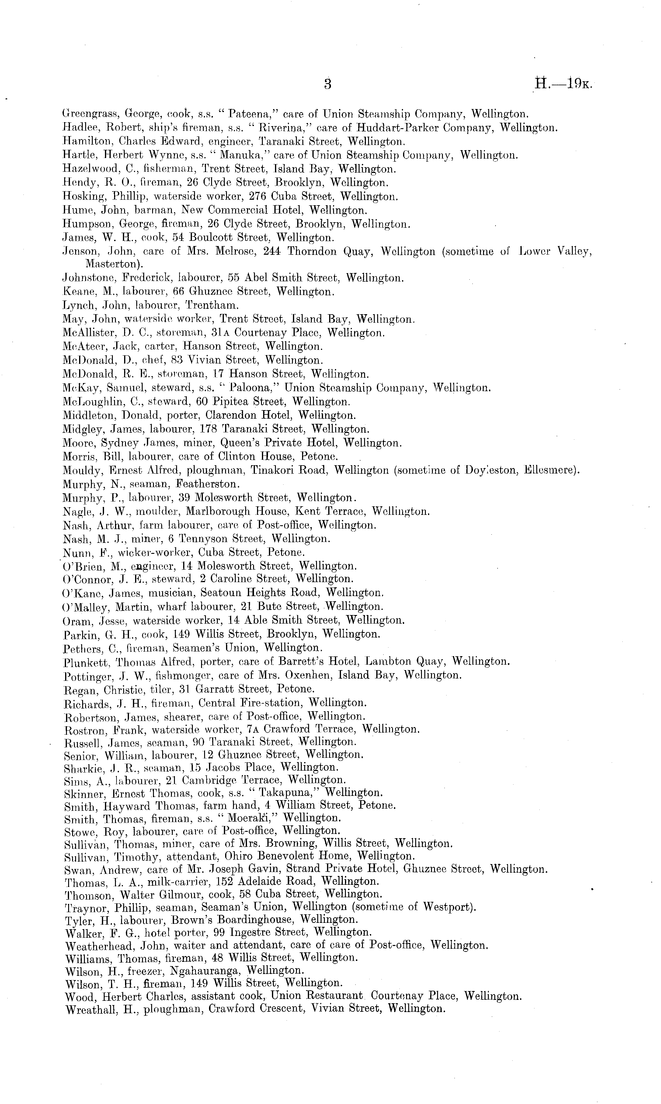 Greengrass, George, cook, s.s. " Pateena," care of Union Steamship Company, Wellington. Hadlee, Robert, ship's fireman, s.s. " Riverina," care of Huddart-Parker Company, Wellington. Hamilton, Charles Edward, engineer, Taranaki Street, Wellington. Hartle, Herbert Wynne, s.s. " Manuka," care of Union Steamship Company, Wellington. Hazelwood, C, fisherman, Trent Street, Island Bay, Wellington. Hendy, R. 0., fireman, 26 Clyde Street, Brooklyn, Wellington. Hosking, Phillip, waterside worker, 276 Cuba Street, Wellington. Hume, John, barman, New Commercial Hotel, Wellington. Humpson, George, fireman, 26 Clyde Street, Brooklyn, Wellington. .Tames, W. H, cook, 54 Boulcott Street, Wellington. Jenson, John, care of Mrs. Melrose, 244 Thorndon Quay, Wellington (sometime of Lower Valley Masterton). Johnstone, Frederick, labourer, 55 Abel Smith Street, Wellington. Keane, M., labourer, 66 Ghuzncc Street, Wellington. Lynch, John, labourer, Trentham. May, John, waterside worker, Trent Street, Island Bay, Wellington. McAllister, D. G, storeman, 31a Courtenay Place, Wellington. McAteer, Jack, carter, Hanson Street, Wellington. McDonald, D., chef, 83 Vivian Street, Wellington. McDonald, R. E., storeman, 17 Hanson Street, Wellington. McKay, Samuel, steward, s.s. " Paloona," Union Steamship Company, Wellington. McLoughlin, G, steward, 60 Pipitea Street, Wellington. Middleton, Donald, porter, Clarendon Hotel, Wellington. Midgley, James, labourer, 178 Taranaki Street, Wellington. Moore, Sydney James, miner, Queen's Private Hotel, Wellington. Morris, Bill, labourer, care of Clinton House, Petone. Mouldy, Ernest Alfred, ploughman, Tinakori Road, Wellington (sometime of Doyieston, Ellestnere). Murphy, N., seaman, Featherston. Murphy, P., labourer, 39 Molesworth Street, Wellington. Nagle, J. W., moulder, Marlborough House, Kent Terrace, Wellington. Nash, Arthur, farm labourer, care of Post-office, Wellington. Nash, M. J., miner, 6 Tennyson Street, Wellington. Nunn, F., wicker-worker, Cuba Street, Petone. O'Brien, M., engineer, 14 Molesworth Street, Wellington. O'Connor, J. E., steward, 2 Caroline Street, Wellington. O'Kane, James, musician, Seatoun Heights Road, Wellington. O'Malley, Martin, wharf labourer, 21 Bute Street, Wellington. Oram, Jesse, waterside worker, 14 Able Smith Street, Wellington. Parkin, G. H., cook, 149 Willis Street, Brooklyn, Wellington. Pethers, C, fireman, Seamen's Union, Wellington. Plunkett, Thomas Alfred, porter, care of Barrett's Hotel, Lambton Quay, Wellington. Pottinger, J. W., fishmonger, care of Mrs. Oxenhen, Island Bay, Wellington. Regan, Christie, tiler, 31 Garratt Street, Petone. Richards, J. H., fireman, Central Fire-station, Wellington. Robertson, James, shearer, care of Post-office, Wellington. Rostron, Frank, waterside worker, 7a Crawford Terrace, Wellington. Russell, James, seaman, 90 Taranaki Street, Wellington. Senior, William, labourer, 12 Gliuznee Street, Wellington. Sharkie, J. R., seaman, 15 Jacobs Place, Wellington. Sims, A., labourer, 21 Cambridge Terrace, Wellington. Skinner, Ernest Thomas, cook, s.s. " Takapuna," Wellington. Smith, Hayward Thomas, farm hand, 4 William Street, Petone. Smith, Thomas, fireman, s.s. " Moeraki," Wellington. Stowe, Roy, labourer, care of Post-office, Wellington. Sullivan, Thomas, minor, care of Mrs. Browning, Willis Street, Wellington. Sullivan, Timothy, attendant, Ohiro Benevolent Home, Wellington. Swan, Andrew, care of Mr. Joseph Gavin, Strand Private Hotel, Ghuznee Street, Wellington. Thomas, L. A., milk-carrier, 152 Adelaide Road, Wellington. Thomson, Walter Gilmour, cook, 58 Cuba Street, Wellington. Traynor, Phillip, seaman, Seaman's Union, Wellington (sometime of Westport). Tyler, H., labourer, Brown's Boardmghousc, Wellington. Walker, F. G., hotel porter, 99 Ingestre Street, Wellington. Weatherhead, John, waiter and attendant, care of care of Post-office, Wellington. Williams, Thomas, fireman, 48 Willis Street, Wellington. Wilson, H., freezer, Ngahauranga, Wellington. Wilson, T. H, fireman, 149 Willis Street, Wellington. Wood, Herbert Charles, assistant cook, Union Restaurant Courtenay Place, Wellington. Wrcathall, H, ploughman, Crawford Crescent, Vivian Street, Wellington.