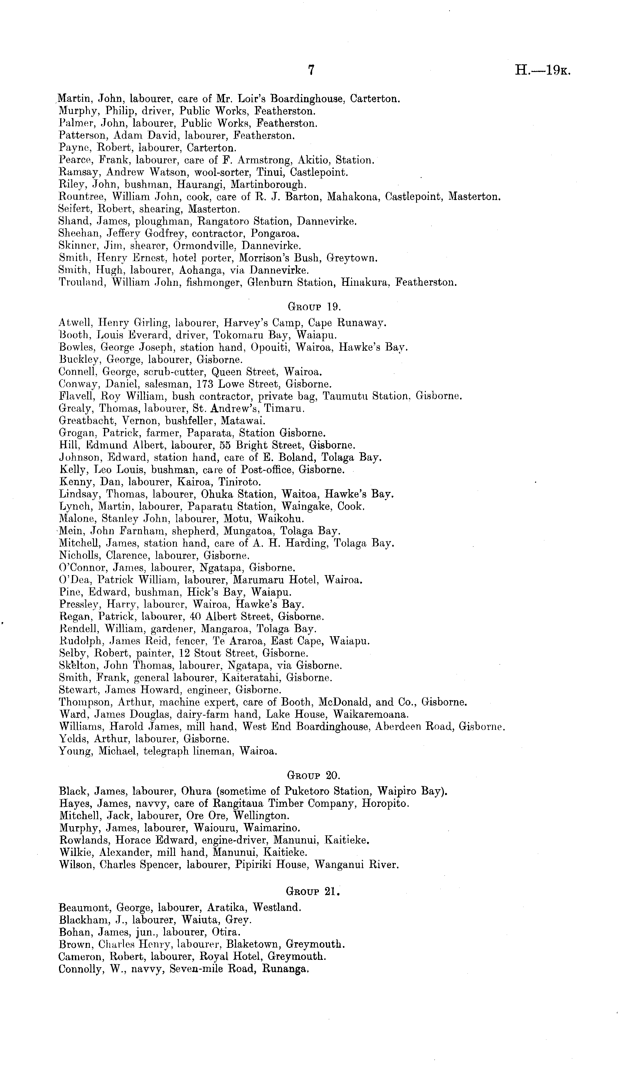 Martin, John, labourer, care of Mr. Loir's Boardinghouse, Carterton. Murphy, Philip, driver, Public Works, Featherston. Palmer, John, labourer, Public Works, Featherston. Patterson, Adam David, labourer, Featherston. Payne, Robert, labourer, Carterton. Pearce, Frank, labourer, care of F. Armstrong, Akitio, Station. Ramsay, Andrew Watson, wool-sorter, Tinui, Castlepoint. Riley, John, bushman, Haurangi, Martinborough. Rountree, William John, cook, care of R. J. Barton, Mahakona, Castlepoint, Masterton. Seifert, Robert, shearing, Masterton. Shand, James, ploughman, Rangatoro Station, Dannevirke. Sheehan, Jeffery Godfrey, contractor, Pongaroa. Skinner, Jim, shearer, Ormondville, Dannevirke. Smith, Henry Ernest, hotel porter, Morrison's Bush, Greytown. Smith, Hugh, labourer, Aohanga, via Dannevirke. Trouland, William John, fishmonger, Glenburn Station, Hinakura, Featherston. Group 19. Atwell, Henry Girling, labourer, Harvey's Camp, Cape Runaway. Booth, Louis Everard, driver, Tokomaru Bay, Waiapu. Bowles, George Joseph, station hand, Opouiti, Wairoa, Hawke's Bay. Buckley, George, labourer, Gisborne. Connell, George, scrub-cutter, Queen Street, Wairoa. Conway, Daniel, salesman, 173 Lowe Street, Gisborne. Flavell, Roy William, bush contractor, private bag, Taumutu Station, Gisborne. Grealy, Thomas, labourer, St. Andrew's, Timaru. Greatbacht, Vernon, bushfeller, Matawai. Grogan, Patrick, farmer, Paparata, Station Gisborne. Hill, Edmund Albert, labourer, 55 Bright Street, Gisborne. Johnson, Edward, station hand, care of E. Boland, Tolaga Bay. Kelly, Leo Louis, bushman, care of Post-office, Gisborne. Kenny, Dan, labourer, Kairoa, Tiniroto. Lindsay, Thomas, labourer, Ohuka Station, Waitoa, Hawke's Bay. Lynch, Martin, labourer, Paparatu Station, Waingake, Cook. Malone, Stanley John, labourer, Motu, Waikohu. Mem, John Farnham, shepherd, Mungatoa, Tolaga Bay. Mitchell, James, station hand, care of A. H. Harding, Tolaga Bay. Nicholls, Clarence, labourer, Gisborne. O'Connor, James, labourer, Ngatapa, Gisborne. O'Dca, Patrick William, labourer, Marumaru Hotel, Wairoa. Pine, Edward, bushman, Hick's Bay, Waiapu. Pressley, Harry, labourer, Wairoa, Hawke's Bay. Regan, Patrick, labourer, 40 Albert Street, Gisborne. Rendell, William, gardener, Mangaroa, Tolaga Bay. Rudolph, James Reid, fencer, Te Araroa, East Cape, Waiapu. Selby, Robert, painter, 12 Stout Street, Gisborne. Skelton, John Thomas, labourer, Ngatapa, via Gisborne. Smith, Frank, general labourer, Kaiteratahi, Gisborne. Stewart, James Howard, engineer, Gisborne. Thompson, Arthur, machine expert, care of Booth, McDonald, and Co., Gisborne. Ward, James Douglas, dairy-farm, hand, Lake House, Waikaremoana. Williams, Harold James, mill hand, West End Boardinghouse, Aberdeen Road, Gisborne. Velds, Arthur, labourer, Gisborne. Young, Michael, telegraph lineman, Wairoa. Group 20. Black, James, labourer, Ohura (sometime of Puketoro Station, Waipiro Bay). Hayes, James, navvy, care of Rangitaua Timber Company, Horopito. Mitchell, Jack, labourer, Ore Ore, Wellington. Murphy, James, labourer, Waiouru, Waimarino. Rowlands, Horace Edward, engine-driver, Manunui, Kaitieke. Wilkie, Alexander, mill hand, Manunui, Kaitieke. Wilson, Charles Spencer, labourer, Pipiriki House, Wanganui River. Group 21. Beaumont, George, labourer, Aratika, Westland. Blackham, J., labourer, Waiuta, Grey. Bohan, James, jun., labourer, Otira. Brown, Charles Henry, labourer, Blaketown, Greymouth. Cameron, Robert, labourer, Royal Hotel, Greymouth. Connolly, W., navvy, Seven-mile Road, Runanga.