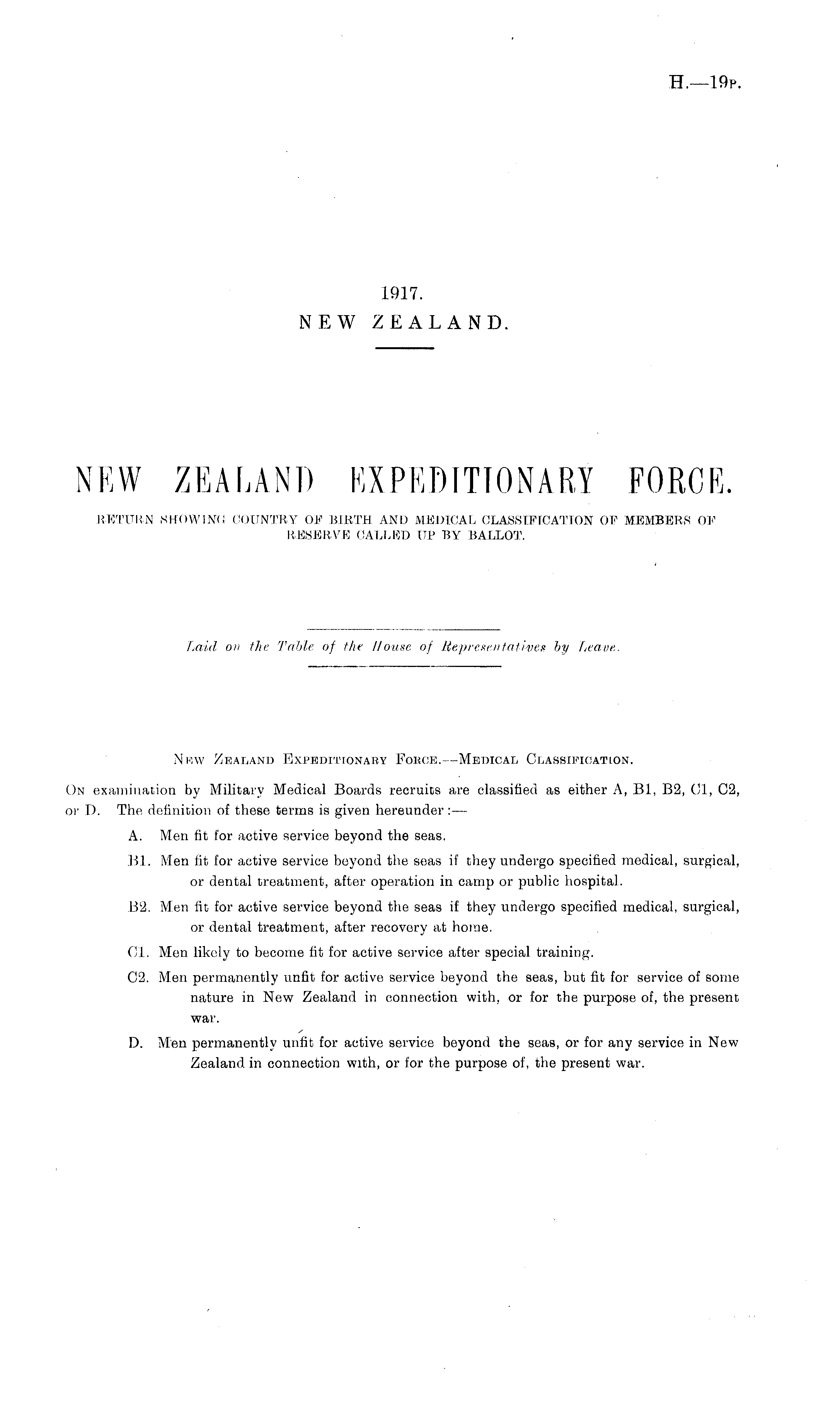 New Zealand Expeditionary Force.—Medical Classification. On examination by Military Medical Boards recruits are classified as either A, 81, 82, 01, C 2, or D. The definition of these terms is given hereunder : — A. Men fit for active service beyond the seas. 81. Men fit for active service beyond the seas if they undergo specified medical, surgical, or dental treatment, after operation in camp or public hospital. 82. Men fit for active service beyond the seas if they undergo specified medical, surgical, or dental treatment, after recovery at home. 01. Men likely to become fit for active service after special training. 02. Men permanently unfit for active service beyond the seas, but fit for service of some nature in New Zealand in connection with, or for the purpose of, the present war. D. Men permanently unfit for active service beyond the seas, or for any service in New Zealand in connection with, or for the purpose of, the present war.