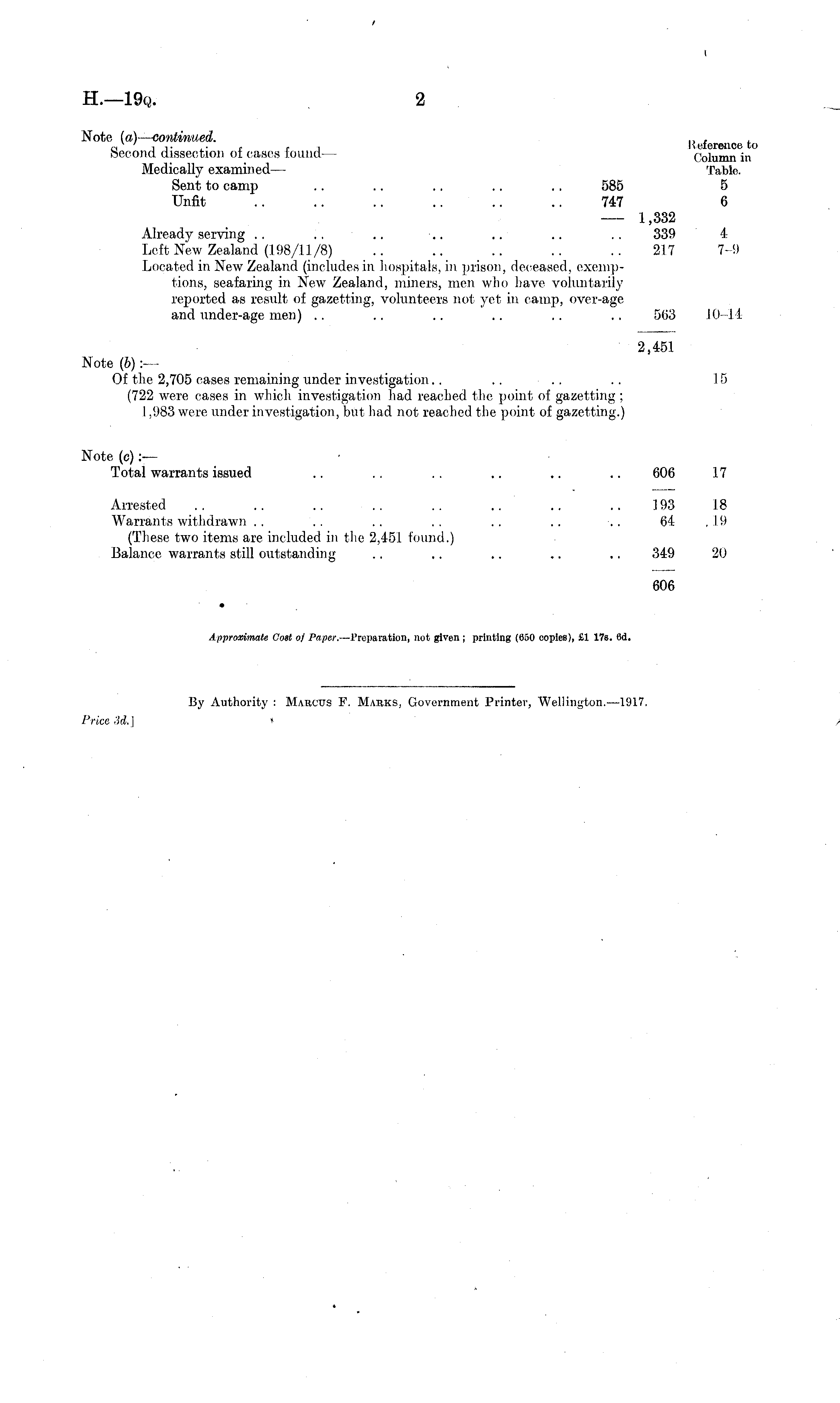 Note (a)—eontmued. ~ , , ail' i- r r i Reference, to Second dissection of cases tound — Column in Medically examined— Table. Sent to camp .. .. .. .. .. 585 5 Unfit .. .. .. .. .. .. 747 6 1,332 Already serving .. .. .. .. .. .. .. 339 4 Left New Zealand (198/11/8) .. .. .. .. .. 217 7-9 Located in New Zealand (includesin hospitals, in prison, deceased, exemptions, seafaring in New Zealand, miners, men who have voluntarily reported as result of gazetting, volunteers not yet in camp, over-age and under-age men) .. .. .. .. .. .. 563 10-14 2,451 Note (b) :■— Of the 2,705 cases remaining under investigation.. .. .. .. 15 (722 were cases in which investigation had reached the point of gazetting ; 1,983 were under investigation, but had not reached the point of gazetting.) Note (c) :— Total warrants issued .. ~ .. .. .. .. 606 17 Arrested .. .. .. .. .. .. .. .. 193 18 Warrants withdrawn . . . . . , . , .. .. .. 64 ,19 (These two items are included in the 2,451 found.) Balance warrants still outstanding .. .. .. .. .. 349 20 606