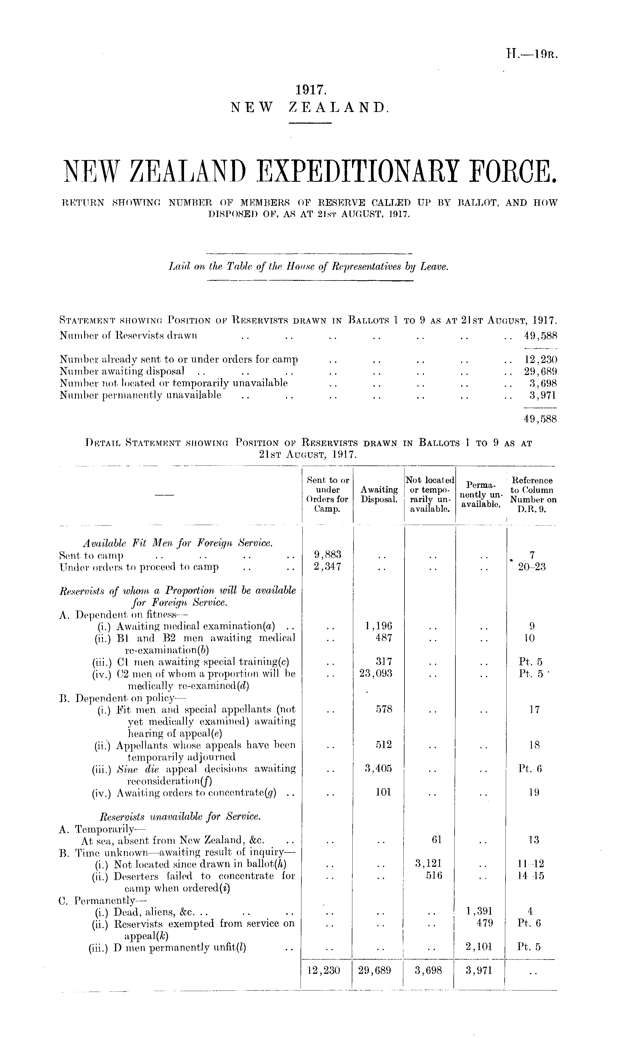 NEW ZEALAND EXPEDITIONARY FORCE. RETURN SHOWING NUMBER OF MEMBERS OF RESERVE CALLED UP BY BALLOT, AND HOW DISPOSED OF, AS AT 21st AUGUST, 1917.