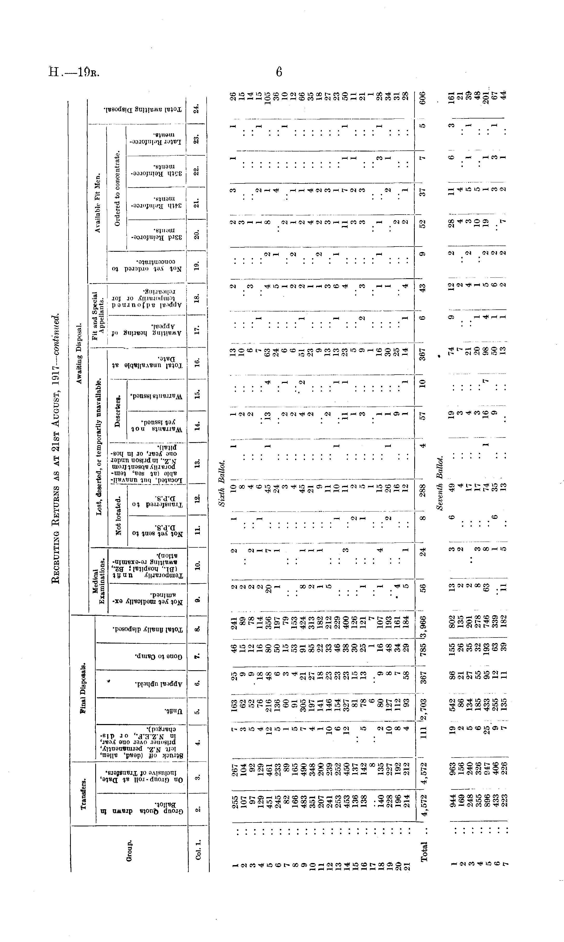 Transfers. Awaiting Disposal. Final Disposals. Medical Examinations. Lost, deserted, or temporarily unavailable. Fit and Appel Special Hants. Available Fit Men. Group. a a a o a o ftca a a aS 08 ABO 0 Sit $.UeZ a.& p^s^^ 3 - 1 - -g =t o \£ a ft p. a -5 to o CO ft a ca 7: H En o ~ es as Srifl Notl< o S oo r icated. c -d i2a -"=! a E as 2 i —1« «: 3 a ■ gaftz;Sa ; r I o cs rt Deserters. d 3 3S ~ cs *3~^ / ex a ■p 2 a P >. a u -a a.*H t. p M P . p a d *a O as o CO rdered to CO g o SI loncentrate. OS CS o — p — a . ' cs hr "3 o H ci P a Col. 1. 2. 3. 4. 5. 6. 7. 9. 10. I 11. 12. 13. 14. 15. It}. 17. 18. 19. 20. 21. 22. 23. 24. Sixth Ballot. 1 2 3 4 5 6 7 8 9 10 11 12 13 14 15 16 17 18 19 20 21 255 107 97 129 451 245 82 166 483 351 207 241 253 453 136 138 267 104 92 129 461 233 89 165 490 348 200 239 252 450 137 142 8 135 227 192 212 7 3 5 4 12 5 1 5 7 4 1 10 6 12 5 2 10 8 4 163 62 52 76 216 136 60 91 305 197 141 146 154 327 81 78 6 80 127 112 93 25 9 . 9 18 48 6 3 4 21 27 18 23 23 23 15 13 46 | 15 ! 12 16 80 50 15 53 91 85 22 33 46 j 38 30 25 16 48 34 29 i 241 89 78 114 356 197 79 153 424 313 182 212 229 400 126 121 7 107 193 161 184 2 2 2 2 20 1 8 2 1 5 2 2 1 7 1 1 1 1 3 4 1 1 10 I 8 4 1 6 45 24 3 4 45 21 9 11 1 10 11 2 2 1 5 1 15 2 26 16 12 1 1 1 1 1 2 2 13 "2 2 4 2 2 11 1 3 1 1 9 1 4 1 ""2 1 1 1 13 I 10 6 j 7 63 24 6 6 51 23 9 13 13 23 5 9 1 16 30 25 14 1 1 1 "2 1 2 3 4 5 1 2 2 1 1 3 6 4 3 1 1 4 "2 1 2 "'2 2 I 3 1 I 1 8 "2 1 2 4 2 3 1 11 3 3 3 2 1 4 1 1 4 2 3 1 7 2 3 1 1 , 1 1 1 1 26 15 14 15 105 36 10 12 66 35 18 27 23 50 11 21 1 28 34 31 28 1 1 1 1 140 228 196 214 9 8 7 58 1 1 1 2 2 2 1 3 1 • 4 5 Total .. 4,572 4,572 Ill '2,703 367 785 ,966 56 24 I 8 I 288 ' 4 57 10 I 367 I 6 43 52 37 7 606 19 2 5 6 25 9 7 155 26 35 32 193 63 39 802 135 201 278 746 339 182 Seventh Ballot. • 28 4 3 10 19 1 2 3 4 5 6 7 944 169 248 355 896 433 223 I 963 156 240 326 947 406 226 542 86 134 185 433 255 135 86 21 27 55 95 12 11 13 2 2 8 63 3 I 2 3 8 1 5 i 6 49 4 17 17 74 1 6 35 13 19 3 4 3 16 9 7 74 7 21 20 98 50 13 Q 1 4 1 1 12 2 4 1 5 6 2 j 2 2 11 4 5 5 1 3 2 I 6 1 3 1 161 21 39 48 201 67 44 2 2 2 1 3 1 I 1 ii 7