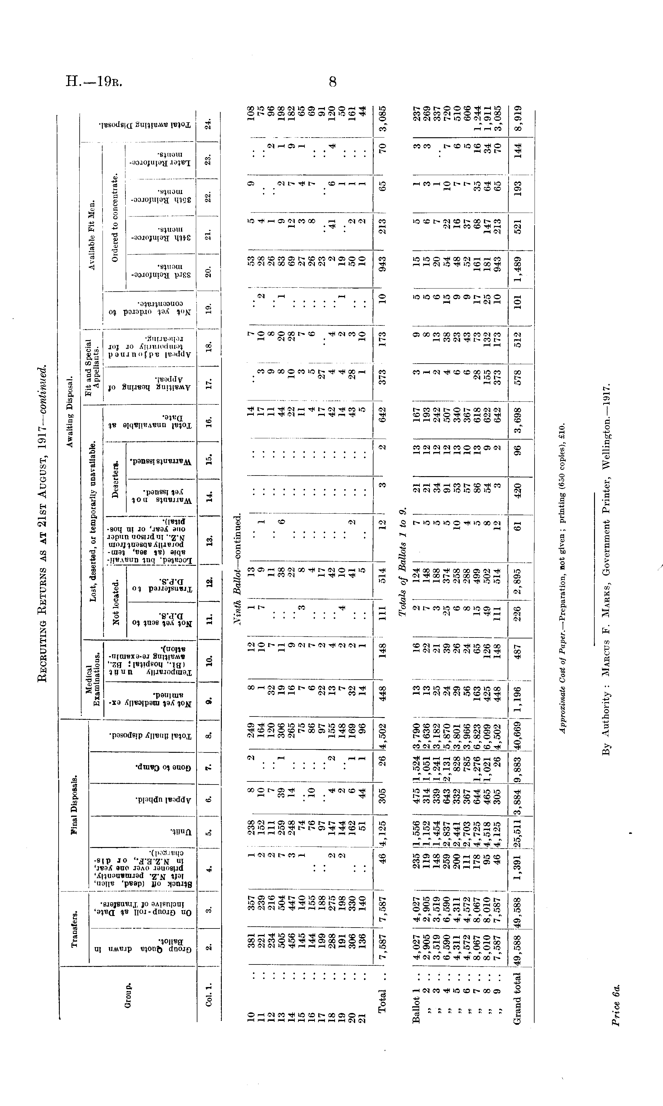 Transfers. I Awaiting Disposal. Final Disposals. a a ■3 a o o ftp: a a PH cS ■3.5 ' 3#s"i Q.2 jag** CO a » t, a a ts g o ° p»h Sa>Ba 7 ° . =6) . ft? «Ni-2-a-9 Js&SS O cc Medical Examinations. Lost, deserted, or temporarily unavailable. Fit and Special | Appellants. Available Fit Men. •0 ■a a EH a ■8 3 rH OS cs "COM a-J <s 3 Not located. L?J!i-S Deaei ■ters. "8 S QS H "3 S3 0S<M .2 S -art °s 3* ! a B ~ HJ a pa -a a ■eg Ordered to concentrate. a ft Group. o is© |o Eh 9 -a a — 1 a— P x H I o 00 = — OQ is cs o *0S 0? — a H* CS o "os a: eo o II r-l d "3 o a a ft ft p. p o d OS ■SO ■p S a "d 3 CJ CS o CO CO & Col. 1. 2. 3. 4. 5. 6. 7. 8. 9. 10. 11. 12. 13. 14. 15. 16. 17. 18. 19. 20. 21. 22. 23. 24. Ninth Ballot--continued. 10 .. 381 11 .. 221 12 .. 234 13 .. 505 14 .. 456 15 .. 145 16 .. 144 17 .. 199 18 .. 288 19 .. 191 20 .. 306 21 .. 136 381 221 234 505 456 145 144 199 288 191 306 136 357 239 216 504 447 140 155 188 275 198 330 140 1 238 2 152 2 ! Ill 7 ! 259 3 248 1 74 76 97 2 147 2 144 162 51 8 10 39 14 io 4 2 6 44 2 1 "2 1 1 249 164 120 306 265 75 86 97 155 148 169 96 8 1 32 19 16 7 6 22 13 7 32 14 12 10 7 11 9 2 7 2 4 2 2 1 1 7 .. '3 13 9 11 38 22 8 4 17 42 10 41 5 1 6 14 17 11 44 22 11 4 17 42 14 43 5 3 9 8 10 3 5 -27 4 4 28 j 1 7 10 8 20 28 7 6 4 2 3 10 "2 1 58 28 26 83 69 27 26 23 2 19 50 10 5 4 1 9 12 3 8 9 2 7 4 7 "2 ' 1 ' 9 ! 1 j 4 10! 9( 19! 181 61 6! 9: 121 5< 16: 4- • " 41 6 1 1 1 4 1 2 2 2 •• Total .. I 7,587 7,587 7,587 46 '4,125 I 305 1 26 14,502 I 448 ! 148 111 514 I 12 642 373 173 10 943 213 65 70 3,08< Ballot 1 .. 4,027 „ 2 .. 2,905 „ 3 .. 3,519 „ 4 .. 6,590 „ 5 .. 4,311 ,. 6 .. 4,572 „ 7 .. 8,067 „ 8 .. 8,010 „ 9 .. 7,587 4,027 2,905 3,519 6,590 4,311 4,572 8,067 8,010 7,587 4,027 I 2,905 : 3,519 6,590 4,311 '< 4,572 8,067 8,010 7,587 235 (1,556 119 :1,152 148 j1,454 259 j 2,837 200 -2,441 111 '2,703 178 14,725 95 ! 4,518 46 [4,125 475 314 339 643 1 332 367 644 465 305 1,524 1,051 1,241 2,131 828 785 1,276 1,021 26 ;3,790 12,636 '3,182 5,870 3,801 3,966 16,823 J6,099 4,502 13 I 13 25 I 24 29 | 56 | 163 425 | 448 j 16 22 21 39 26 24 65 126 148 Toi is of Bt 124 148 188 374 258 288 499 502 514 illots 1 to 167 193 242 507 340 367 618 622 642 3 1 2 4 6 6 28 155 373 9 8 13 38 23 43 73 132 173 15 15 20 54 48 52 161 181 943 5 6 7 22 16 37 68 147 213 1 3 1 10 7 7 35 65 2 7 3 25 6 8 15 49 111 1 5 5 5 10 4 5 8 12 21 21 34 91 53 57 86 54 3 13 12 12 12 13 10 13 9 2 5 5 6 15 9 9 17 25 10 3 3 '7 6 5 16 34 70 23' 26! 33 r 72( 51( 601 1,24 1,91 3,08i Grand total 49,588 J49.588 j 1,391 :25,511 3,884 9,883 :0,669 1,196 487 226 2,895 til 420 96 3,698 578 512 101 1,489 521 193 144 8,91!