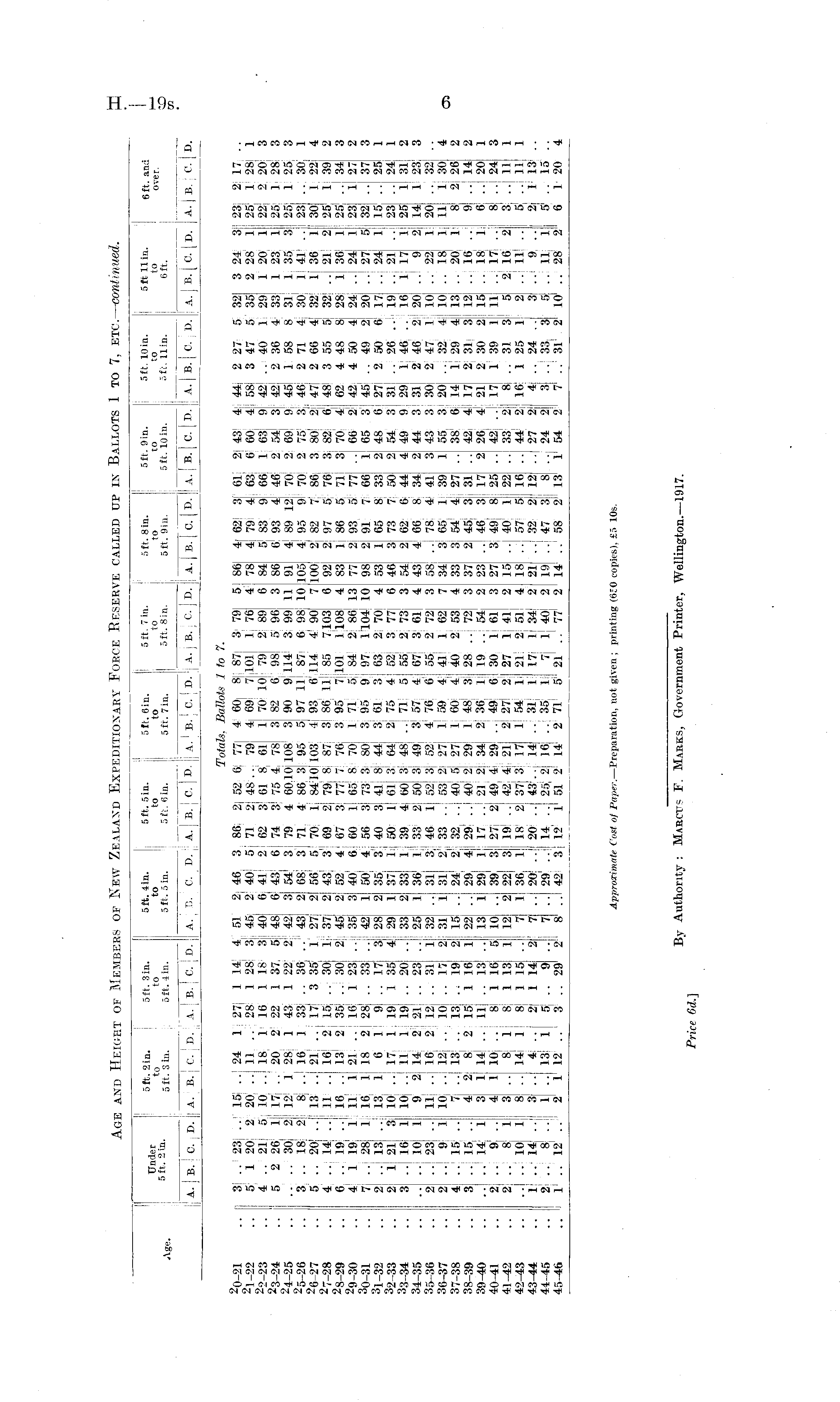 Age and Height of Membe: ■s of New Zealand Expeditionary Force Reserve called up in Ballots 1 to 7, etc. — continued. Age. Under 5 ft. 2 in. 5 ft. 2 in. to 5ft. Sin. 5 ft. 3 in. to 5 ft. 4 in. 5 ft. 4in. to 5 ft. 5 in. 5 ft. oin. to 5 ft. 6 in. 5ft. 6in. to 5 ft. 7 in. 5ft. 7in. to 5ft. 8in. 5 ft. 8 in. to 5ft. Bin. 5ft. 9in. to 5ft. loin. 5ft. 10 in. to 5ft. llin. i 5ft llin. to 6 ft. 1 6 ft. and over. i A. | B. I C. j D. A. | B. I 0. I D. A. B. j C. j D. A. I B. j C. ] D. j] A. B. j C. | D. j A. ' B. \ C. I D. | A. | B. j C. J D. A. | B. | C. [ D. A. [ B. | CI. | B. A. j B. I C. j D. A. j B. j 0. [ D. A. j B. C. j D. Totals, Ballots 1 to 7. 20-21 2l-22 2 2 -23 2.3-24 24-25 25-26 26-27 27-28 2 8-29 2 9-30 30-31 31-32 32-33 33-34 34-35 35-36 36-37 37-38 38-39 39-40 40-41 43-44 44-45 4546 31 ..123! ..' 5 1 20: 2 4 .. 21| 5 5 2 26 1 .. .. 30j 2! 3 .. 18 2 5 .. 20! - - i 4 .. 14 .. 6 .. 19 .. 4 1 19 1 7 .. 28j 1 2 ..! 13 .. 2 1 21 3 3 .. 16 1 .. ..10 1 2 ..] 23 .. 2 ..I 9 1 4 .. 15 .. 3 .. 15 .. .. ..14 1 2 .. 9] .. 2 .. SI .. ..) 10 1 1 .. 14 .. 2 .. 8 ! .. 1 .. 12' .. I 15 : 20 .. 10 .. 17 .. 12 1 8 .. 13 .. 11 .. 16 .. 11 1 16 1 13 1 10 .. 10 .. 9 2 11 .. 4 2 3 1 4 1 3.. 8 .. 3 .. 1 .. 2 1 24 1 27 1 14 11 .. 28 1 28 18 1 16 1 18 20 2 22 1 37 28; 1 43 1 22 16 I 33 .. 36 21 ..17 3 35 16j 2 15 .. 30! 13! 2 35 .. 30l 21 .. 16 1 23 18 2 28 .. 33 6 1 9 .. 17 17 1 19 1 35 111 1 19 .. 20 14 2 21 ..23 16 2! 12 .. 31 12 .. 10 .. 17 13 ..13 .. 19 8 2: 15 1 16 14 .. 11 .. 13 10 .. 8 1 16 8 1 8 1 13 14 1 8 1 15 4 .. 2 1 14] 13 1 5 .. 9 12 .. 3 .. 29 4 51 2 46 3 86, 2 52 6: 77 4 60; 8] 3 45 2| 40 5 71 2 48..: 79 4 69 ! 7j I 3 40 6 4l 2 62 3 61 8J 61 1 70 10 5 48 6 43: 6 74 3 75 4, 78 3 82 6 2 42j 3 54 1 3 79 4 60,10 108 3 90 9 .. 43 2 681 3 71 4 86 3 95 5 97 11 1 27j 2 56 5' 70 1 8410 103 4 93 6 1 37j 2 43] 3" 69 2 79J 8| 87 3 86 11 2 45 2 52 4 67 3 77 7 76 3 95 7: ... 35 3 40 6 60 1 65 8 70 1 71 5 ..42 1 50 4 56 3 73 3 80 3 95 9 3 28 2 35 3 ! l 40 3 41 8 44 3 61 3 4 29 1 37 1 ] 50 1 61 3| 64 2 75 4 .. 33 2 33 1 39 4 60 3] 48 .. 71 5 ..I 25 1 36 1 33 2 50 3! 49 3 57 4 1 32 .. 31 3 46 1 52 3] 52 4 76 6 2 1 31 1 31 2 33 .. 53 2 27 1 59 4 2: 15 .. 24 1 2 32 .. 40 5 27 1 60 4 1 22 .. 29] 4jl 29J .. 40 1 2 1 29 1 48 3 j .. 13 1 29: lj 17 .. 21 2 34 2 36 1 j 5 10 .. 39 3 1 27 2 49, 4 29 .. 49 6 j 1 12 2 22 3 19 1 .. 42 4 21 2 27 2 .. 7 1 36, 1 18 2 37J 3 17 1 54 1 2 7 .. 20! .. 20 .. 43 .. 14 .. 31 1 .. 7 .. 29 .. 14 .. 25 2j 16 .. 35 1 2 8 .. 42i 3 12 1 51 2 14 2 71 5 87 3 1 79 5 101 l] 76 4 1 79 2] 89 6 98 5 96 3 114 3 99J 11 87 6 98 ! 10 114 4 90 7 85 7103 6 101 1108] 4 84 2| 861 13 97 1104 10 63 2 701 4 52 3 77 6 55 2 73 3 67| 3' 61 4 55 2 72 3 41 1 62 7 40 2 53 4 28 ..72 3 19 . . 54 2 30 ll 61 3 27 1 41 2 21 2 51 4 17 1 34 2 7 1 40| 2 21 .. 77 2 86 78 84 86 91 105 100 92 83 77 98 53 46 54 43 58 34 33 37 23 27 15 18 21 19 14 4: 62 3 611 21 4! 79 4 63 6 5 ! 83 9 66 1 6 93 4 46 : 2 4 89 12 70 2 4 95 9 70' 2' 2 82 7 86 3 2 ; 97 5 76| 3! 1 86 5 71 3 2 93 5 77 .. 2 91 7 66| 1 1 65 8 331 2 3 73 7 50 2 2 62 6 44 4 4 66 8 34] 2 ..I 78 4 41 3 3 65 1 39 1 3] 54 1 4 27 .. 2 45 3 31 .. ..! 46 3 17 2 3 49 8 25 .. ..] 40 ! 1 22 .. ..57 5 16 ..] ..32 2 12 ..j ..I 47 3 8 .. ..58 2 13 1 43! 4 44j 2 27 5 32 3 24 3 60, 4 58i 3 47 5 35 2 28 1 63 ; 9 42 .. 40 1 29 1 201 1 54 ! 3 42, 2 36 4 33 ! 1 23 1 69! 9 45 1 58 8 31 1 35 3 75 3 46 2 71 4 30 1 41 1 .. 80 ; 2 471 2 66 4 32 1 36 1 82 6 48 3 55 5 32! .. 21 2 70 4 62 4 48 8 28! 1! 36 l! 66 2 42 4 50 4 24 ..' 24 1 65 3 45 .. 49 2 20 .. 27 5 48 6 27 2 50 6 17 .. 24 1 54 3 31 .. 26 .. 19 .. 21 .. 49 9 29 1 46 .. 16 1 17 1 44 3 31 2 46 2 20 ..! 9 2 43 3 30 2 47 1 10 .. 22 1 55, 3 20 ..; 32 4 10 .. 18 1 38 6 14 1, 29 4 13 .. 20 1 42 4 17 2 31 3 12 .. 16 .. 26 4 21 2 30 2 15 .. 18 1 42] .. 17 1 39 1 11 .. 17 .. 33 2 8 .. 31 3 5 2 16 2 44 2 16 1 25 1 2 .. Ill .. 27 2 4 .. 24 .. 3 .. 9; .. 24 2 3 ..! 33 3 5 .. llj 1 54 2 7 .. ; 31 , 2 10 1 .. 28 2 23! 2j 171 .. 25 1 28 1 22J 2 20 3 25; 1 28 3 25] l| 25 3 23 ..30 1 30 1 22 4 25 1! 39 2 25 .. 34 3 23 1 27 2 32 .. 37 3 15 .. 25 1 23 .. 24 1 25 1 31 2 14 1 23 3 20 .. 32 .. 11 1 30 4 8 2i 26 2 9; ..14 2 6: .. 20 1 i 81 .. 24 3 3] .. 11 1 5 .. 11 1 21 1 13 . . 6 .. 15 .. 6 1 20 4 1 1 2 2