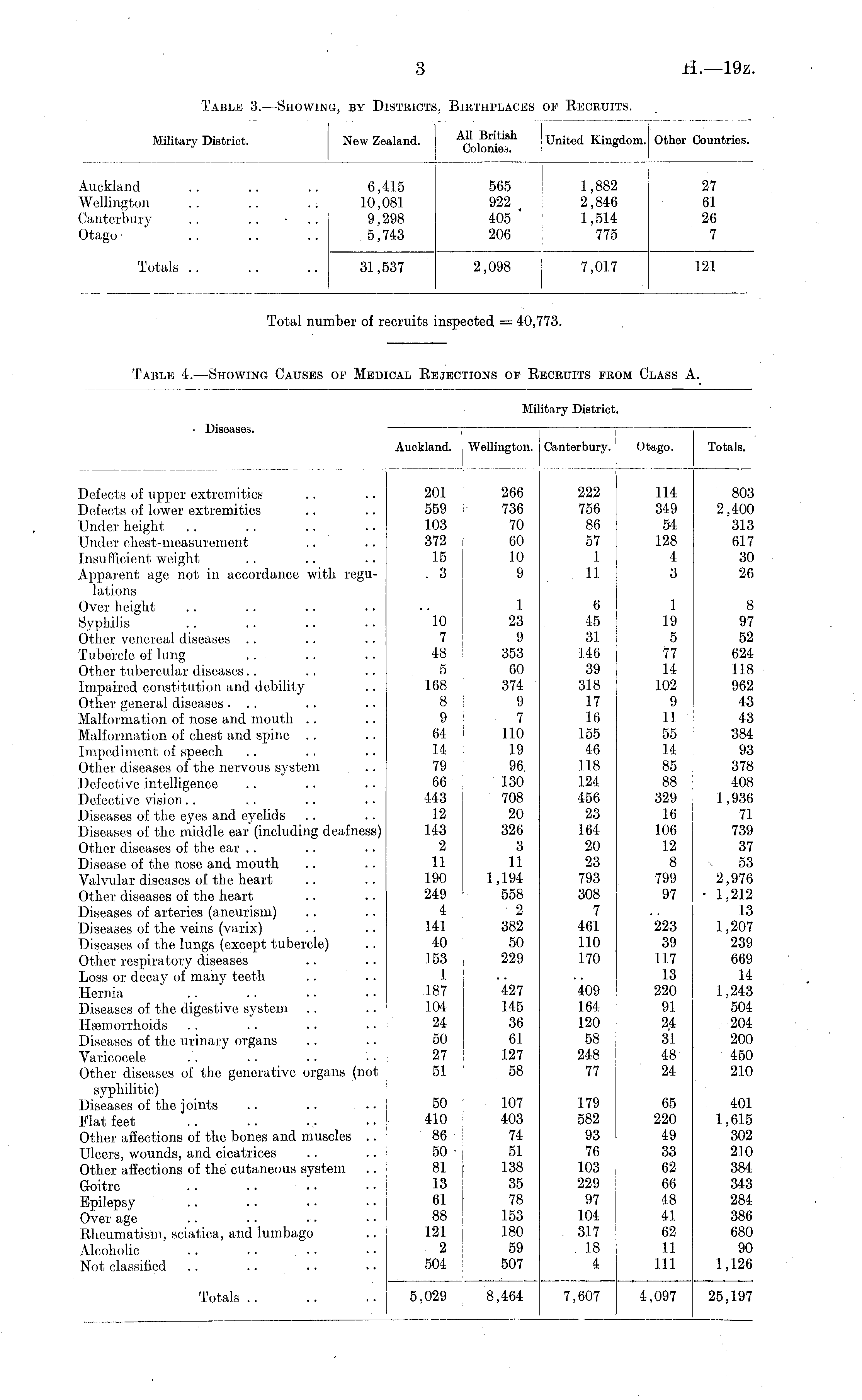 Military District. • Diseases. Auckland. Otago. Totals. Wellington. Canterbury. Defects of upper extremities:' Defects of lower extremities Under height Under chest-measurement Insufficient weight Apparent age not in accordance with regulations Over height Syphilis Other venereal diseases Tubercle of lung Other tubercular diseases Impaired constitution and debility Other general diseases ... Malformation of nose and mouth Malformation of chest and spine Impediment of speech Other diseases of the nervous system Defective intelligence Defective vision Diseases of the eyes and eyelids Diseases of the middle ear (including deafness) Other diseases of the ear Disease of the nose and mouth Valvular diseases of the heart Other diseases of the heart Diseases of arteries (aneurism) Diseases of the veins (varix) Diseases of the lungs (except tubercle) Other respiratory diseases Loss or decay of many teeth Hernia Diseases of the digestive system Haemorrhoids Diseases of the urinary organs Varicocele Other diseases of the generative organs (not syphilitic) Diseases of the joints Flat feet Other affections of the bones and muscles .. Ulcers, wounds, and cicatrices Other affections of the cutaneous system Goitre Epilepsy Over age Rheumatism, sciatica, and lumbago Alcoholic .. .. Not classified 201 559 103 372 15 . 3 10 7 48 5 168 8 9 64 14 79 66 443 12 143 2 11 190 249 4 141 40 153 1 187 104 24 50 27 51 266 736 70 60 10 9 1 23 9 353 60 374 9 7 110 19 96 130 708 20 326 3 11 1,194 558 2 382 50 229 222 756 86 57 1 11 6 45 31 146 39 318 17 16 155 46 118 124 456 23 164 20 23 793 308 7 461 110 170 114 349 54 128 4 3 1 19 5 77 14 102 9 11 55 14 85 88 329 16 106 12 8 799 97 803 2,400 313 617 30 26 8 97 52 624 118 962 43 43 384 93 378 408 1,936 71 739 37 53 2,976 • 1,212 13 1,207 239 669 14 1,243 504 204 200 450 210 427 145 36 61 127 58 409 164 120 58 248 77 223 39 117 13 220 91 24 31 48 24 50 410 86 50 81 13 61 88 121 2 504 107 403 74 51 138 35 78 153 180 59 507 179 582 93 76 103 229 97 104 317 18 4 65 220 49 33 62 66 48 4i. 62 11 111 401 1,615 302 210 384 343 284 386 680 90 1,126 Totals 5,029 8,464 7,607 4,097 25,197