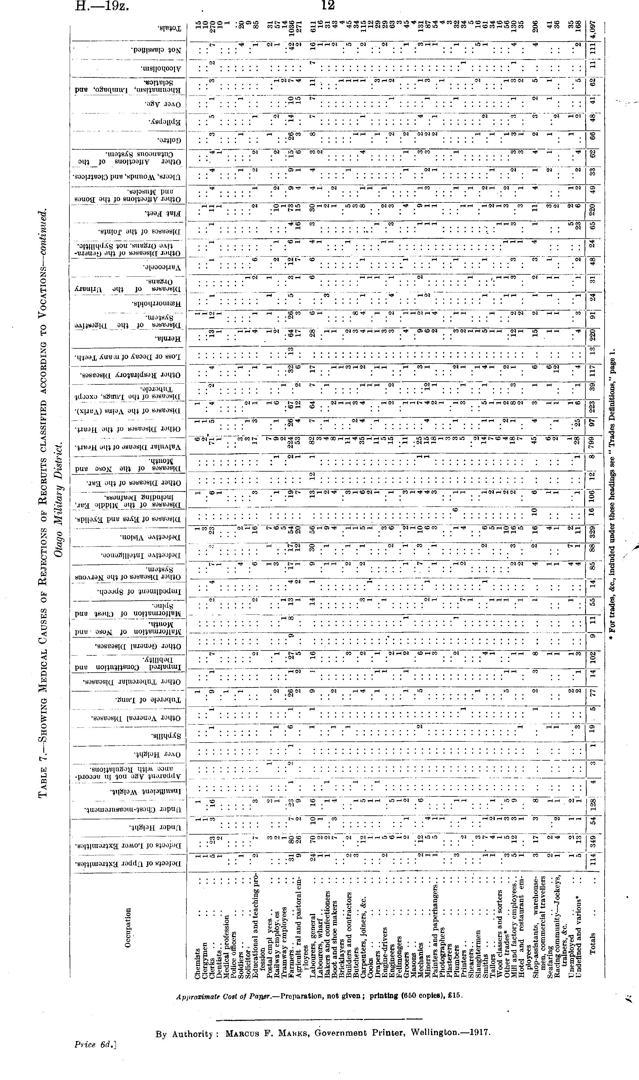 Table 7.—Showing Medical Causes of Rejections of Recruits classified according to Vocations— continued. Otago Military District.