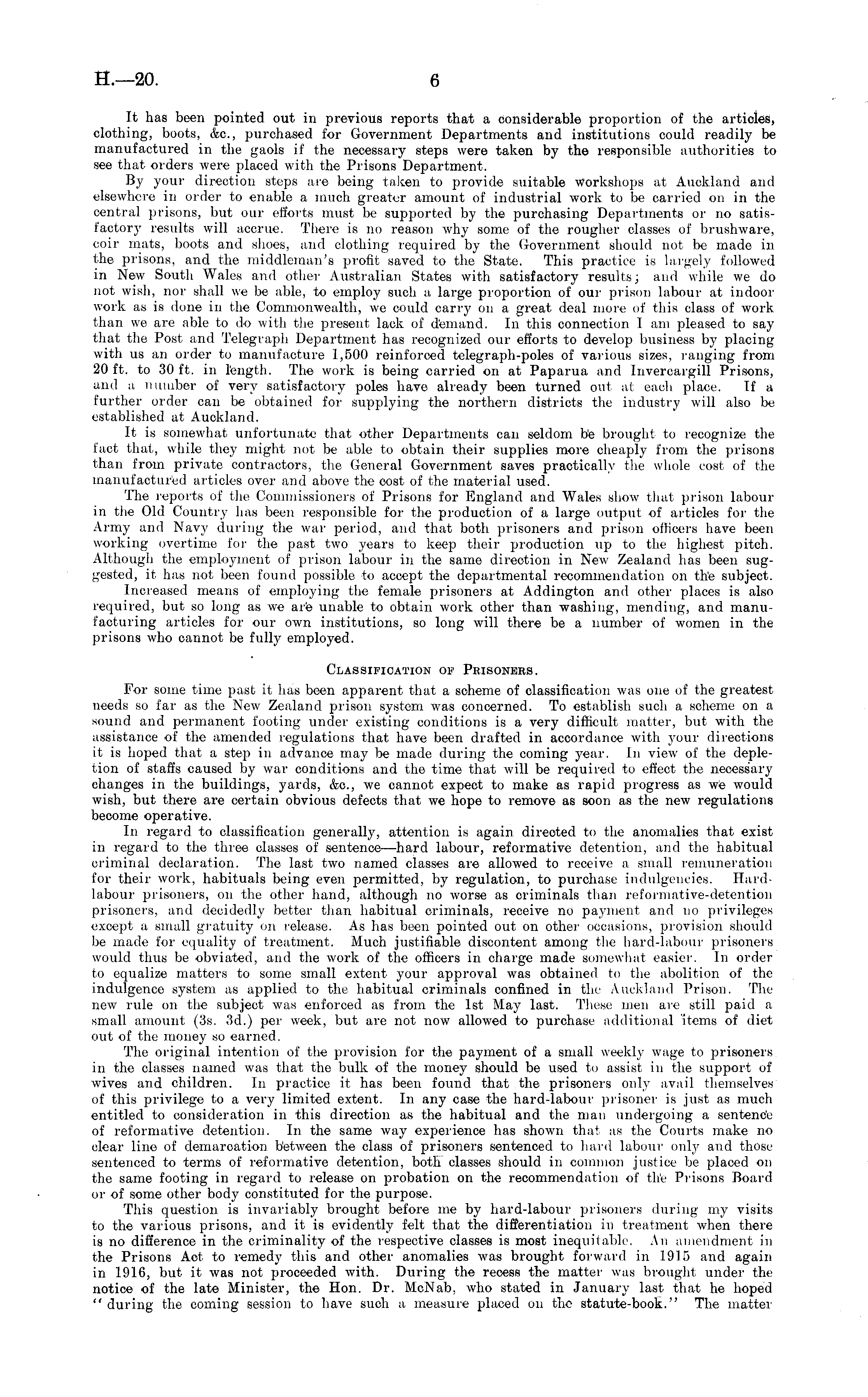 It has been pointed out in previous reports that a considerable proportion of the articles, clothing, boots, &c, purchased for Government Departments and institutions could readily be manufactured in the gaols if the necessary steps were taken by the responsible authorities to see that orders were placed with the Prisons Department. By your direction steps are being taken to provide suitable workshops at Auckland and elsewhere in order to enable a much greater amount of industrial work to be carried on in the central prisons, but our efforts must be supported by the purchasing Departments or no satisfactory results will accrue. There is no reason why some of the rougher classes of brushware, coir mats, boots and shoes, and clothing required by the Government should not be made in the prisons, and the middleman's profit saved to the State. This practice is largely followed in New South Wales and other Australian States with satisfactory results; and while we do not wish, nor shall we be able, to employ such a large proportion of our prison labour at indoor work as is done in the Commonwealth, we could carry on a great deal more of this class of work than we are able to do with the present lack of demand. In this connection I am pleased to say that the Post and Telegraph Department has recognized our efforts to develop business by placing with us an order to manufacture 1,500 reinforced telegraph-poles of various sizes, ranging from 20 ft. to 30 ft. in length. The work is being carried on at Paparua and InvercargiU Prisons, and a number of very satisfactory poles have already been turned out at each place. If a further order can be obtained for supplying the northern districts the industry will also be established at Auckland. It is somewhat unfortunate that other Departments can seldom be brought to recognize the fact that, while they might not be able to obtain their supplies more cheaply from the prisons than from private contractors, the General Government saves practically the whole cost of the manufactured articles over and above the cost of the material used. The reports of the Commissioners of Prisons for England and Wales show that prison labour in the Old Country has been responsible for the production of a large output of articles for the Army and Navy during the war period, and that both prisoners and prison officers have been working overtime for the past two years to keep their production up to the highest pitch. Although the employment of prison labour in the same direction in New Zealand has been suggested, it has not been found possible to accept the departmental recommendation on the subject. Increased means of employing the female prisoners at Addington and other places is also required, but so long as we are unable to obtain work other than washing, mending, and manufacturing articles for our own institutions, so long will there be a number of women in the prisons who cannot be fully employed. Classification of Prisoners. For some time past it has been apparent that a scheme of classification was one of the greatest needs so far as the New Zealand prison system was concerned. To establish such a scheme on a sound and permanent footing under existing conditions is a very difficult matter, but with the assistance of the amended regulations that have been drafted in accordance with your directions it is hoped that a step in advance may be made during the coming year. In view of the depletion of staffs caused by war conditions and the time that will be required to effect the necessary changes in the buildings, yards, &c, we cannot expect to make as rapid progress as we would wish, but there are certain obvious defects that we hope to remove as soon as the new regulations become operative. In regard to classification generally, attention is again directed to the anomalies that exist in regard to the three classes of sentence' —hard labour, reformative detention, and the habitual criminal declaration. The last two named classes are allowed to receive a small remuneration for their work, habituals being even permitted, by regulation, to purchase indulgencies. Hardlabour prisoners, on the other hand, although no worse as criminals than reformative-detention prisoners, and decidedly better than habitual criminals, receive no payment and no privileges except a small gratuity on release. As has been pointed out on other occasions, provision should be made for equality of treatment. Much justifiable discontent among the hard-labour prisoners would thus be obviated, and the work of the officers in charge made somewhat easier. In order to equalize matters to some small extent your approval was obtained to the abolition of the indulgence system as applied to the habitual criminals confined in the Auckland Prison. The new rule on the subject was enforced as from the Ist May last. These men are still paid a small amount (3s. 3d.) per week, but are not now allowed to purchase additional items of diet out of the money so earned. The original intention of the provision for the payment of a small weekly wage to prisoners in the classes named was that the bulk of the money should be used to assist in the support of wives and children. In practice it has been found that the prisoners only avail themselves of this privilege to a very limited extent. In any case the hard-labour prisoner is just as much entitled to consideration in this direction as the habitual and the man undergoing a sentence of reformative detention. In the same way experience has shown that as the Courts make no clear lino of demarcation between the class of prisoners sentenced to hard labour only and those sentenced to terms of reformative detention, both classes should in common justice be placed on the same footing in regard to release on probation on the recommendation of the Prisons Board or of some other body constituted for the purpose. This question is invariably brought before me by hard-labour prisoners during m
