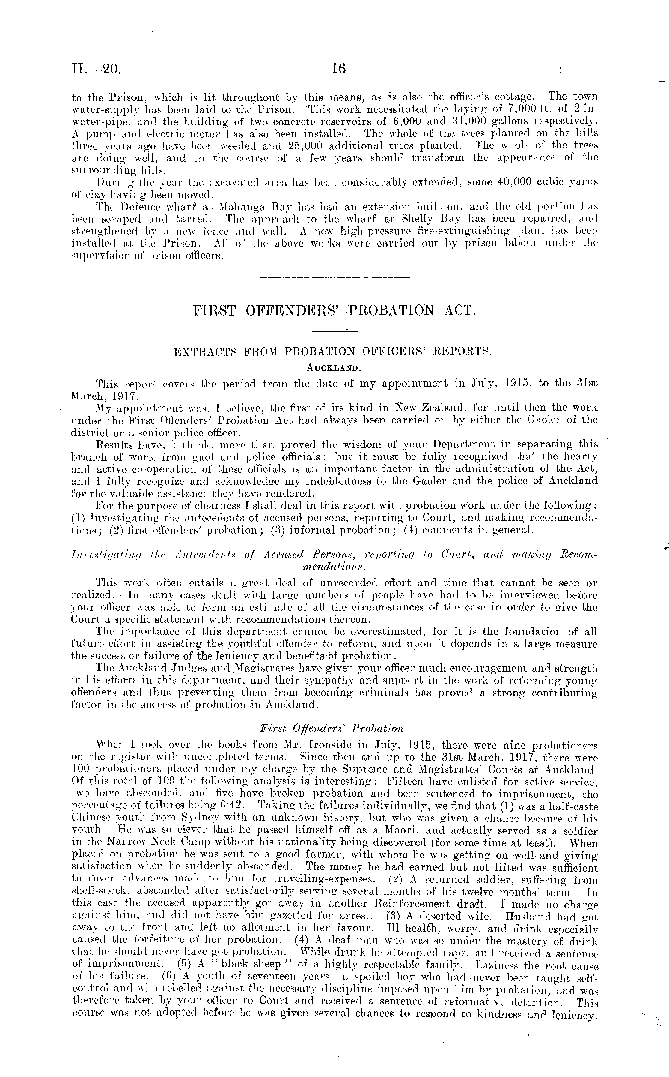 FIRST OFFENDERS' .PROBATION ACT. EXTRACTS FROM PROBATION OFFICERS' REPORTS. Auckland. This report covers the period from the date of my appointment in July, 1915, to the 31st March, 1917. My appointment was, I believe, the first of its kind in New Zealand, for until then the work under the First Offenders' Probation Act had always been carried on by either the Gaoler of the district or a senior police officer. Results have, 1 think, more than proved the wisdom of your Department in separating this branch of work from gaol and police officials; but it must be fully recognized that the hearty and active co-operation of these officials is an important factor in. the administration of the Act, and I fully recognize and acknowledge my indebtedness to the Gaoler and the police of Auckland for the valuable assistance they have rendered. For the purpose of clearness I shall deal in this report with probation work under the following: (1.) Investigating the antecedents of accused persons, reporting to Court, and making recommendations; (2) first offenders' probation; (3) informal probation; (4) comments in general. Inrestigating the Antecedents of Accused Persons, reporting to Court, and, making Recommendations. This work often entails a great deal of unrecorded effort and time that cannot be seen or realized. ■ In many cases dealt with large numbers of people have had to be interviewed before your officer- was able to form an estimate of all the circumstances of the case in order to give the Court, a specific statement with recommendations thereon. The importance of this department cannot be overestimated, for it is the foundation of all future effort in assisting the youthful offender to reform, and upon it depends in a large measure the success or failure of the leniency and benefits of probation. The Auckland Judges and .Magistrates have given your officer much encouragement and strength in his efforts in this department, and their sympathy and support in the work of reforming young offenders and thus preventing them from becoming criminals has proved a, strong contributing factor in the success of probation in A4uckland. First Offenders' Probation. When I took over the books from Mr. Ironside in July, 1915, there were nine probationers on the register with uncompleted terms. Since then and up to the 31st March, 1917, there were 1.00 probationers placed under my charge by the Supreme and Magistrates' Courts at Auckland. Of this total of 109 the following analysis is interesting: Fifteen have enlisted for active service, two have absconded, and five have broken, probation and been sentenced to imprisonment, the percentage of failures being 6*42. Taking the failures individually, we find that (1) was a half-caste Chinese yottth from Sydney with an unknown history, but who was given a chance became of his youth. He was so clever that he passed himself off as a Maori, and actually served as a soldier in the Narrow Neck Camp without his nationality being discovered (for some time at, least). When placed on probation he was sent to a good farmer, with whom he was getting on well and giving satisfaction when, he suddenly absconded. The money he had earned but not lifted was sufficient to Cover advances made to him for travelling-expenses. (2) A returned soldier, suffering from shell-shock, absconded after satisfactorily serving several months of his twelve months' term. In this case the accused apparently got away in another Reinforcement draft. I made no charge against him, and did not have him gazetted for arrest. (3) A deserted wife. Husband had got away to the front and left no allotment in her favour. 11l health, worry, and drink especially caused the forfeiture of her probation. (4) A. deaf man who was so under the mastery of drink that he should never have got probation. While drunk lie attempted rape, and received a sentence of imprisonment. (5) A "black sheep" of a highly respectable family. Laziness the root cause of his failure. (6) A youth of seventeen years—a spoiled boy who had never been taught selfcontrol and who rebelled against, the necessary discipline imposed upon him by probation, and was therefore taken by your officer to Court ami received a sentence of reformative detention. This course was not adopted before he was given several chances to respond to kindness and leniency.