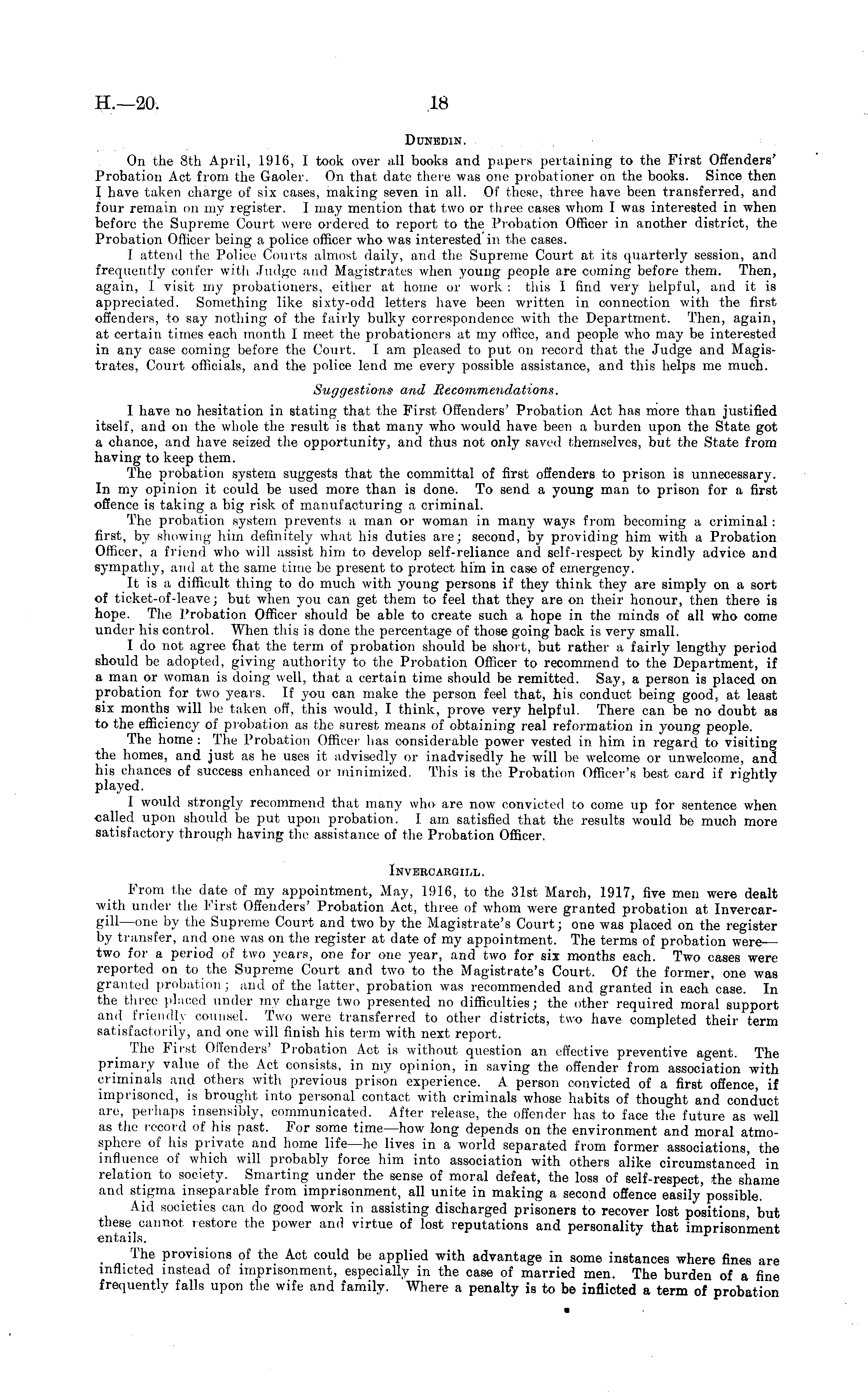 Dunedin. On the Bth April, 1916, I took over all books and papers pertaining to the First Offenders' Probation Act from the Gaoler. On that date there was one probationer on the books. Since then I have taken charge of six cases, making seven in all. Of these, three have been transferred, and four remain on my register. I may mention that two or three cases whom I was interested in when before the Supreme Court were ordered to report to the Probation Officer in another district, the Probation Officer being a police officer who was interested in the cases. I attend the Police Courts almost daily, and the Supreme Court at its quarterly session, and frequently confer with Judge and Magistrates when young people are coming before them. Then, again, I visit my probationers, either at home or work : this I find very helpful, and it is appreciated. Something like sixty-odd letters have been written in connection with the first offenders, to say nothing of the fairly bulky correspondence with the Department. Then, again, at certain times each month I meet the probationers at my office, and people who may be interested in any case coming before the Court. lam pleased to put on record that the Judge and Magistrates, Court officials, and the police lend me every possible assistance, and this helps me much. Suggestions and Recommendations. I have no hesitation in stating that the First Offenders' Probation Act has more than justified itself, and on the whole the result is that many who would have been a burden upon the State got a chance, and have seized the opportunity, and thus not only saved themselves, but the State from having to keep them. The probation system suggests that the committal of first offenders to prison is unnecessary. In my opinion it could be used more than is done. To send a young man to prison for a first offence is taking a big risk of manufacturing a criminal. The probation system prevents a man or woman in many ways from becoming a criminal : first, by showing him definitely what his duties are; second, by providing him with a Probation Officer, a friend who will assist him to develop self-reliance and self-respect by kindly advice and sympathy, and at the same time be present to protect him in case of emergency. It is a difficult thing to do much with young persons if they think they are simply on a sort of ticket-of-leave; but when you can get them to feel that they are on their honour, then there is hope. The Probation Officer should be able to create such a hope in the minds of all who come under his control. When this is done the percentage of those going back is very small. I do not agree that the term of probation should be short, but rather a fairly lengthy period should be adopted, giving authority to the Probation Officer to recommend to the Department, if a man or woman is doing well, that a certain time should be remitted. Say, a person is placed on probation for two years. If you can make the person feel that, his conduct being good, at least six months will be taken off, this would, I think, prove very helpful. There can be no doubt as to the efficiency of probation as the surest means of obtaining real reformation in young people. The home : The Probation Officer has considerable power vested in him in regard to visiting the homes, and just as he uses it advisedly or inadvisedly he will be welcome or unwelcome, and his chances of success enhanced or minimized. This is the Probation Officer's best card if rightly played. I would strongly recommend that many who are now convicted to come up for sentence when called upon should be put upon probation. I am satisfied that the results would be much more satisfactory through having the assistance of the Probation Officer. Inveroargill. From the date of my appointment, May, 1916, to the 31st March, 1917, five men were dealt with under the First Offenders' Probation Act, three of whom were granted probation at InvercargiU—one by the Supreme Court and two by the Magistrate's Court; one was placed on the register by transfer, and one was on the register at date of my appointment. The terms of probation were— two for a period of two years, one for one year, and two for six months each. Two cases were reported on to the Supreme Court and two to the Magistrate's Court. Of the former, one was granted probation ; and of the latter, probation was recommended and granted in each case. In the three placed under my charge two presented no difficulties; the other required moral support and friendly counsel. Two were transferred to other districts, two have completed their term satisfactorily, and one will finish his term with next report. The First Offenders' Probation Act is without question an effective preventive agent. The primary value of the Act consists, in my opinion, in saving the offender from association with crimmals and others with previous prison experience. A person convicted of a first offence, if imprisoned, is brought into personal contact with criminals whose habits of thought and conduct are, perhaps insensibly, communicated. After release, the offender has to face the future as well as the record of his past. For some time—how long depends on the environment and moral atmosphere of his private and home life—he lives in a world separated from former associations, the influence of which will probably force him into association with others alike circumstanced in relation to society. Smarting under the sense of moral defeat, the loss of self-respect, the shame and stigma inseparable from imprisonment, all unite in making a second offence easily' possible. Aid societies can do good work in assisting discharged prisoners to recover lost positions, but these cannot restore the power and virtue of lost reputations and personality that imprisonment entails. The provisions of the Act could be applied with advantage in some instances where fines are inflicted instead of imprisonment, especially in the case of ma
