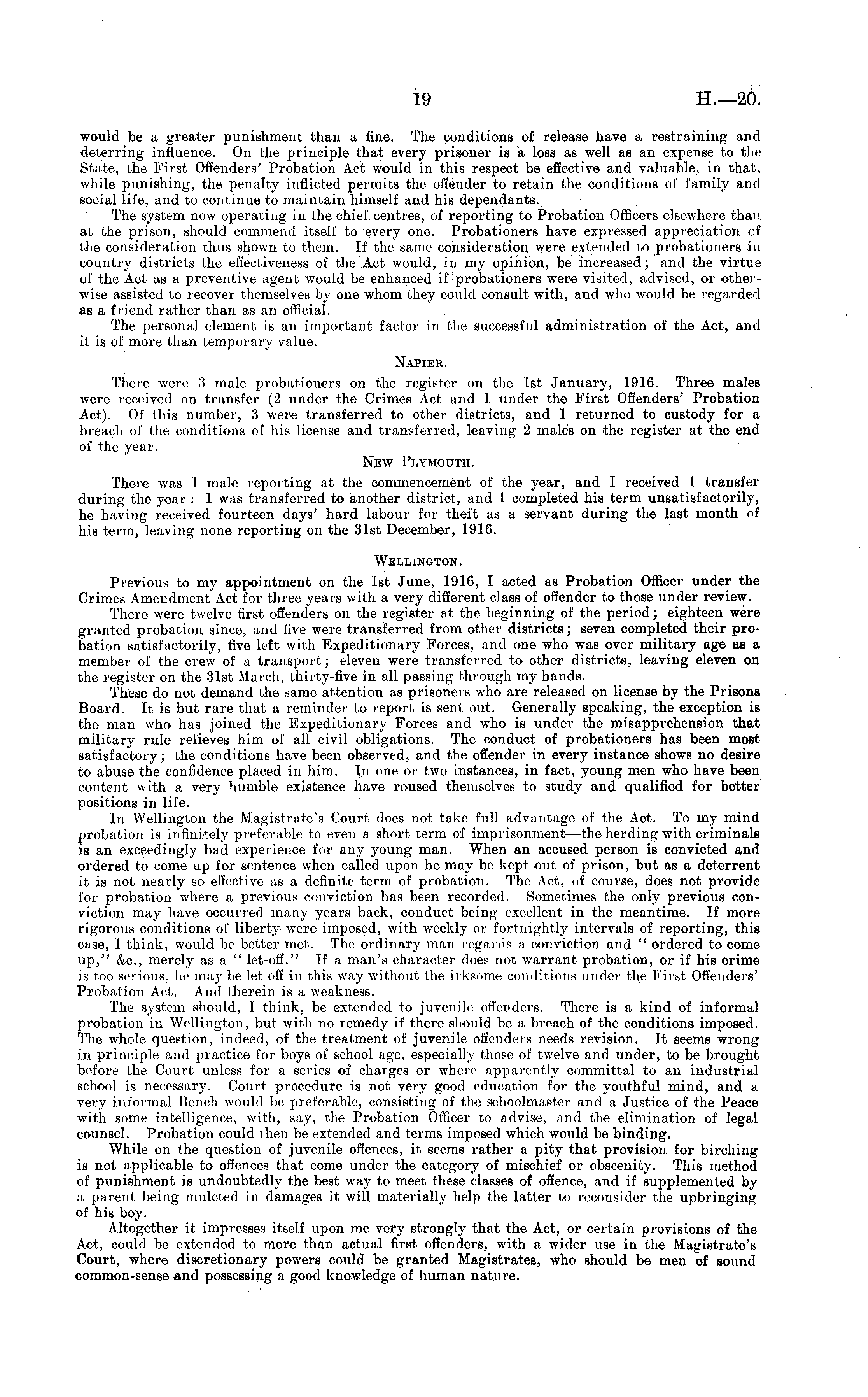 would be a greater punishment than a fine. The conditions of release have a restraining and deterring influence. On the principle that every prisoner is a loss as well as an expense to the State, the First Offenders' Probation Act would in this respect be effective and valuable, in that, while punishing, the penalty inflicted permits the offender to retain the conditions of family and social life, and to continue to maintain himself and his dependants. The system now operating in the chief centres, of reporting to Probation Officers elsewhere than at the prison, should commend itself to every one. Probationers have expressed appreciation of the consideration thus shown to them. If the same consideration were extended to probationers in country districts the effectiveness of the Act would, in my opinion, be increased; and the virtue of the Act as a preventive agent would be enhanced if probationers were visited, advised, or otherwise assisted to recover themselves by one whom they could consult with, and who would be regarded as a friend rather than as an official. The personal clement is an important factor in the successful administration of the Act, and it is of more than temporary value. Napier. There were 3 male probationers on the register on the Ist January, 1916. Three males were received on transfer (2 under the Crimes Act and 1 under the First Offenders' Probation Act). Of this number, 3 were transferred to other districts, and 1 returned to custody for a breach of the conditions of his license and transferred, leaving 2 male's on the register at the end of the year. New Plymouth. There was 1 male reporting at the commencement of the year, and I received 1 transfer during the year : 1 was transferred to another district, and 1 completed his term unsatisfactorily, he having received fourteen days' hard labour for theft as a servant during the last month of his term, leaving none reporting on the 31st December, 1916. Wellington. Previous to my appointment on the Ist June, 1916, I acted as Probation Officer under the Crimes Amendment Act for three years with a very different class of offender to those under review. There were twelve first offenders on the register at the beginning of the period; eighteen were granted probation since, and five were transferred from other districts; seven completed their probation satisfactorily, five left with Expeditionary Forces, and one who was over military age as a member of the crew of a transport; eleven were transferred to other districts, leaving eleven on the register on the 31st March, thirty-five in all passing through my hands. These do not demand the same attention as prisoners who are released on license by the Prisons Board. It is but rare that a reminder to report is sent out. Generally speaking, the exception is the man who has joined the Expeditionary Forces and who is under the misapprehension that military rule relieves him of all civil obligations. The conduct of probationers has been moßt satisfactory; the conditions have been observed, and the offender in every instance shows no desire to abuse the confidence placed in him. In one or two instances, in fact, young men who have been content with a very humble existence have roused themselves to study and qualified for better positions in life. In Wellington the Magistrate's Court does not take full advantage of the Act. To my mind probation is infinitely preferable to even a short term of imprisonment—the herding with criminals is an exceedingly bad experience for any young man. When an accused person is convicted and ordered to come up for sentence when called upon he may be kept out of prison, but as a deterrent it is not nearly so effective as a definite term of probation. The Act, of course, does not provide for probation where a previous conviction has been recorded. Sometimes the only previous conviction may have occurred many years back, conduct being excellent in the meantime. If more rigorous conditions of liberty were imposed, with weekly or fortnightly intervals of reporting, this case, I think, would be better met. The ordinary man regards a conviction and " ordered to come up," &c, merely as a " let-off." If a man's character does not warrant probation, or if his crime is too serious, he may be let off in this way without the irksome conditions under the First Offenders' Probation Act. And therein is a weakness. The system should, I think, be extended to juvenile offenders. There is a kind of informal probation in Wellington, but with no remedy if there should be a breach of the conditions imposed. The whole question, indeed, of the treatment of juvenile offenders needs revision. It seems wrong in principle and practice for boys of school age, especially those of twelve and under, to be brought before the Court unless for a series of charges or where apparently committal to an industrial school is necessary. Court procedure is not very good education for the youthful mind, and a very informal Bench would be preferable, consisting of the schoolmaster and a Justice of the Peace with some intelligence, with, say, the Probation Officer to advise, and the elimination of legal counsel. Probation could then be extended and terms imposed which would be binding. While on the question of juvenile offences, it seems rather a pity that provision for birching is not applicable to offences that come under the category of mischief or obscenity. This method of punishment is undoubtedly the best way to meet these classes of offence, and if supplemented by a parent being mulcted in damages it will materially help the latter to reconsider the upbringing of his boy. Altogether it impresses itself upon me very strongly that the Act, or certain provisions of the Act, could be extended to more than actual first offenders, with a wider use in the Magistrate's Court, where discretionary powers could be granted Magistrates, who should be men of sound common-sense and possessing a good kn