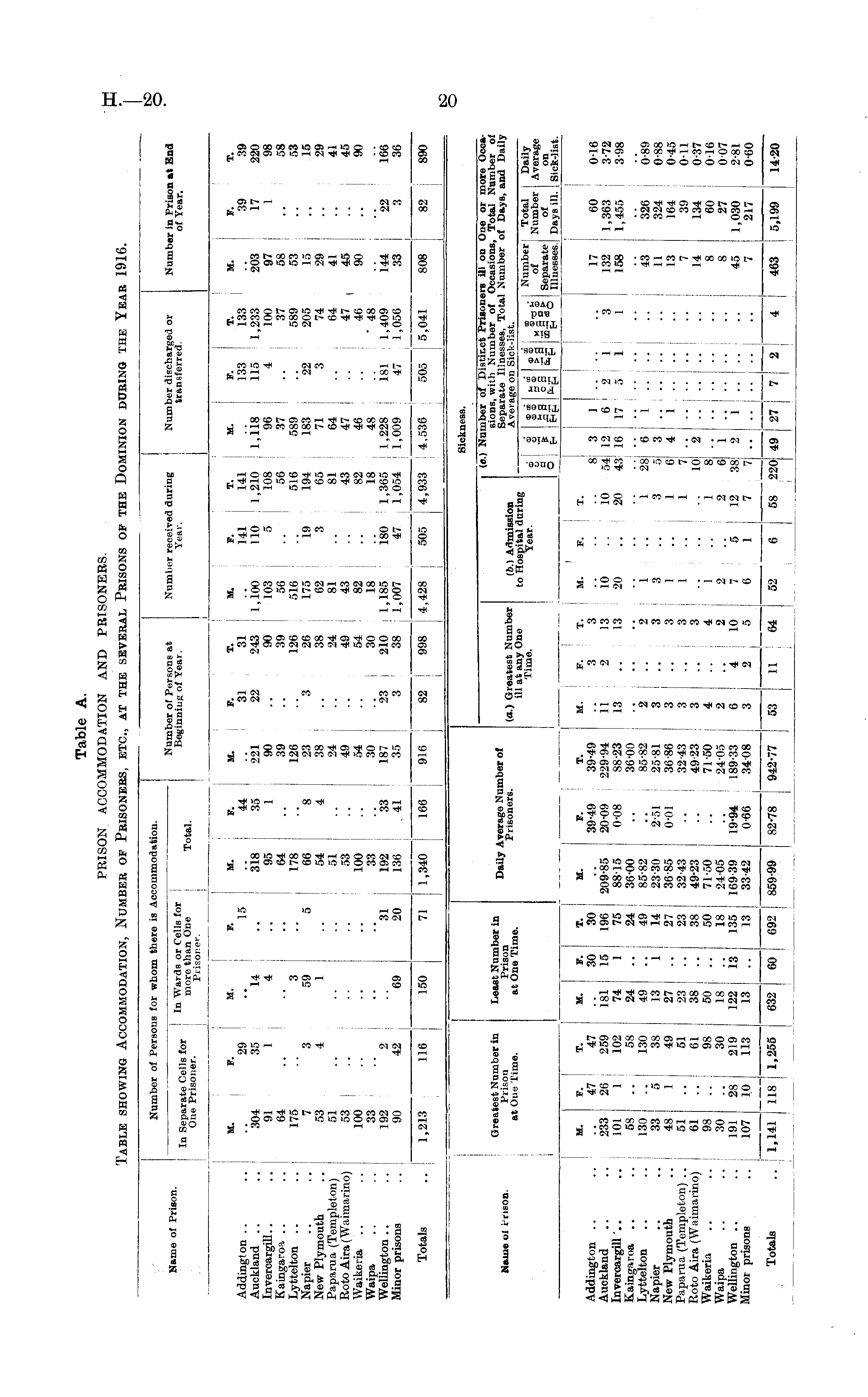 Table A. PRISON ACCOMMODATION AND PRISONERS. Table showing Accommodation, Number of Prisoners, etc., at the several Prisons of the Dominion during the Year 1916.