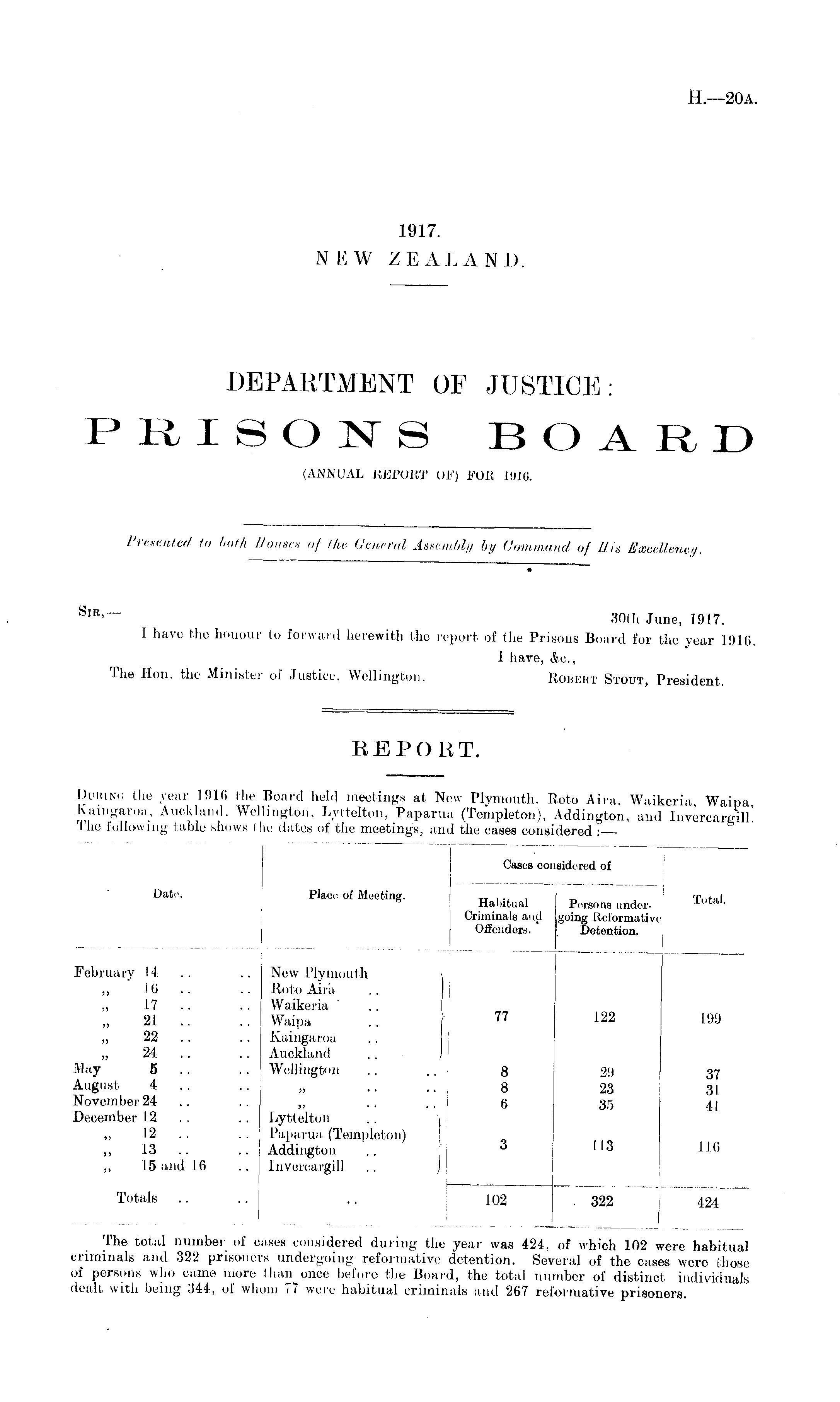 Sm,— 30th June, 1917. I have the honour to forward herewith the report of (he Prisons Board for the year 191G, 1 have, (fee, The Hon. the Minister of Justice, Wellington. Robert Stout, President.