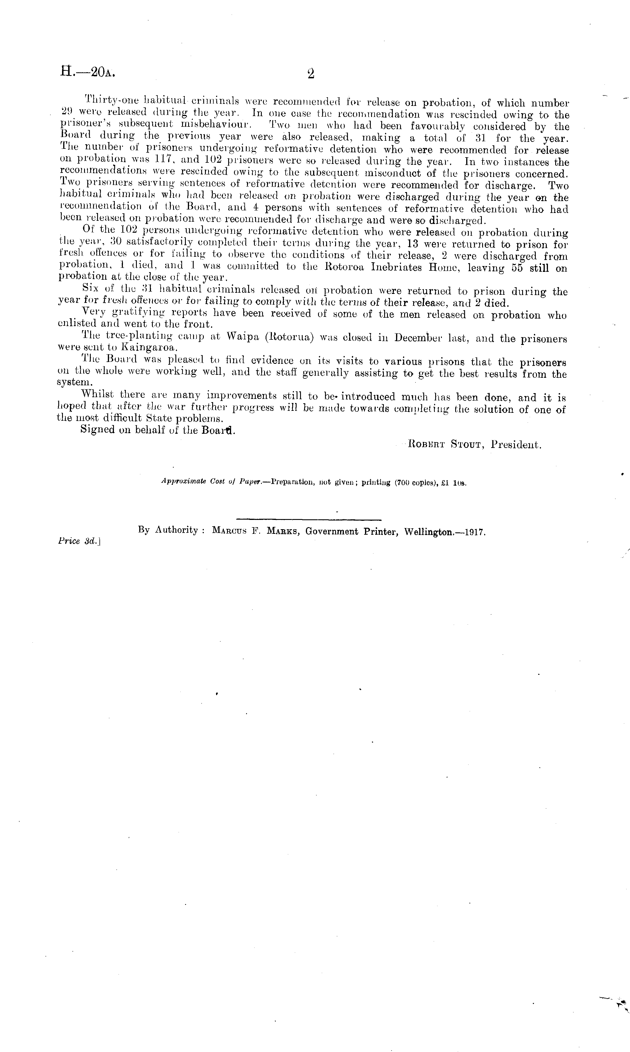 Thirty-one habitual criminals were recommended for release on probation, of which number 29 were released during the year. In one case the recommendation was rescinded owing to the prisoner's subsequent misbehaviour. Two men who had been favourably considered by the Board during the previous year were also released, making a total of 31 for the year. The number of prisoners undergoing reformative detention who were recommended for release on probation_was 11.7, and 102 prisoners were so released during the year. In two instances the recommendations were rescinded owing to the subsequent misconduct of the prisoners concerned. Two prisoners serving sentences of reformative detention were recommended for discharge. Two habitual criminals who had been released on probation were discharged during the year on the recommendation of Board, and 4 persons with sentences of reformative detention who had been released on probation were recommended for discharge and were so discharged. Ol' the 102 persons undergoing reformative detention who were released on probation during the year, .'SO satisfactorily completed their terms during the year, 13 were returned to prison for fresh offences or for failing to observe the conditions of their release, 2 were discharged from probation, 1 died, and 1 was committed to the Rotoroa Inebriates Home, leaving 55 still on probation at the close of the year. Six of the 31 habitual criminals released on probation were returned to prison during the year for fresh offences or for failing to comply with the terms of their release, and 2 died. Very gratifying reports have been received of some of the men released on probation who enlisted and went to the front. The tree-planting camp at Waipa (Rotorua) was closed in December last, and the prisoners were sent to Kaingaroa. The Boa id was pleased to find evidence on its visits to various prisons that the prisoners on the whole were working well, and the staff generally assisting to get the best results from the system. Whilst there are many improvements still to be- introduced much has been done, and it is hoped that after the war further progress will be made towards completing the solution of one of the most difficult State problems. Signed on behalf of the Board. Robert Stout, President.