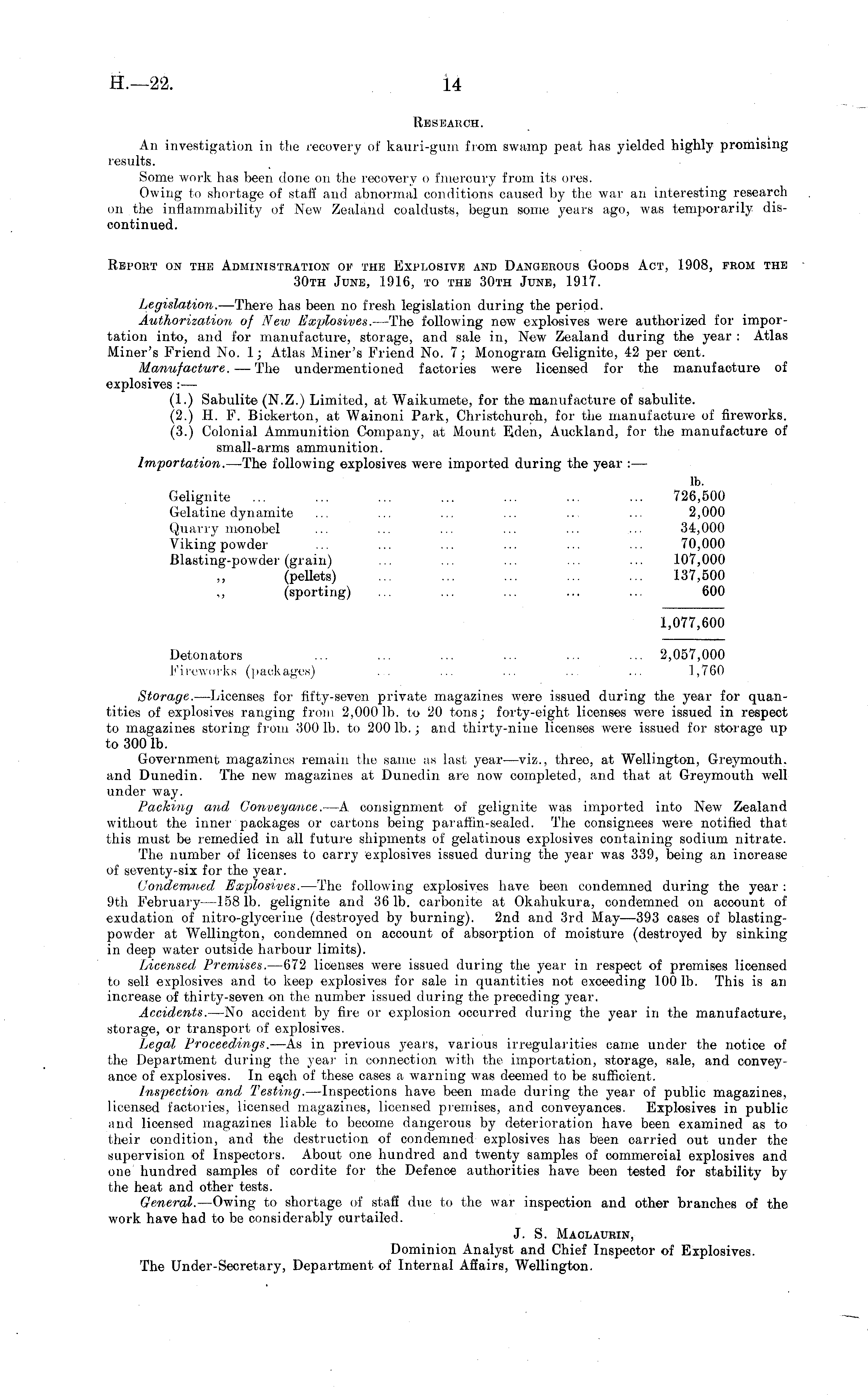 Research. An investigation in the recovery of kauri-gum from swamp peat has yielded highly promising results. Some work has been done on the recovery o fmercury from its ores. Owing to shortage of staff and abnormal conditions caused by the war an interesting research on the inflammability of New Zealand coaldusts, begun some years ago, was temporarily discontinued. Report on the Administration of the Explosive and Dangerous Goods Act, 1908, from the 30th June, 1916, to the 30th June, 1917. Legislation. —There has been no fresh legislation during the period. Authorization of New Explosives. —The following new explosives were authorized for importation into, and for manufacture, storage, and sale in, New Zealand during the year : Atlas Miner's Friend No. 1; Atlas Miner's Friend No. 7; Monogram Gelignite, 42 per cent. Manufacture. — The undermentioned factories were licensed for the manufacture of explosives :— (1.) Sabulite (N.Z.) Limited, at Waikumete, for the manufacture of sabulite. (2.) H. F. Biokerton, at Wainoni Park, Christchurch, for the manufacture of fireworks. (3.) Colonial Ammunition Company, at Mount Eden, Auckland, for the manufacture of small-arms ammunition. Importation. —The following explosives were imported during the year : — lb. Gelignite ... ... ... ... ... ... ... 726,500 Gelatine dynamite ... ... ... ... .., ... 2,000 Quarry monobel ... ... ... ... ... ... 34,000 Viking powder ... ... ... ... ... ... 70,000 Blasting-powder (grain) ... ... ... ... ... 107,000 (pellets) ... ... ... ... ... 137,500 ~ (sporting) ... ... ... ... ... 600 1,077,600 Detonators ... ... ... ... ~. ... 2,057,000 Fireworks (packages) ... ... ... .. ... 1,760 Storage. —Licenses for fifty-seven private magazines were issued during the year for quantities of explosives ranging from 2,0001b. to 20 tons; forty-eight licenses were issued in respect to magazines storing from 300 lb. to 200 lb.; and thirty-nine licenses were issued for storage up to 300 lb. Government magazines remain the same as last year—viz., three, at Wellington, Greymouth. and Dunedin. The new magazines at Dunedin. are now completed, and that at Greymouth well under way. Packing and Conveyance. —A consignment of gelignite was imported into New Zealand without the inner packages or cartons being paraffin-sealed. The consignees were notified that this must be remedied in all future shipments of gelatinous explosives containing sodium nitrate. The number of licenses to carry explosives issued during the year was 339, being an increase of seventy-six for the year. Condemned Explosives. —The following explosives have been condemned during the year : 9th February —1581b. gelignite and 361b. carbonite at Okahukura, condemned on account of exudation of nitro-glycerine (destroyed by burning). 2nd and 3rd May —393 cases of blastingpowder at Wellington, condemned on account of absorption of moisture (destroyed by sinking in deep water outside harbour limits). Licensed Premises. —672 licenses were issued during the year in respect of premises licensed to sell explosives and to keep explosives for sale in quantities not exceeding 100 lb. This is an increase of thirty-seven on the number issued during the preceding year. Accidents. —No accident by fire or explosion occurred during the year in the manufacture, storage, or transport of explosives. Legal Proceedings. —As in previous years, various irregularities came under the notice of the Department during the year in connection with the importation, storage, sale, and conveyance of explosives. In eq,ch of these cases a warning was deemed to be sufficient. Inspection and Testing. —lnspections have been made during the year of public magazines, licensed factories, licensed magazines, licensed premises, and conveyances. Explosives in public and licensed magazines liable to become dangerous by deterioration have been examined as to their condition, and the destruction of condemned explosives has been carried out under the supervision of Inspectors. About one hundred and twenty samples of commercial explosives and one hundred samples of cordite for the Defence authorities have been tested for stability by the heat and other tests. General. —Owing to shortage of staff due to the war inspection and other branches of the work have had to be considerably curtailed. J. S. Maclaurin, Dominion Analyst and Chief Inspector of Explosives. The Under-Secretary, Department of Internal Affairs, Wellington.