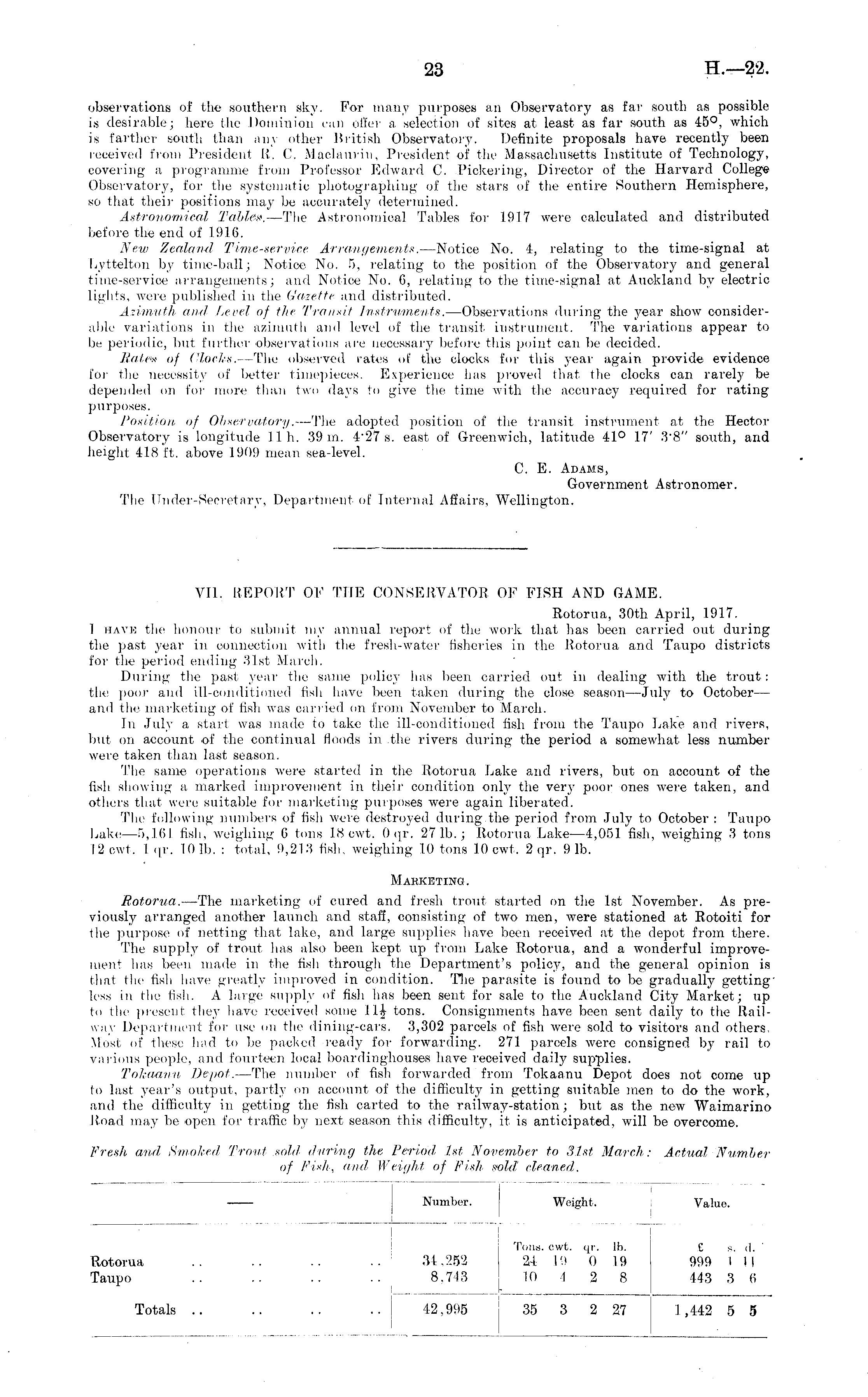 VII. REPORT OK THE CONSERVATOR OF FISH AND GAME. Rotorua, 30th April, 1917. 1 havi. the honour to submit my annual report of the work that has been carried out during the past year in connection with the fresh-water fisheries in the Rotorua and Taupo districts for the period ending 31st March. During the past year the same policy has been carried out in dealing with the trout : tin: poor and ill-conditioned fish have been taken during the close season —July to October — and the marketing of fish was carried on from November to March. In July a start was made to take the ill-conditioned fish from the Taupo Lake and rivers, but on account of the continual Hoods in the rivers during the period a somewhat less number were taken than last season. Tlie same operations were started in the Rotorua Lake and rivers, but on account of the fish showing a marked improvement in their condition only the very poor ones were taken, and others that were suitable for marketing purposes were again liberated. The following numbers of fish were destroyed during.the period from July to October : Taupo Lake—s,l6l fish, weighing 6 tons 18 cwt. 0 qr. 271b.; Rotorua Lake —4,051 fish, weighing 3 tons 12 cwt. 1 cp-. 10 Ib. : total, 9,213 fish, weighing 10 tons 10 cwt, 2 qr. 91b. Marketing. Rotorua. —The marketing of cured and fresh trout started on the Ist November. As previously arranged another launch and staff, consisting of two men, were stationed at Rotoiti for the purpose of netting that lake, and large supplies have been received at the depot from there. The supply of trout has also been kept up from Lake Rotorua, and a wonderful improvement has been made in the fish through the Department's policy, and the general opinion is thnl the fish have greatly improved in condition. Tlie parasite is found to be gradually getting' less in the fish. A large supply of fish has been sent for sale to the Auckland City Market; up to the present they have received some 11£ tons. Consignments have been sent daily to the Rail way Department for use on the dining-cars. 3,302 parcels of fish were sold to visitors and others. Most of these had to be packed ready for forwarding. 271 parcels were consigned by rail to various people, and fourteen local boarding-houses have received daily supplies. Tokaanu Depot. —The number of fish forwarded from Tokaanu Depot does not come up to last year's output, partly on account of the difficulty in getting suitable men to do the work, and the difficulty in getting the fish carted to the railway-station; but as the new Waimarino Road may be open for traffic by next season this difficulty, it is anticipated, will be overcome.